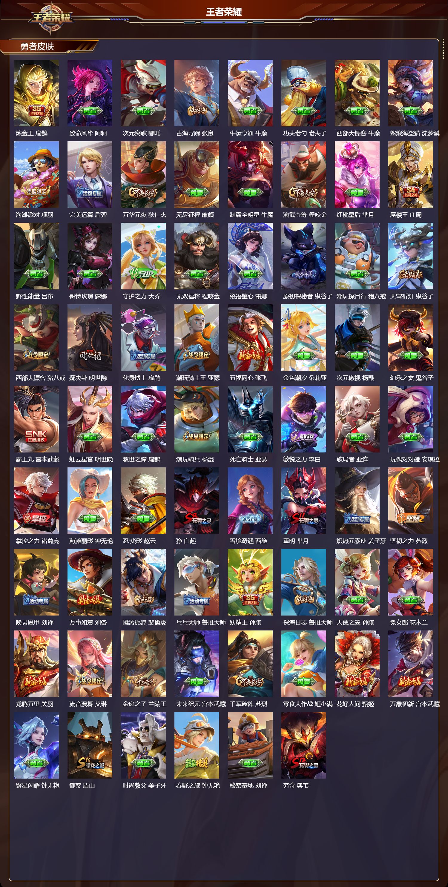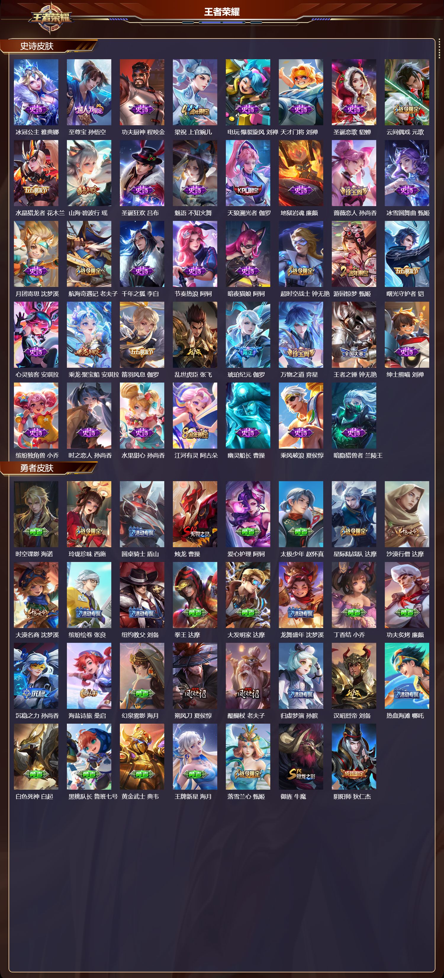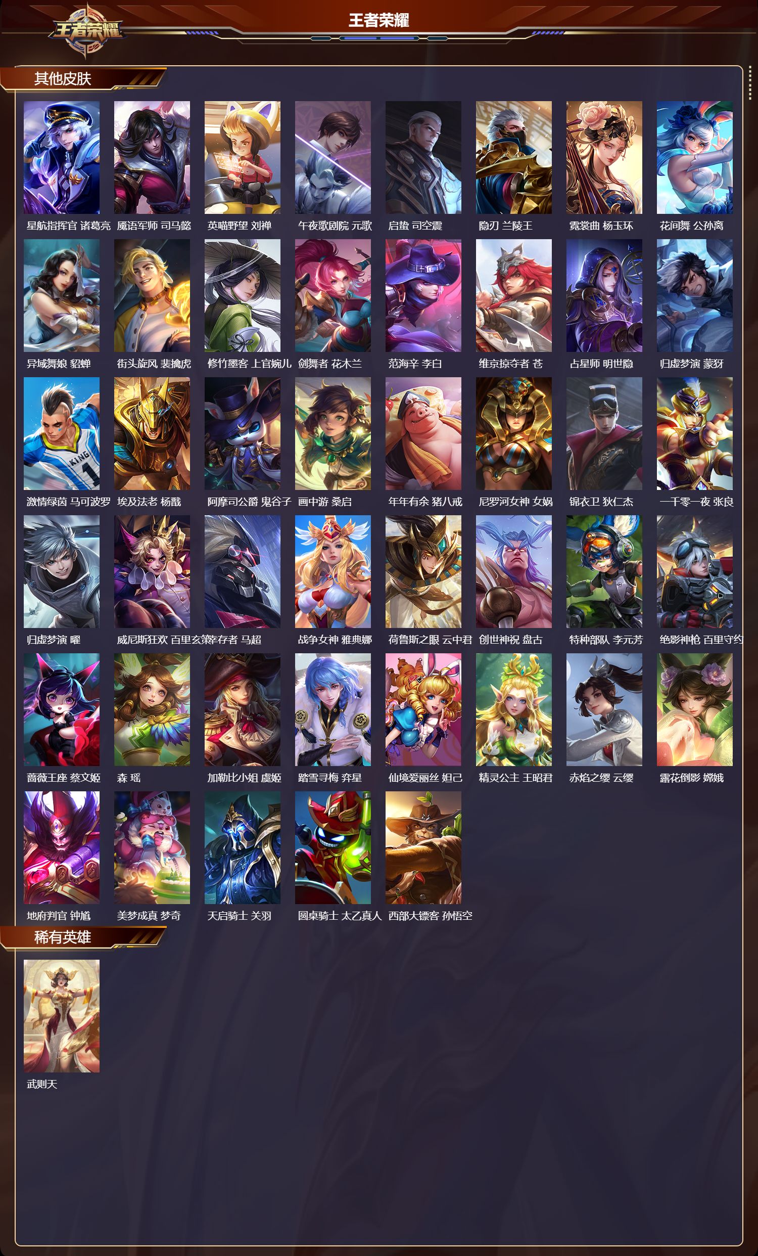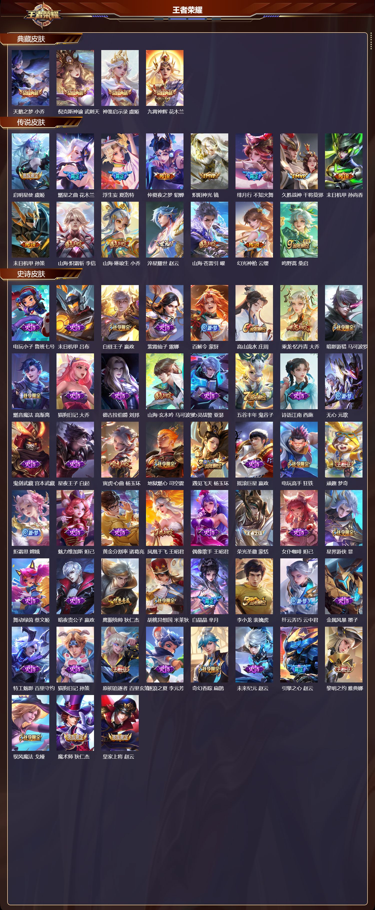 安卓qq/尊贵铂金/325皮肤/128英雄/4典藏/0珍品无双/0无双/0珍品传说/15传说/90史诗/10稀有英雄【4 典藏皮肤】天鹅之梦 小乔倪克斯神谕 武则天神鉴启示录 虞姬九霄神辉 花木兰【15 传说皮肤】启明星使 虞姬燃星之曲 花木兰浮生妄 夏洛特仲夏夜之梦 貂蝉炽阳神光 镜绯月行 不知火舞久胜战神 干将莫邪末日机甲 孙尚香末日机甲 孙策山海·炽霜斩 李信山海