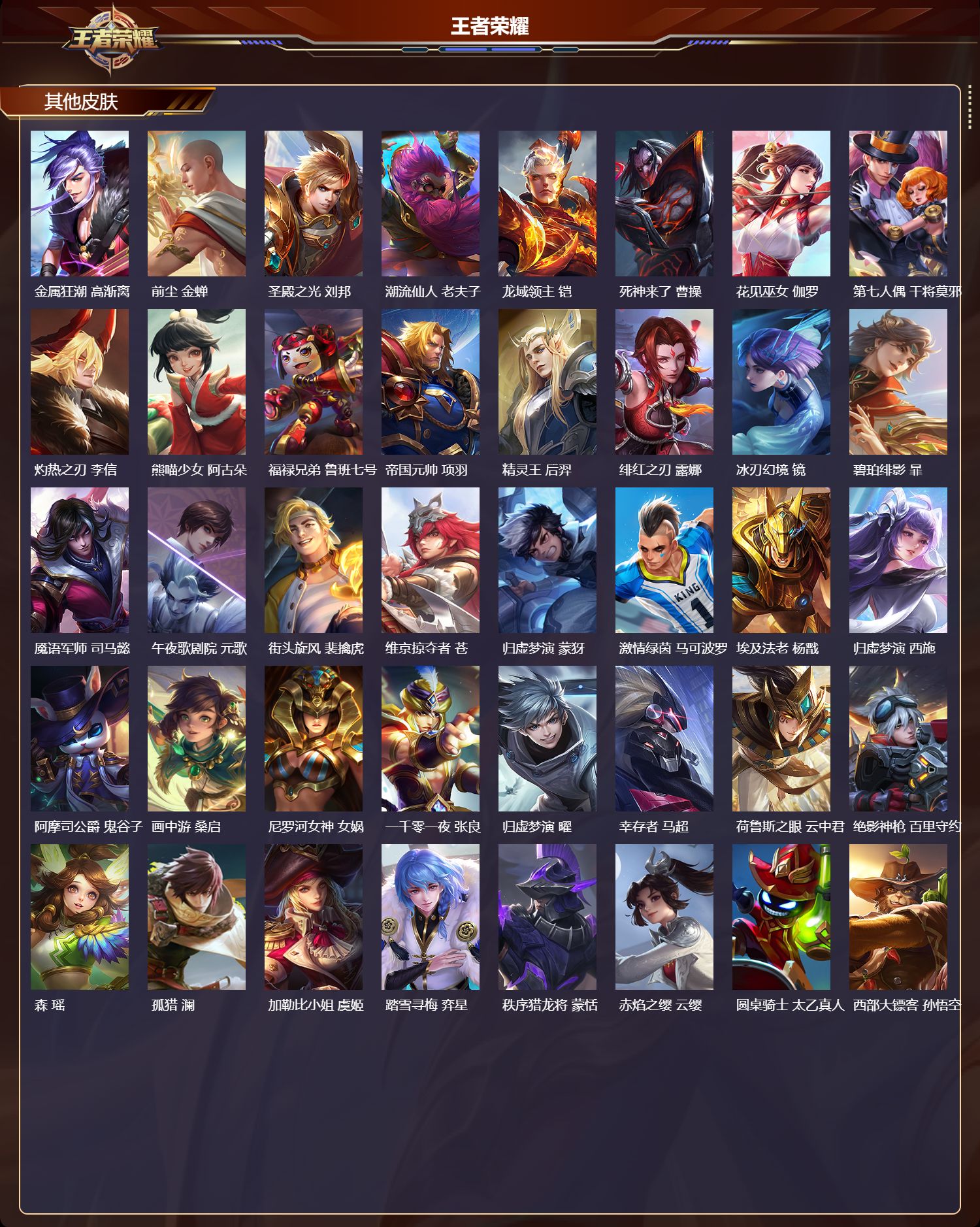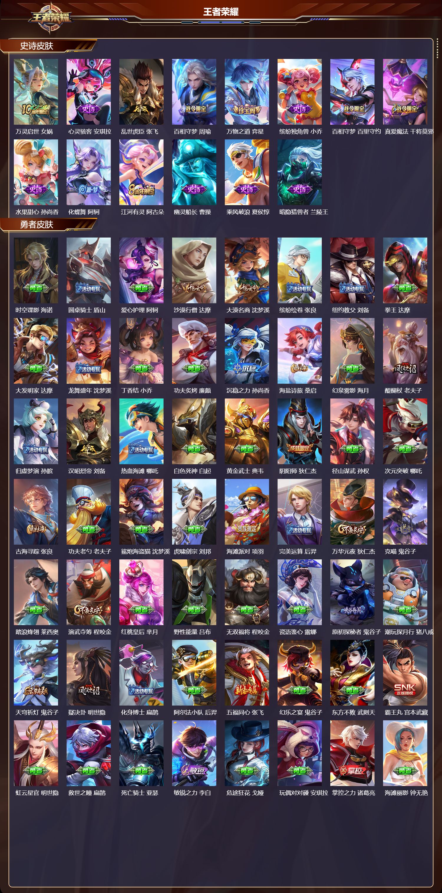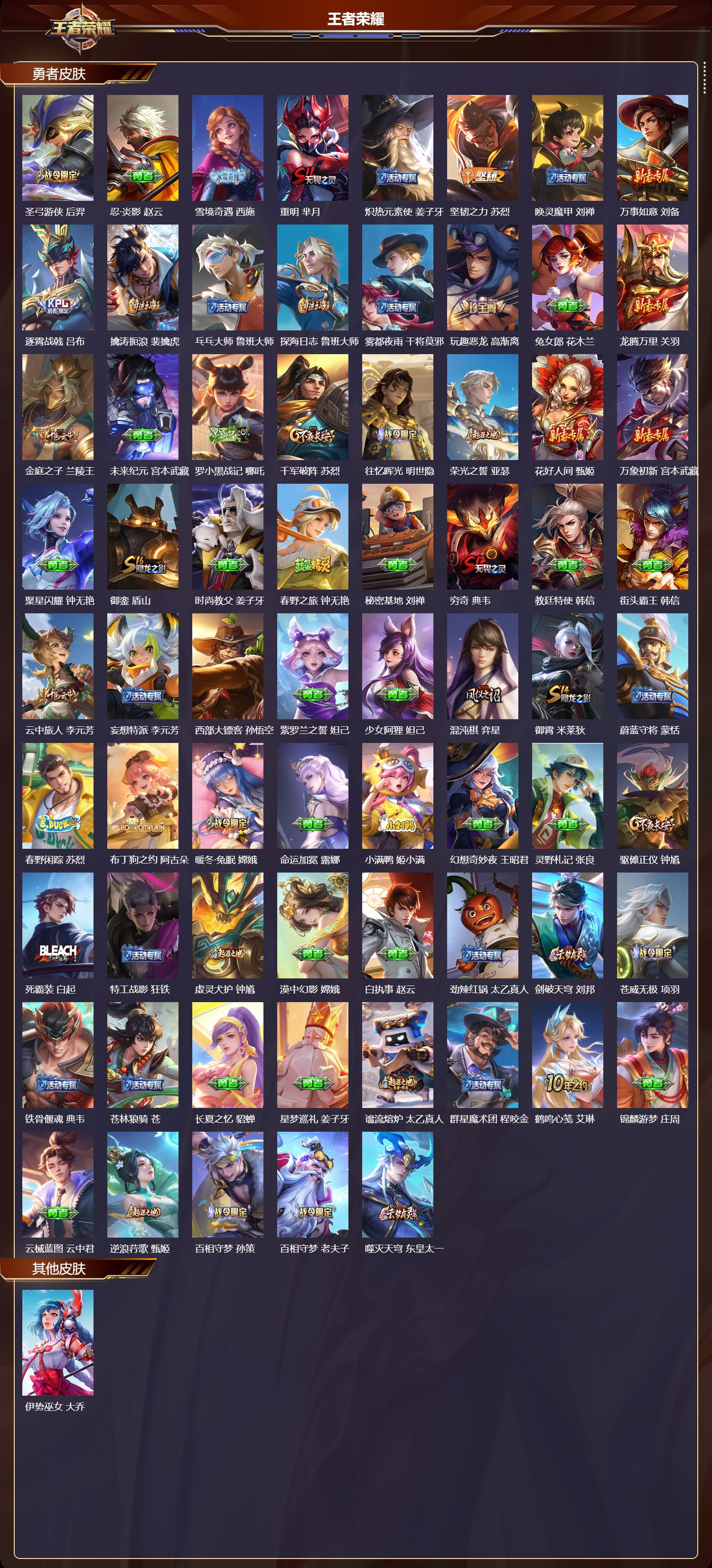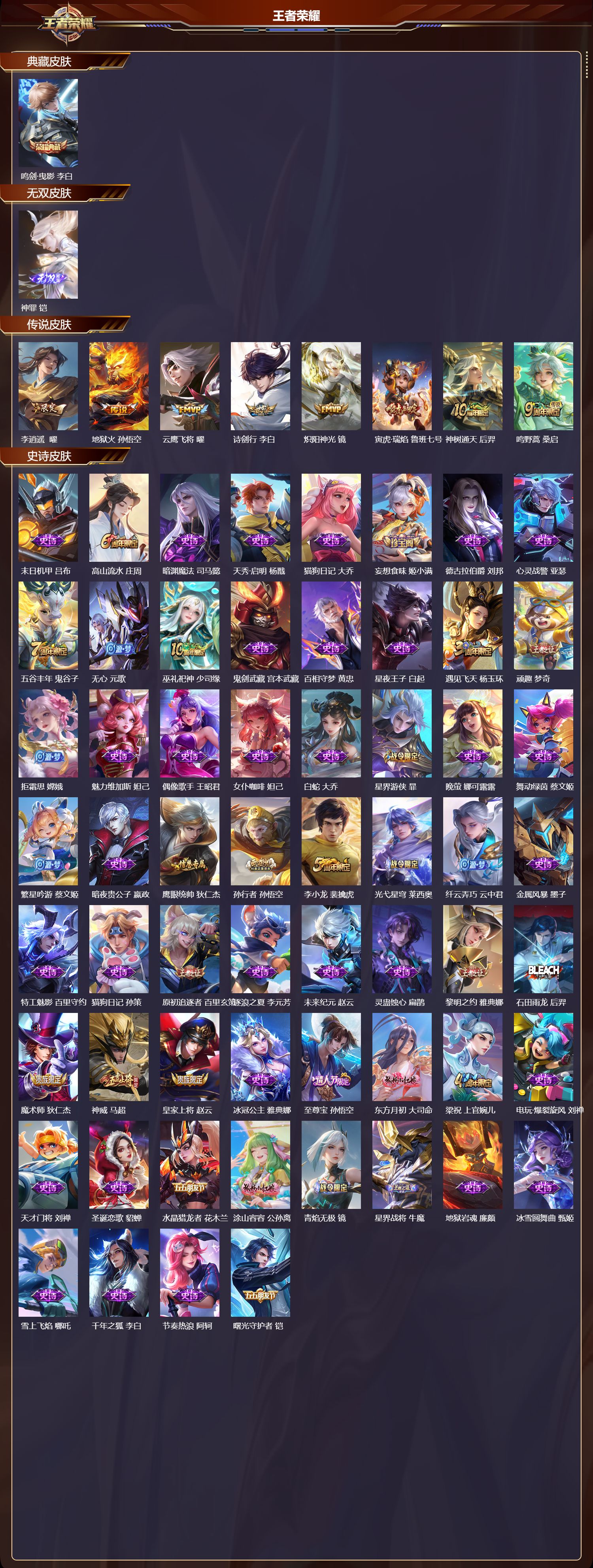 安卓qq/无双王者/250皮肤/126英雄/1典藏/0珍品无双/1无双/0珍品传说/8传说/74史诗/8稀有英雄【1 典藏皮肤】鸣剑·曳影 李白【1 无双皮肤】神罪 铠【8 传说皮肤】李 曜地狱火 孙悟空云鹰飞将 曜诗剑行 李白炽阳神光 镜寅虎·瑞焰 鲁班七号神树通天 后羿鸣野蒿 桑启【74 史诗皮肤】末日机甲 吕布高山流水 庄周暗渊魔法 司马懿天秀·启明 杨戬猫