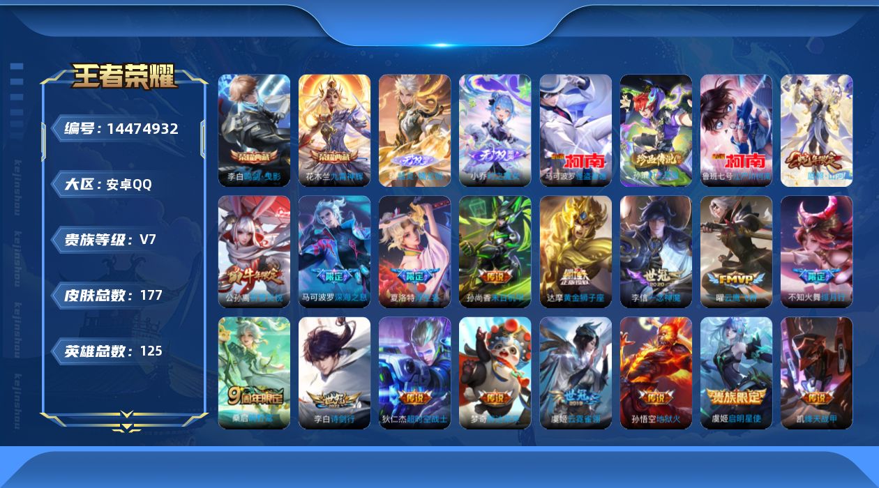 [14474932]贵族8-177皮2典藏19传说2无双3珍品传说-2个英雄全皮-改名卡2 安卓手q389区177皮2典藏19传说2无双3珍品传说v7 营地id1751289698最强王者【珍品传说皮肤】:时之奇旅怪盗基德江户川柯南【无双皮肤】:时之魔女器灵·螭龙剑【荣耀典藏】:九霄神辉鸣剑·曳影【优质限定皮肤】:祈雪灵祝神威【传说皮肤】:神树通天深海之息诗剑行祈雪灵祝超时空战