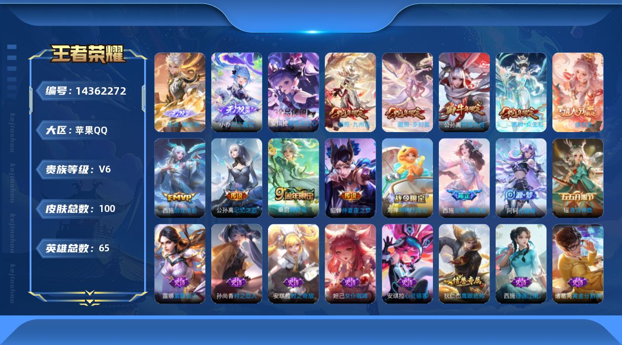[14362272]8300西施 贵族7-贵族积分29185-58皮1典藏11传说0无双-1个英雄全皮肤 苹果手q138区100皮0典藏10传说2无双1珍品传说v6 营地id1661819067至尊星耀iii【珍品传说皮肤】:酷洛米之心【无双皮肤】:器灵·螭龙剑时之魔女【优质限定皮肤】:祈雪灵祝【传说皮肤】:神树通天祈雪灵祝续相思记忆之芯愿照·岁时盈仲夏夜之梦愿照·九州拓愿照·众