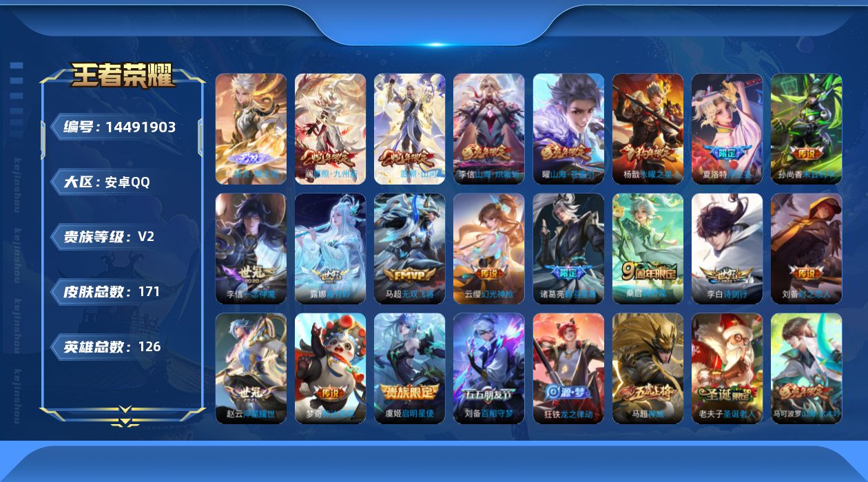 [14491903]贵族8-贵族积分59273-171皮0典藏18传说1无双-3个英雄全皮 安卓手q499区171皮0典藏18传说1无双v2 营地id1840977405至圣王者【无双皮肤】:器灵·螭龙剑【优质限定皮肤】:山海·苍雷引山海·炽霜斩无双飞将神威【传说皮肤】:幻光神呛启明星使愿照·山河定愿照·九州拓霜月吟鸣野蒿诗剑行浮生妄胖达荣荣山海·苍雷引末日机甲