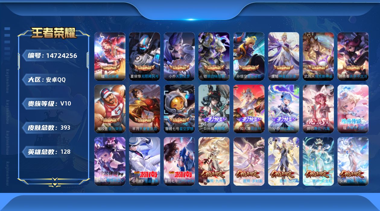 [14724256]皇冠号 女号 2天幕已截图 贵族10-流光积分29438-393皮11典藏36传说4无双4珍品传说-8个英雄全皮肤 安卓手q531区393皮11典藏36传说4无双4珍品传说v10 营地id545010918荣耀王者【珍品传说皮肤】:酷洛米之心大耳狗之梦怪盗基德江户川柯南【无双皮肤】:时之魔女离恨烟花合斗青丘·九尾【荣耀典藏】:拾光映像神鉴启示录银白咏叹调全息