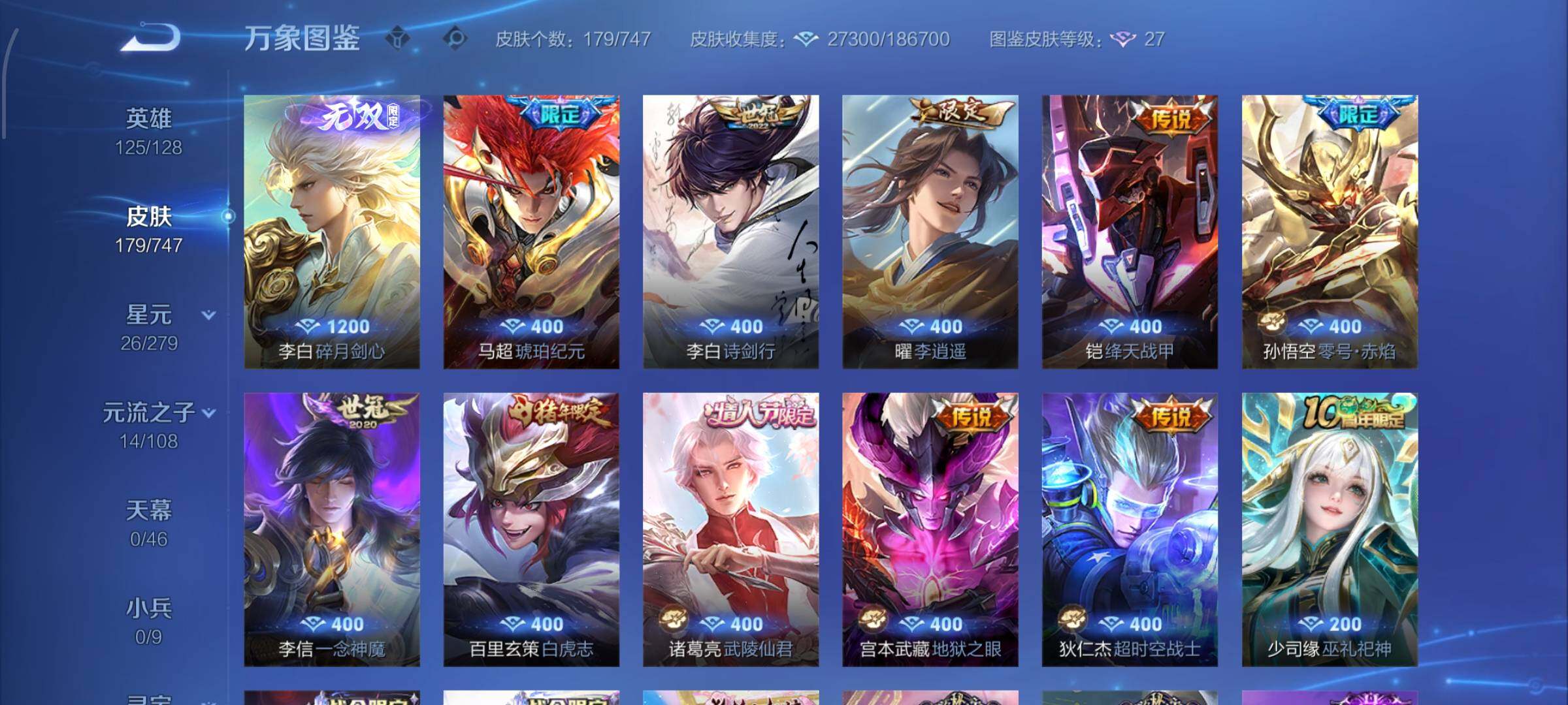 【高性价比打野号·碎月剑心·马超琥珀纪元·诗剑行·曜李·绛天战甲·零号赤焰·一念神魔·白虎志·武陵仙君·可二次】w8430-安卓q-125英雄-179皮肤-3王者印记-110铭文-贵族积分4w【贵族7】【·1无双·2星传说·10传说·9按键·245幸运值】【因赛季更新游戏段付以上号为准!】 【英雄全皮】:影全皮 【无双皮肤】:李白碎月剑心 【星元皮肤】:狄仁杰星际治安官,宫本武藏幽冥之