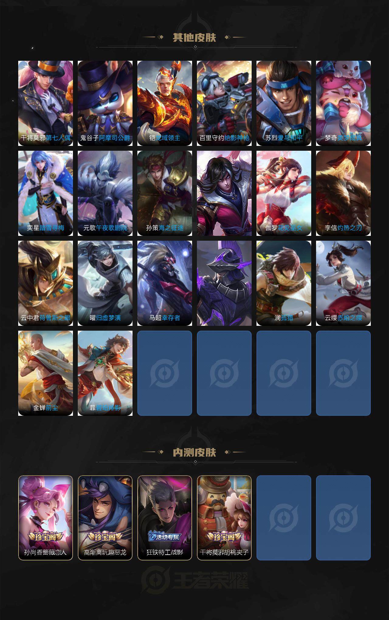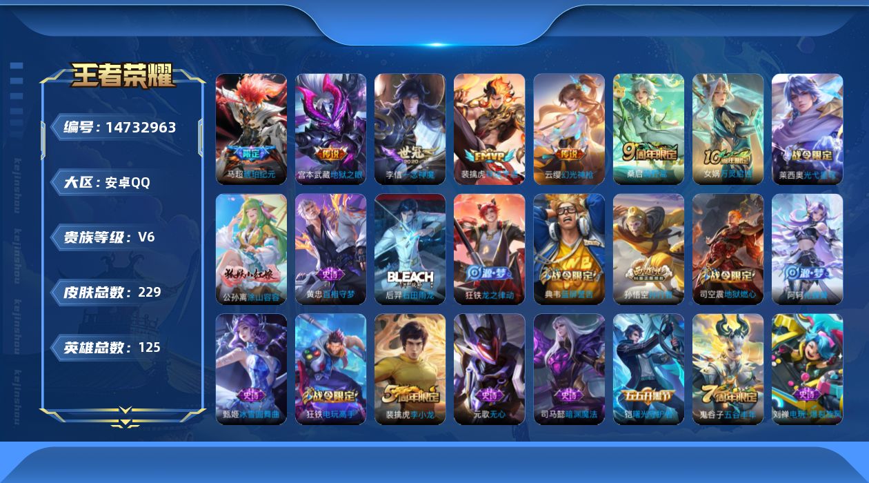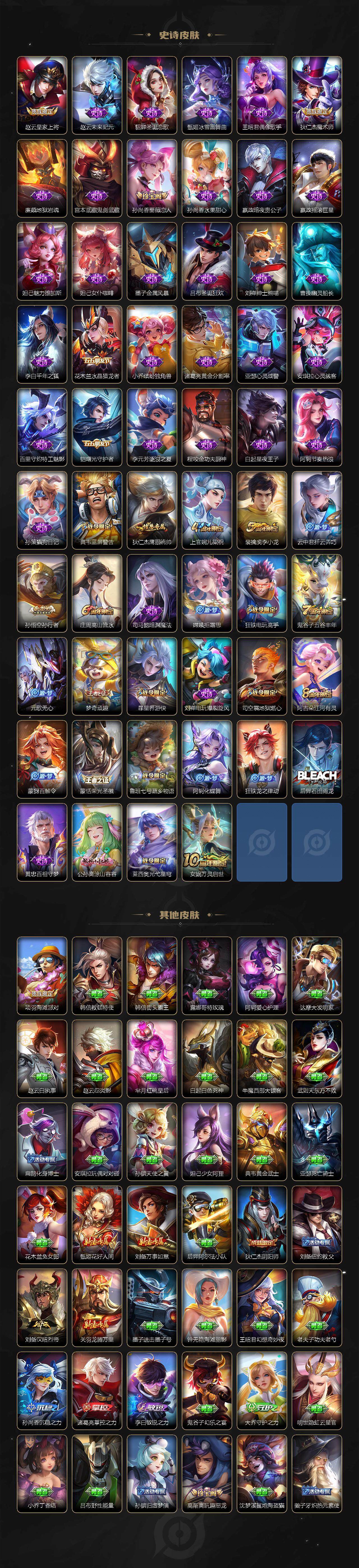 [14732963]安卓q-v6-最强王者段位-125英雄-229皮肤-7传说-58史诗 【英雄全皮】:鬼谷子全皮,蒙恬全皮 【传说皮肤】:后羿神树通天,云缨幻光神呛,裴擒虎祥瑞亨通,桑启鸣野蒿,马超琥珀纪元,李信一念神魔,宫本武藏地狱之眼 【限定皮肤】:姜子牙天穹之誓,狄仁杰阴阳师,赵云皇家上将,孙尚香蔷薇恋人,庄周高山流水,高渐离玩趣恶龙,元歌无心,典韦蓝屏警告,狄仁杰魔术师,狄仁杰万华元夜,达摩星际陆战队,达摩沙漠行僧,项羽海滩派对,老夫子醍醐杖,王昭君午后时光,兰陵王金庭之子,孙悟空孙行者,李元芳云中旅人,钟馗驱傩正仪,干将莫邪胡桃夹子,鬼谷子原初探秘者,鬼谷子五谷丰年,苏烈千军破阵,梦奇顽趣,沈梦溪大漠名商,明世隐疑决卦,裴擒虎李小龙,裴擒虎擒涛扼浪,狂铁电玩高手,云中君纤云弄巧,上官婉儿梁祝,嫦娥拒霜思,嫦娥暖冬兔眠,鲁班大师探海日志,桑启海盐诗旅,暃星界游侠,司空震地狱燃心,阿古朵江河有灵,张良古海寻踪,蒙犽百解令,蒙恬荣光圣徽,鬼谷子天穹祈灯,马超琥珀纪元,沈梦溪龙舞盛年,鲁班七号蔬乡物语,李元芳蔬乡物语,刘邦剑破天穹,程咬金群星魔术团,周瑜熔金海岸 【赛季限定】:狄仁杰万华元夜,达摩沙漠行僧,老夫子醍醐杖,兰陵王金庭之子,张良古海寻踪,李元芳云中旅人,钟馗驱傩正仪,鬼谷子原初探秘者,苏烈千军破阵,梦奇顽趣,沈梦溪大漠名商,明世隐疑决卦,裴擒虎擒涛扼浪,鲁班大师探海日志,桑启海盐诗旅,鬼谷子天穹祈灯,蒙恬荣光圣徽,刘邦剑破天穹,姜子牙天穹之誓 【战令限定】:典韦蓝屏警告,达摩星际陆战队,王昭君午后时光,狂铁电玩高手,嫦娥暖冬兔眠,司空震地狱燃心,暃星界游侠,鲁班七号蔬乡物语,李元芳蔬乡物语 【史诗皮肤】:赵云皇家上将,赵云未来纪元,貂蝉圣诞恋歌,甄姬冰雪圆舞曲,王昭君偶像歌手,狄仁杰魔术师,廉颇地狱岩魂,宫本武藏鬼剑武藏,孙尚香蔷薇恋人,孙尚香水果甜心,嬴政暗夜贵公子,嬴政摇滚巨星,妲己魅力维加斯,妲己女仆咖啡,墨子金属风暴,吕布圣诞狂欢,刘禅绅士熊喵,曹操幽灵船长,李白千年之狐,花木兰水晶猎龙者,小乔缤纷独角兽,诸葛亮黄金分割率,亚瑟心灵战警,安琪拉心灵骇客,百里守约特工魅影,铠曙光守护者,李元芳逐浪之夏,程咬金功夫厨神,白起星夜王子,阿轲节奏热浪,孙策猫狗日记,典韦蓝屏警告,狄仁杰鹰眼统帅,上官婉儿梁祝,裴擒虎李小龙,云中君纤云弄巧,孙悟空孙行者,庄周高山流水,司