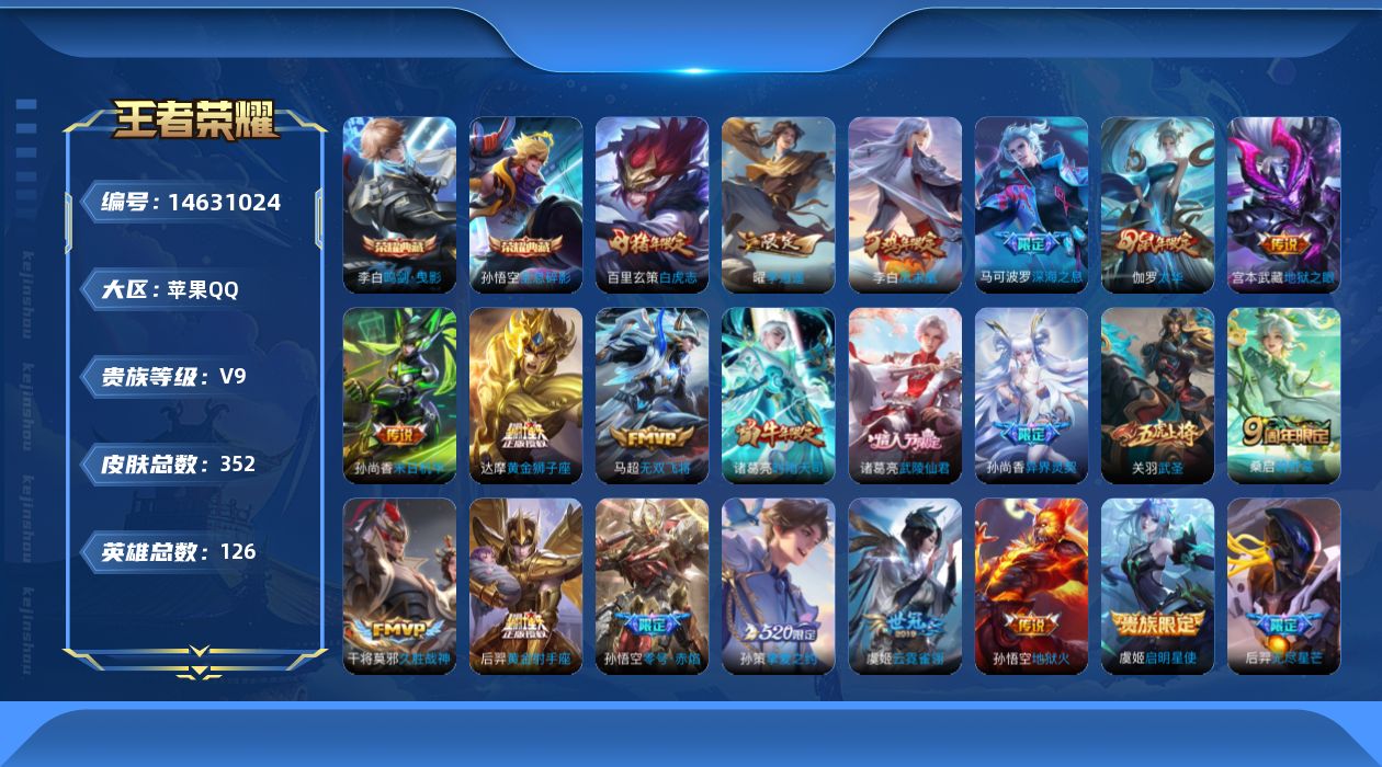[14631024]苹果q-v9-最强王者段位-126英雄-352皮肤-2典藏皮肤-24传说-108史诗 【英雄全皮】:鬼谷子全皮,狂铁全皮 【荣耀典藏】:孙悟空全息碎影,李白鸣剑曳影 【传说皮肤】:后羿神树通天,桑启鸣野蒿,马可波罗深海之息,后羿无尽星芒,马超无双飞将,孙策挚爱之约,孙尚香异界灵契,曜李 ,诸葛亮时雨天司,铠绛天战甲,虞姬启明星使,孙悟空零号赤焰,关羽武圣,伽罗太华,干将莫邪久胜战神,虞姬云霓雀翎,达摩黄金狮子座,百里玄策白虎志,后羿黄金射手座,诸葛亮武陵仙君,李白凤求凰,孙尚香末日机甲,宫本武藏地狱之眼,孙悟空地狱火 【限定皮肤】:姜子牙天穹之誓,杨戬破阵退雄兵,狄仁杰阴阳师,赵云皇家上将,赵云引擎之心,赵云龙胆,墨子神迹守卫,嬴政优雅恋人,嬴政白昼王子,孙尚香蔷薇恋人,孙尚香异界灵契,鲁班七号狮舞东方,庄周高山流水,高渐离玩趣恶龙,阿轲迷踪丽影,白起夜都怪侠,芈月幻夜卜梦,吕布猎兽之王,吕布御风骁将,周瑜赤莲之焰,元歌无心,夏侯惇朔风刀,甄姬游园惊梦,曹操天狼征服者,典韦穷奇,典韦蓝屏警告,典韦岱宗,马可波罗逐梦之星,马可波罗深海之息,狄仁杰魔术师,狄仁杰万华元夜,达摩星际陆战队,达摩沙漠行僧,项羽海滩派对,老夫子醍醐杖,老夫子航海奇遇记,关羽冰锋战神,关羽武圣,安琪拉魔法小厨娘,程咬金演武夺筹,刘邦夺宝奇兵,韩信逐梦之影,韩信飞衡,韩信傲雪梅呛,王昭君午后时光,兰陵王驯魔猎人,兰陵王金庭之子,孙悟空至尊宝,孙悟空大圣娶亲,孙悟空零号赤焰,孙悟空孙行者,牛魔御旌,后羿如梦令,后羿圣弓游侠,后羿无尽星芒,李元芳银河之约,李元芳云中旅人,虞姬启明星使,钟馗神迹守卫,钟馗驱傩正仪,杨玉环遇见飞天,女娲朔望之晖,干将莫邪真爱魔法,雅典娜单词大作战,雅典娜黎明之约,蔡文姬繁星吟游,东皇太一逐梦之光,鬼谷子原初探秘者,鬼谷子五谷丰年,诸葛亮武陵仙君,诸葛亮时雨天司,黄忠火炮绅士,铠青龙志,苏烈千军破阵,百里玄策白虎志,百里玄策原初追逐者,百里守约朱雀志,弈星混沌棋,梦奇顽趣,沈梦溪星空之诺,沈梦溪大漠名商,明世隐疑决卦,明世隐吟游魔法,裴擒虎李小龙,裴擒虎擒涛扼浪,狂铁御狮,狂铁电玩高手,米莱狄御霄,米莱狄胡桃异想国,伽罗太华,伽罗天狼溯光者,盾山御銮,孙策挚爱之约,上官婉儿梁祝,上官婉儿天狼绘梦者,嫦娥如梦令,嫦娥拒霜思,曜李 ,蒙犽狂想玩偶喵,鲁班大师探海日志,
