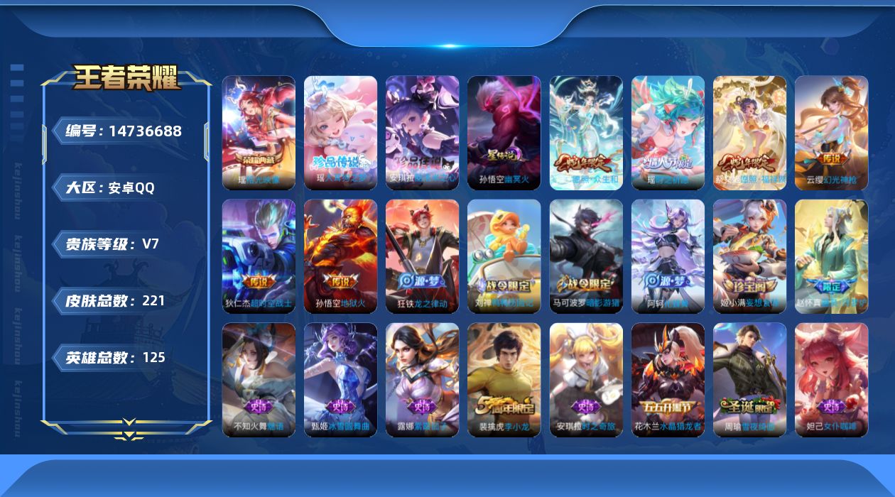 [14736688]按键8 安卓q-221皮肤-1典藏皮肤-2珍品传说-7传说-47史诗 【荣耀典藏】:瑶拾光映像 【珍品传说】:瑶大耳狗之梦,安琪拉酷洛米之心 【传说皮肤】:后羿神树通天,妲己愿照众生和,蔡文姬愿照福禄聚,云缨幻光神呛,瑶时之祈愿,孙悟空地狱火,狄仁杰超时空战士 【限定皮肤】:白起狰,大乔绒语心约,姜子牙天穹之誓,狄仁杰阴阳师,赵云皇家上将,钟无艳王者之锤,芈月重明,夏侯惇朔风刀,曹操烛龙,典韦穷奇,马可波罗暗影游猎,狄仁杰魔术师,狄仁杰万华元夜,项羽海滩派对,老夫子醍醐杖,程咬金演武夺筹,牛魔御旌,钟馗驱傩正仪,太乙真人饕餮,鬼谷子原初探秘者,弈星混沌棋,明世隐疑决卦,裴擒虎李小龙,米莱狄御霄,瑶时之祈愿,云中君纤云弄巧,盾山御銮,猪八戒西部大镖客,上官婉儿梁祝,嫦娥拒霜思,张良古海寻踪,蒙犽百解令,鬼谷子天穹祈灯,姬小满妄想食味,沈梦溪龙舞盛年,鲁班七号蔬乡物语,李元芳蔬乡物语,刘邦剑破天穹,程咬金群星魔术团,周瑜熔金海岸 【赛季限定】:白起狰,芈月重明,夏侯惇朔风刀,曹操烛龙,典韦穷奇,狄仁杰万华元夜,老夫子醍醐杖,程咬金演武夺筹,张良古海寻踪,牛魔御旌,钟馗驱傩正仪,太乙真人饕餮,鬼谷子原初探秘者,弈星混沌棋,明世隐疑决卦,米莱狄御霄,盾山御銮,鬼谷子天穹祈灯,刘邦剑破天穹,姜子牙天穹之誓 【战令限定】:马可波罗暗影游猎,猪八戒西部大镖客,鲁班七号蔬乡物语,李元芳蔬乡物语 【史诗皮肤】:露娜紫霞仙子,钟无艳王者之锤,赵云皇家上将,貂蝉圣诞恋歌,甄姬冰雪圆舞曲,狄仁杰魔术师,宫本武藏鬼剑武藏,孙尚香水果甜心,嬴政摇滚巨星,妲己魅力维加斯,妲己女仆咖啡,墨子金属风暴,吕布圣诞狂欢,李白千年之狐,张飞乱世虎臣,花木兰水晶猎龙者,刘邦德古拉伯爵,小乔缤纷独角兽,兰陵王暗隐猎兽者,诸葛亮黄金分割率,安琪拉心灵骇客,蔡文姬舞动绿茵,李元芳逐浪之夏,白起星夜王子,阿轲节奏热浪,伽罗箭羽风息,狄仁杰鹰眼统帅,上官婉儿梁祝,大乔白蛇,不知火舞魅语,马可波罗暗影游猎,裴擒虎李小龙,云中君纤云弄巧,沈梦溪月团寄思,钟馗乐园奇幻夜,安琪拉时之奇旅,嫦娥拒霜思,蒙犽百解令,周瑜雪夜绮愿,姬小满妄想食味,鲁班七号蔬乡物语,弈星万物之道,赵怀真器灵浮梦炉,芈月瑰影绮梦,阿轲化蝶舞,刘禅鸭鸭历险记,狂铁龙之律动 【其他皮肤】:项羽海滩派对,韩信教廷特使,韩信街头霸王,露娜哥特玫瑰,阿轲爱心