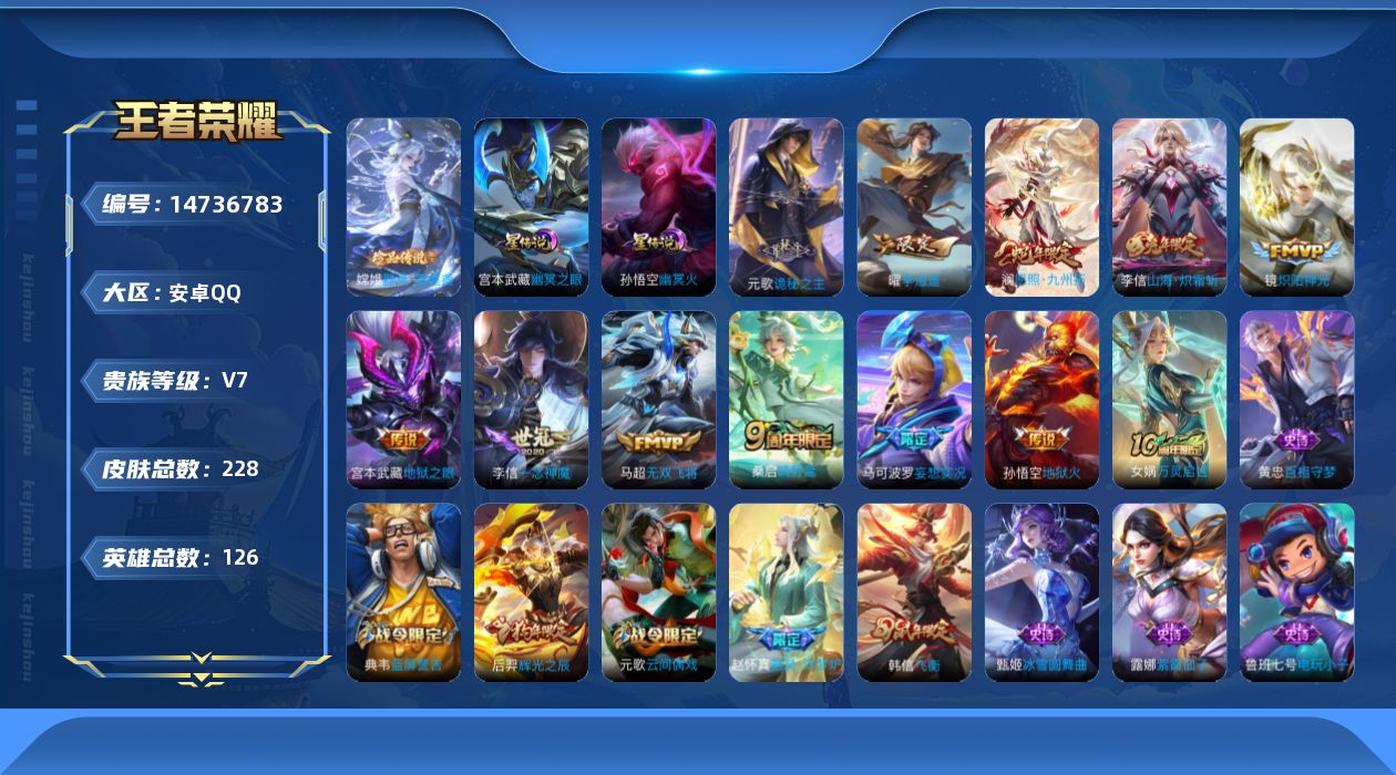 [14736783]按键7 夺宝265 安卓q-228皮肤-1珍品传说-12传说-51史诗 【英雄全皮】:元歌全皮,李信全皮 【珍品传说】:嫦娥器灵落星盏 【传说皮肤】:后羿神树通天,元歌诡秘之主,澜愿照九州拓,桑启鸣野蒿,马可波罗妄想实况,李信山海炽霜斩,马超无双飞将,曜李 ,镜炽阳神光,李信一念神魔,宫本武藏地狱之眼,孙悟空地狱火 【限定皮肤】:白起狰,蒙犽顽岩魄,姜子牙天穹之誓,狄仁杰阴阳师,虞姬凯尔特女王,赵云皇家上将,嬴政白昼王子,鲁班七号狮舞东方,高渐离死亡摇滚,高渐离玩趣恶龙,钟无艳王者之锤,芈月重明,吕布猎兽之王,元歌云间偶戏,元歌无心,夏侯惇朔风刀,曹操烛龙,典韦穷奇,典韦蓝屏警告,马可波罗妄想实况,狄仁杰魔术师,狄仁杰万华元夜,达摩沙漠行僧,项羽海滩派对,老夫子醍醐杖,程咬金演武夺筹,韩信飞衡,兰陵王金庭之子,亚瑟潮玩骑士王,牛魔御旌,后羿辉光之辰,李元芳云中旅人,钟馗神迹守卫,钟馗驱傩正仪,女娲朔望之晖,干将莫邪胡桃夹子,太乙真人饕餮,鬼谷子原初探秘者,鬼谷子五谷丰年,苏烈千军破阵,百里玄策原初追逐者,弈星混沌棋,沈梦溪星空之诺,沈梦溪大漠名商,明世隐疑决卦,裴擒虎李小龙,裴擒虎擒涛扼浪,狂铁御狮,米莱狄御霄,云中君纤云弄巧,李信山海炽霜斩,盾山御銮,上官婉儿梁祝,曜李 ,鲁班大师探海日志,桑启海盐诗旅,艾琳女武神,阿古朵江河有灵,张良古海寻踪,鬼谷子天穹祈灯,沈梦溪龙舞盛年,刘邦剑破天穹,周瑜熔金海岸 【年限皮肤】:后羿辉光之辰,韩信飞衡,李信山海炽霜斩 【赛季限定】:白起狰,芈月重明,夏侯惇朔风刀,曹操烛龙,典韦穷奇,狄仁杰万华元夜,达摩沙漠行僧,老夫子醍醐杖,程咬金演武夺筹,兰陵王金庭之子,张良古海寻踪,牛魔御旌,李元芳云中旅人,虞姬凯尔特女王,钟馗驱傩正仪,太乙真人饕餮,鬼谷子原初探秘者,苏烈千军破阵,百里玄策原初追逐者,弈星混沌棋,沈梦溪大漠名商,明世隐疑决卦,裴擒虎擒涛扼浪,狂铁御狮,米莱狄御霄,盾山御銮,鲁班大师探海日志,桑启海盐诗旅,鬼谷子天穹祈灯,刘邦剑破天穹,姜子牙天穹之誓 【战令限定】:嬴政白昼王子,鲁班七号狮舞东方,吕布猎兽之王,元歌云间偶戏,典韦蓝屏警告,亚瑟潮玩骑士王,钟馗神迹守卫,女娲朔望之晖,沈梦溪星空之诺 【史诗皮肤】:鲁班七号电玩小子,项羽苍穹之光,露娜紫霞仙子,阿轲暗夜猫娘,钟无艳王者之锤,赵云皇家上将,赵云未来纪元