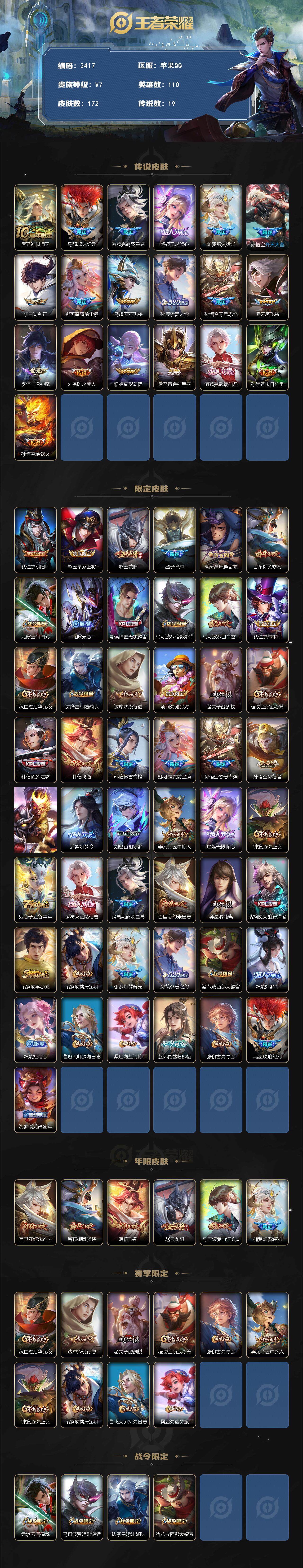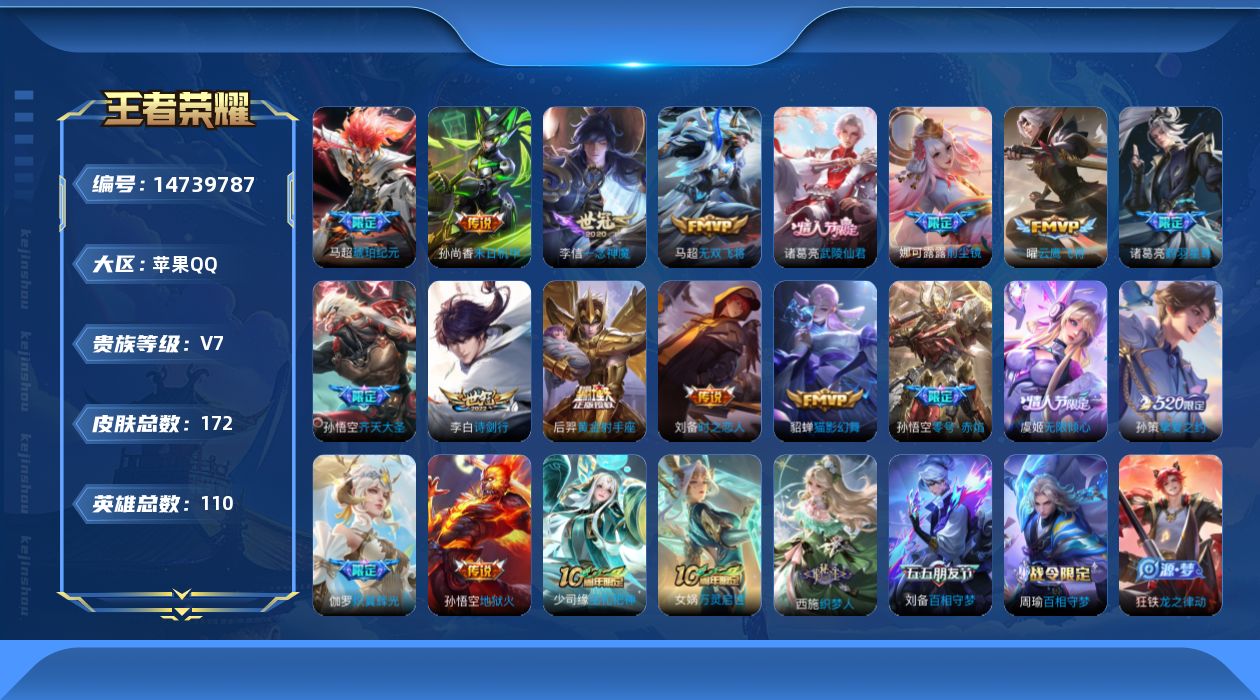 [14739787]苹果q-v7-最强王者段位-110英雄-172皮肤-19传说-55史诗 【传说皮肤】:后羿神树通天,马超琥珀纪元,诸葛亮鹤羽星尊,虞姬无限倾心,伽罗炽翼辉光,孙悟空齐天大圣,李白诗剑行,娜可露露前尘镜,马超无双飞将,孙策挚爱之约,孙悟空零号赤焰,曜云鹰飞将,李信一念神魔,刘备时之恋人,貂蝉猫影幻舞,后羿黄金射手座,诸葛亮武陵仙君,孙尚香末日机甲,孙悟空地狱火 【限定皮肤】:狄仁杰阴阳师,赵云皇家上将,赵云龙胆,墨子降魔,高渐离玩趣恶龙,吕布御风骁将,元歌云间偶戏,元歌无心,夏侯惇匿光决锋者,马可波罗暗影游猎,马可波罗山海玄木吟,狄仁杰魔术师,狄仁杰万华元夜,达摩星际陆战队,达摩沙漠行僧,项羽海滩派对,老夫子醍醐杖,程咬金演武夺筹,韩信逐梦之影,韩信飞衡,韩信傲雪梅呛,娜可露露前尘镜,孙悟空零号赤焰,孙悟空孙行者,孙悟空齐天大圣,后羿如梦令,刘备百相守梦,李元芳云中旅人,虞姬无限倾心,钟馗驱傩正仪,鬼谷子五谷丰年,诸葛亮武陵仙君,诸葛亮鹤羽星尊,百里守约朱雀志,弈星混沌棋,裴擒虎天狼狩猎者,裴擒虎李小龙,裴擒虎擒涛扼浪,伽罗炽翼辉光,孙策挚爱之约,猪八戒西部大镖客,嫦娥如梦令,嫦娥拒霜思,鲁班大师探海日志,桑启海盐诗旅,赵怀真鹤归松栖,张良古海寻踪,马超琥珀纪元,沈梦溪龙舞盛年 【年限皮肤】:百里守约朱雀志,吕布御风骁将,韩信飞衡,赵云龙胆,马可波罗山海玄木吟,伽罗炽翼辉光 【赛季限定】:狄仁杰万华元夜,达摩沙漠行僧,老夫子醍醐杖,程咬金演武夺筹,张良古海寻踪,李元芳云中旅人,钟馗驱傩正仪,弈星混沌棋,裴擒虎擒涛扼浪,鲁班大师探海日志,桑启海盐诗旅 【战令限定】:元歌云间偶戏,马可波罗暗影游猎,达摩星际陆战队,猪八戒西部大镖客 【史诗皮肤】:赵云皇家上将,赵云未来纪元,狄仁杰魔术师,宫本武藏鬼剑武藏,孙尚香水果甜心,妲己魅力维加斯,墨子龙骑士,吕布圣诞狂欢,曹操幽灵船长,吕布末日机甲,花木兰水晶猎龙者,刘邦德古拉伯爵,韩信逐梦之影,夏侯惇乘风破浪,小乔缤纷独角兽,诸葛亮黄金分割率,雅典娜冰冠公主,铠曙光守护者,阿轲节奏热浪,孙策猫狗日记,大乔猫狗日记,百里守约朱雀志,裴擒虎天狼狩猎者,狄仁杰鹰眼统帅,公孙离无限星赏官,韩信飞衡,嫦娥如梦令,后羿如梦令,不知火舞魅语,橘右京修罗,赵云龙胆,孙尚香时之恋人,马可波罗暗影游猎,裴擒虎李小龙,元歌云间偶戏,吕布御风骁将,百里