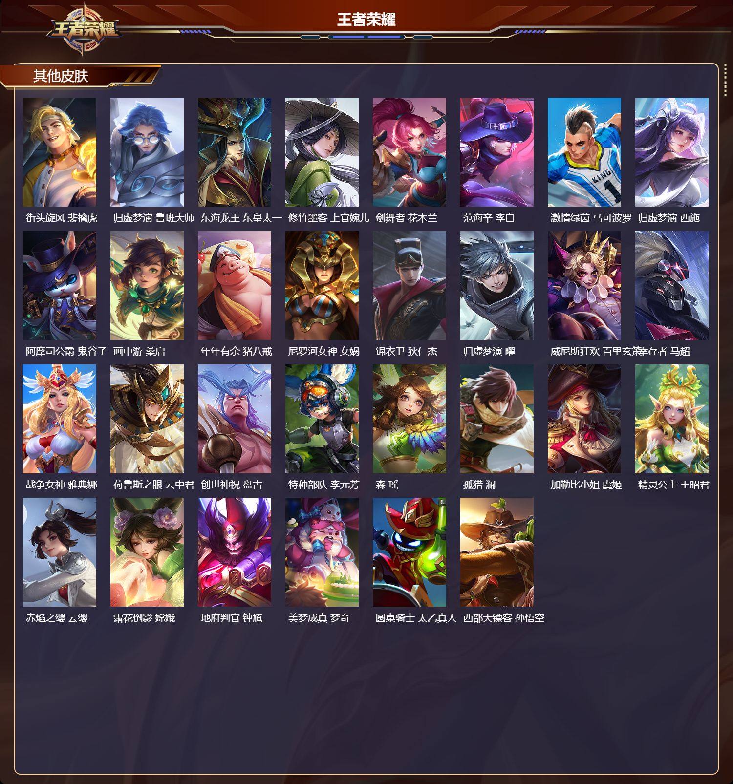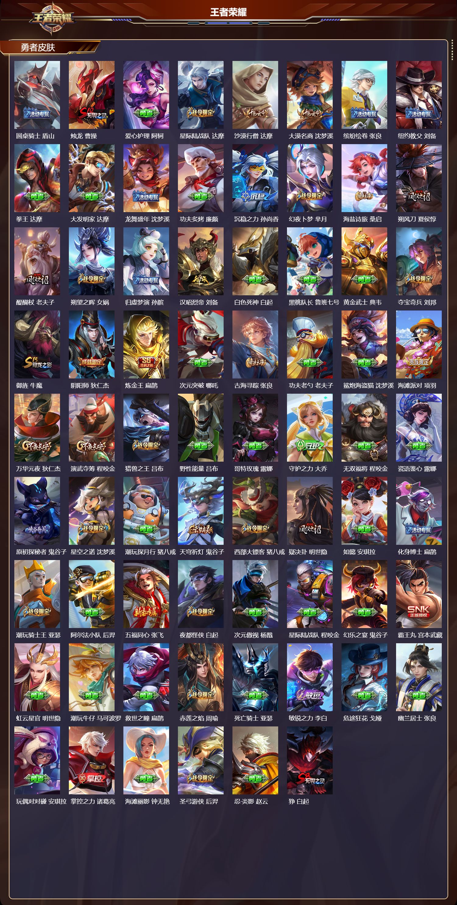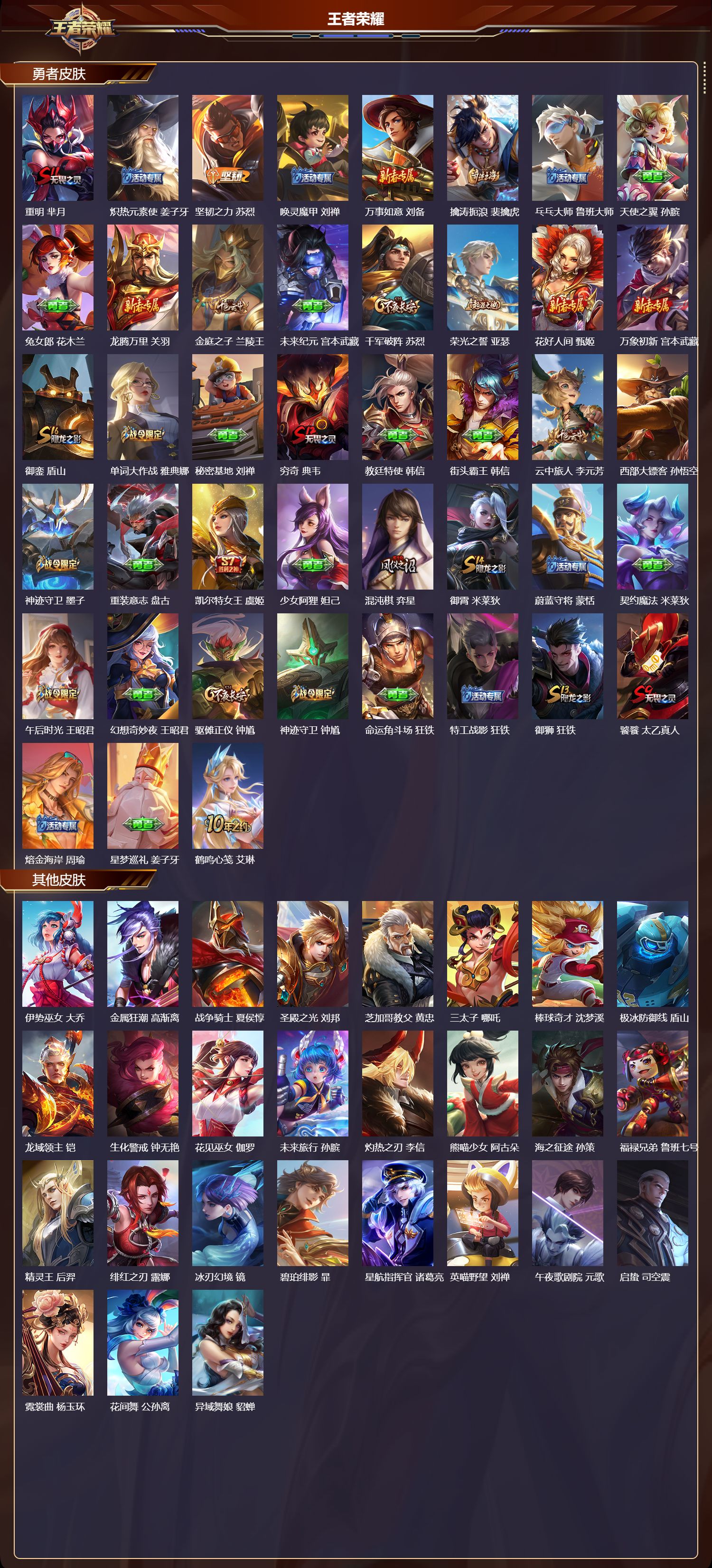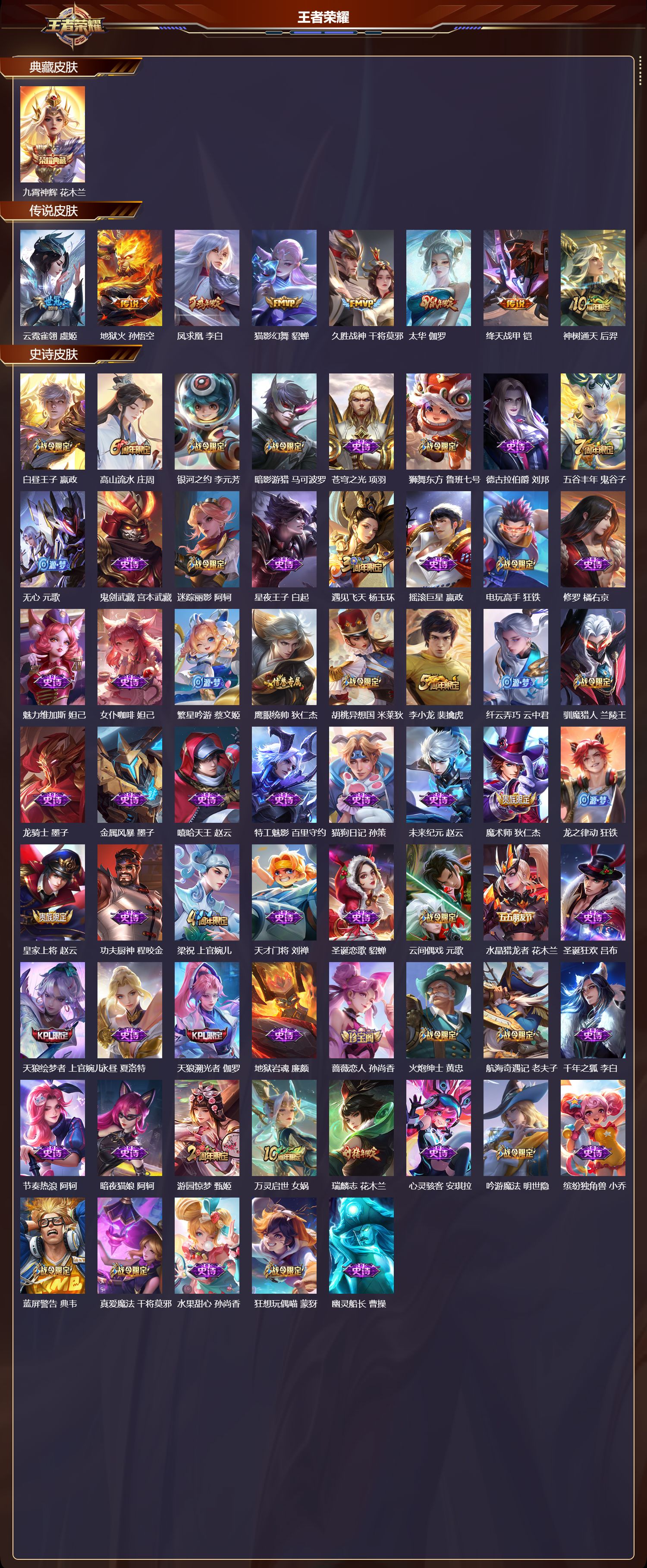 安卓qq/非凡王者/241皮肤/126英雄/1典藏/0珍品无双/0无双/0珍品传说/8传说/61史诗/8稀有英雄【1 典藏皮肤】九霄神辉 花木兰【8 传说皮肤】云霓雀翎 虞姬地狱火 孙悟空凤求凰 李白猫影幻舞 貂蝉久胜战神 干将莫邪太华 伽罗绛天战甲 铠神树通天 后羿【61 史诗皮肤】白昼王子 嬴政高山流水 庄周银河之约 李元芳暗影游猎 马可波罗苍穹之