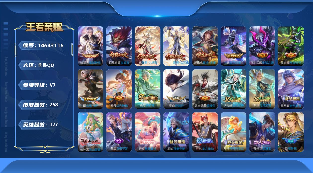 [14643116]v7 1典藏 13传说 127英雄 268皮肤 可修改实名 【英雄全皮】:司空震全皮敖隐全皮空空儿全皮孙权全皮钟馗全皮影全皮 【稀有英雄】:敖隐小龙人大司命嬴政始皇帝韩信韩跳跳夏洛特夏师傅艾琳橘右京橘子娜可露露鸟人不知火舞赵云金蝉唐僧戈娅 【荣耀水晶】:星域神启倪克斯贼亮 【传说皮】:神树通天幻光神呛地狱之眼末日机甲-孙尚香绿蚂蚱云鹰飞将小将军惊梅引澜逐花归海 【珍宝阁皮】:妄想食味 【赛季/战令皮】:噬灭天穹s37古海寻踪s33海盐诗旅s30擒涛扼浪s31探海日志s32驭风魔法流音漫舞顽趣-梦奇地狱燃心剑破天穹s35天穹祈灯s34青焰无极苍威无极天穹之誓s36蔡文姬夏日便利店虞姬夏日便利店妖精王s5炼金王s6凯尔特女王s7狰s8饕餮s9烛龙s10重明s11穷奇s12御狮s13御霄s14御旌s15御銮s16朔风刀s17混沌棋s18疑决卦s19醍醐杖s20原初探秘者s21万华元夜s22演武夺筹s23驱傩正仪s24猎兽之王白昼王子神迹守卫-钟馗狮舞东方西部大镖客-猪八戒暗影游猎游乐娃子沙漠行僧s26云中旅人s29 【史诗皮】:赞萌露比巫礼祀神糖绘人间化蝶舞鸭鸭历险记-刘禅龙之律动百相守梦-周瑜百相守梦-黄忠茶境仙星界战将百相守梦-百里守约破空之剑埋骨钱蔬乡物语鲁班七号涂山容容光弋星穹万灵启世紫霞仙子电玩小子小书包黄金分割率特工魅影千年之狐江河有灵蒙恬荣光圣徽龙骑士小龙虾冰冠公主青蛇偶像歌手无限星赏官白蛇猫狗日记-孙策乱世虎臣节奏热浪摇滚巨星水果甜心天才门将星夜王子心灵骇客功夫厨神德古拉伯爵暗隐猎兽者幽灵船长鬼剑武藏心灵战警乐园奇幻夜天秀·启明舞动绿茵繁星吟游呼啦呼啦缤纷独角兽乘风破浪逐浪之夏月团寄思水晶猎龙者曙光守护者箭羽风息金属风暴原初追逐者圣诞狂欢圣诞恋歌鹰眼统帅王者之锤暗夜贵公子黎明之约赏金猎手无心未来纪元-赵云 【限定皮】:愿照