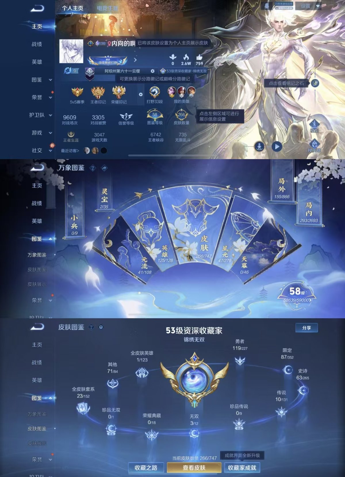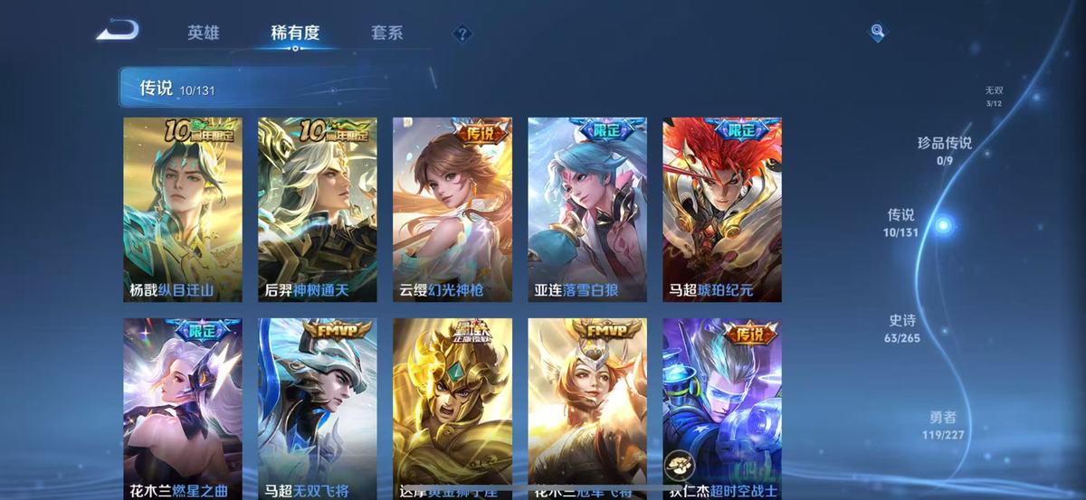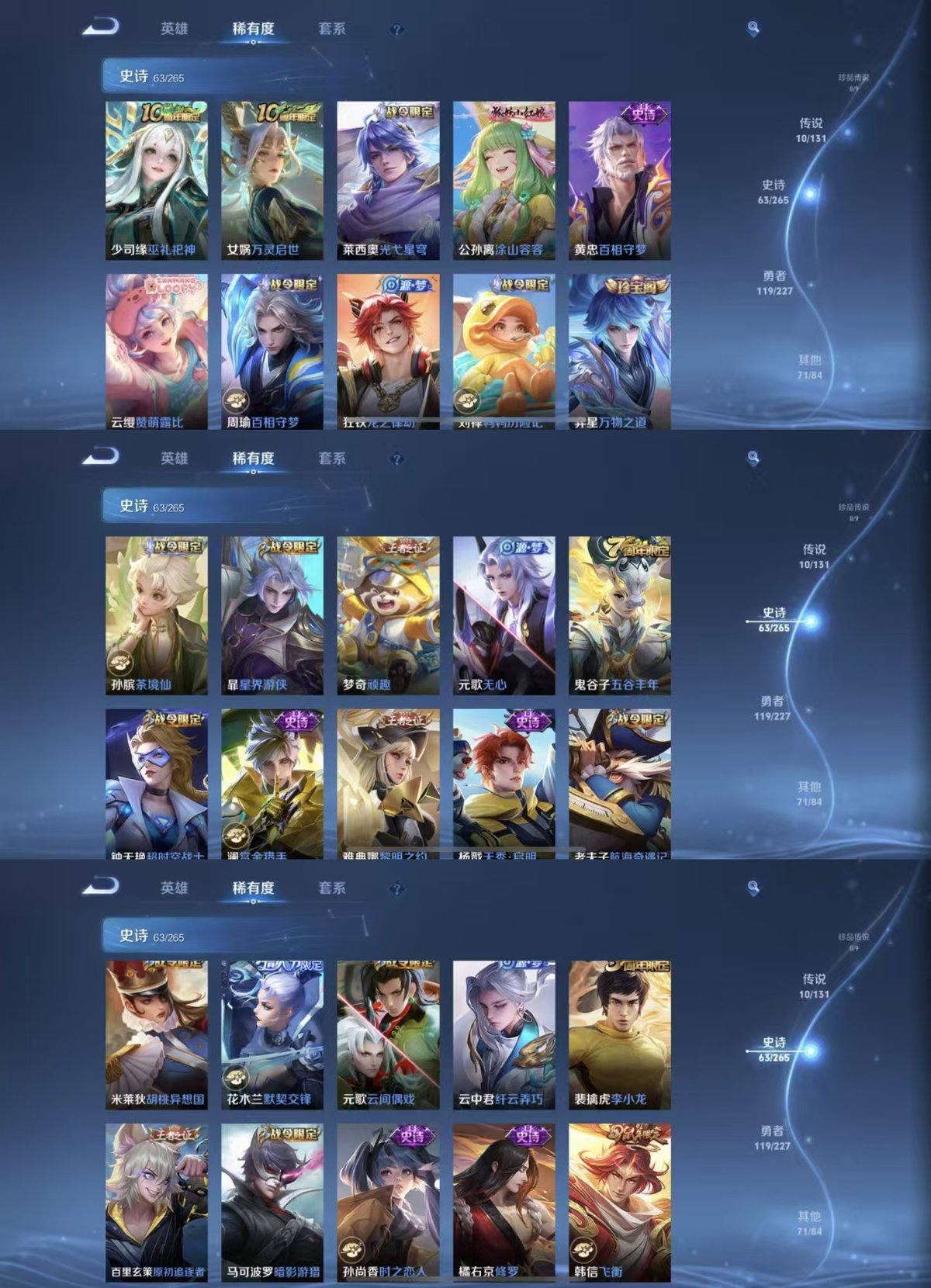 2315903-实名: 可修改 贵族等级: v7 英雄数: 125 皮肤数: 266 无双皮: 碎月剑心韩信群星魔术团神罪 传说皮: 黄金狮子座冠军飞将超时空战士-狄仁杰无双飞将燃星之曲琥珀纪元马超落雪白狼幻光神呛神树通天纵目迁山 限定皮: 李小龙游园惊梦梁祝飞衡至尊宝默契交锋-花木兰五谷丰年