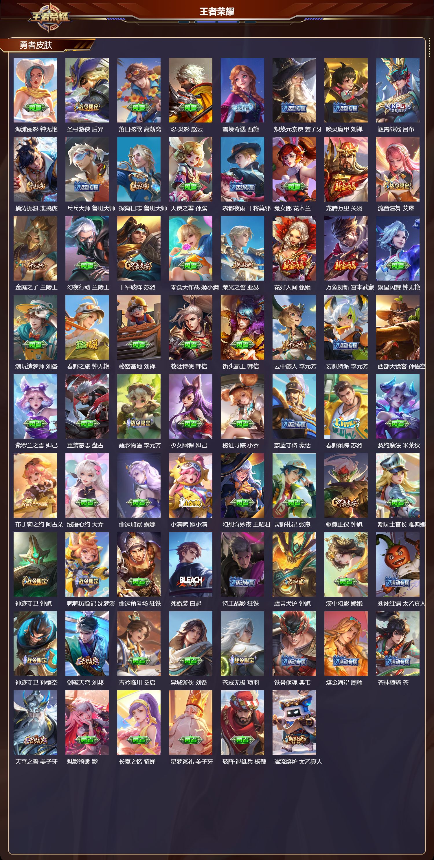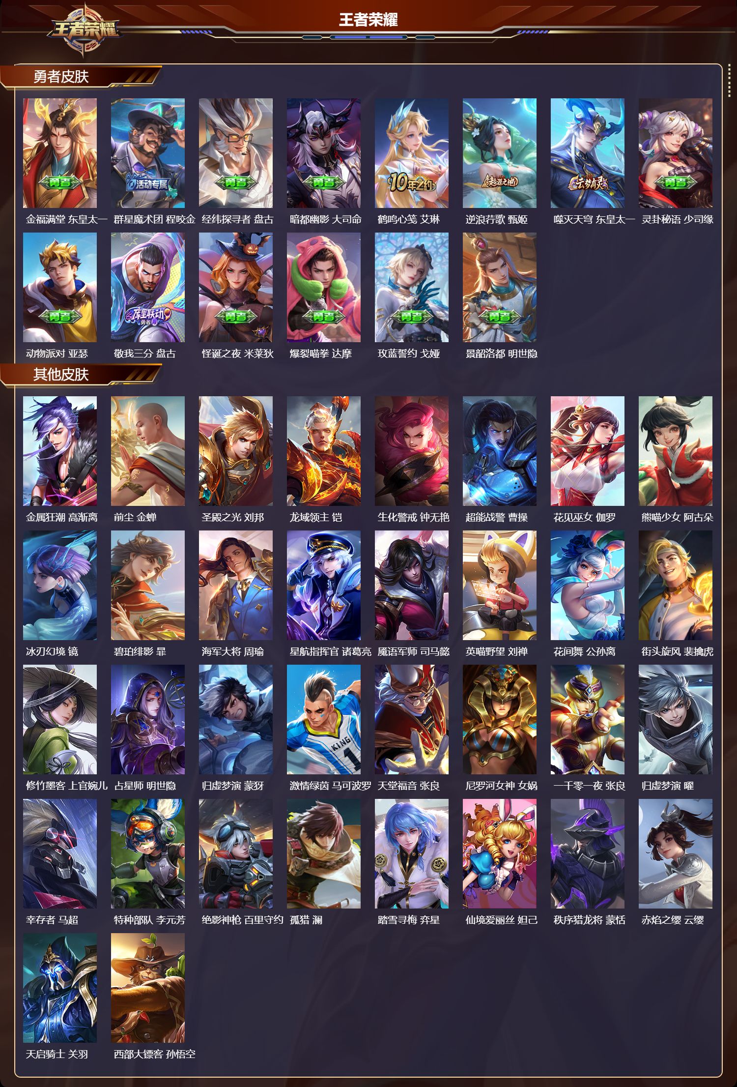 2275923-q/最强王者/258皮肤/126英雄/2典藏/0珍品无双/0无双/0珍品传说/7传说/66史诗/8稀有英雄 【2 典藏皮肤】弑呛猎影 韩信九霄神辉 花木兰 【7 传说皮肤】零号·赤焰 孙悟空云鹰飞将 曜地狱之眼 宫本武藏一念神魔 李信愿照·九州拓 澜幻光神呛 云缨鸣野蒿 桑启 【66 史诗皮肤】乒乒小将 鲁班七号电玩小子 鲁班七号末日机甲 吕布蔬乡物语