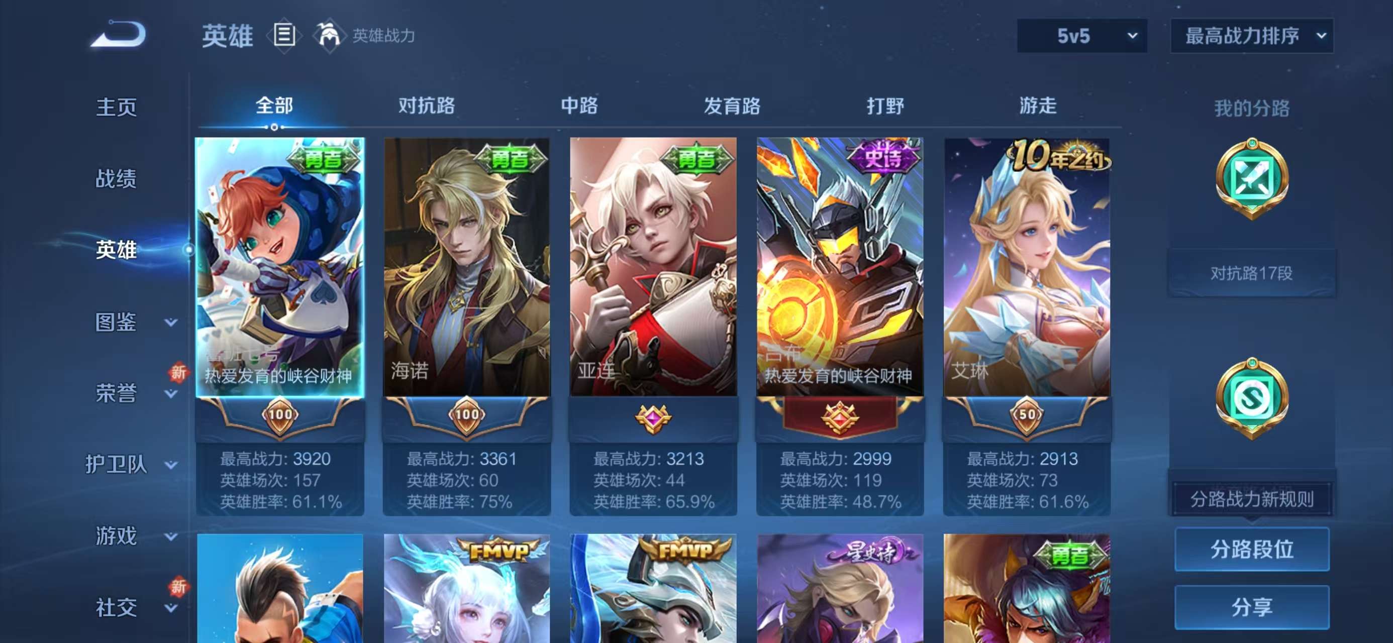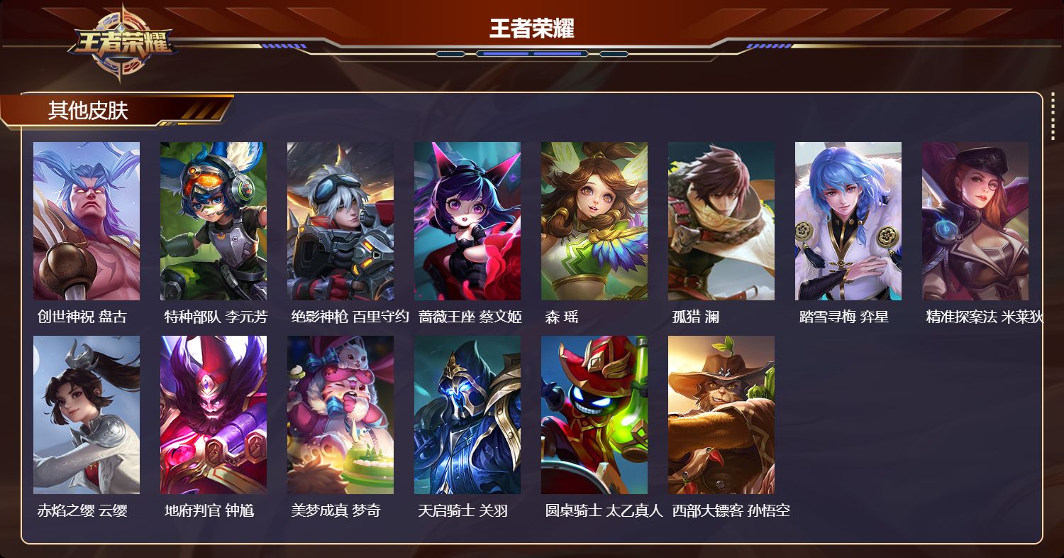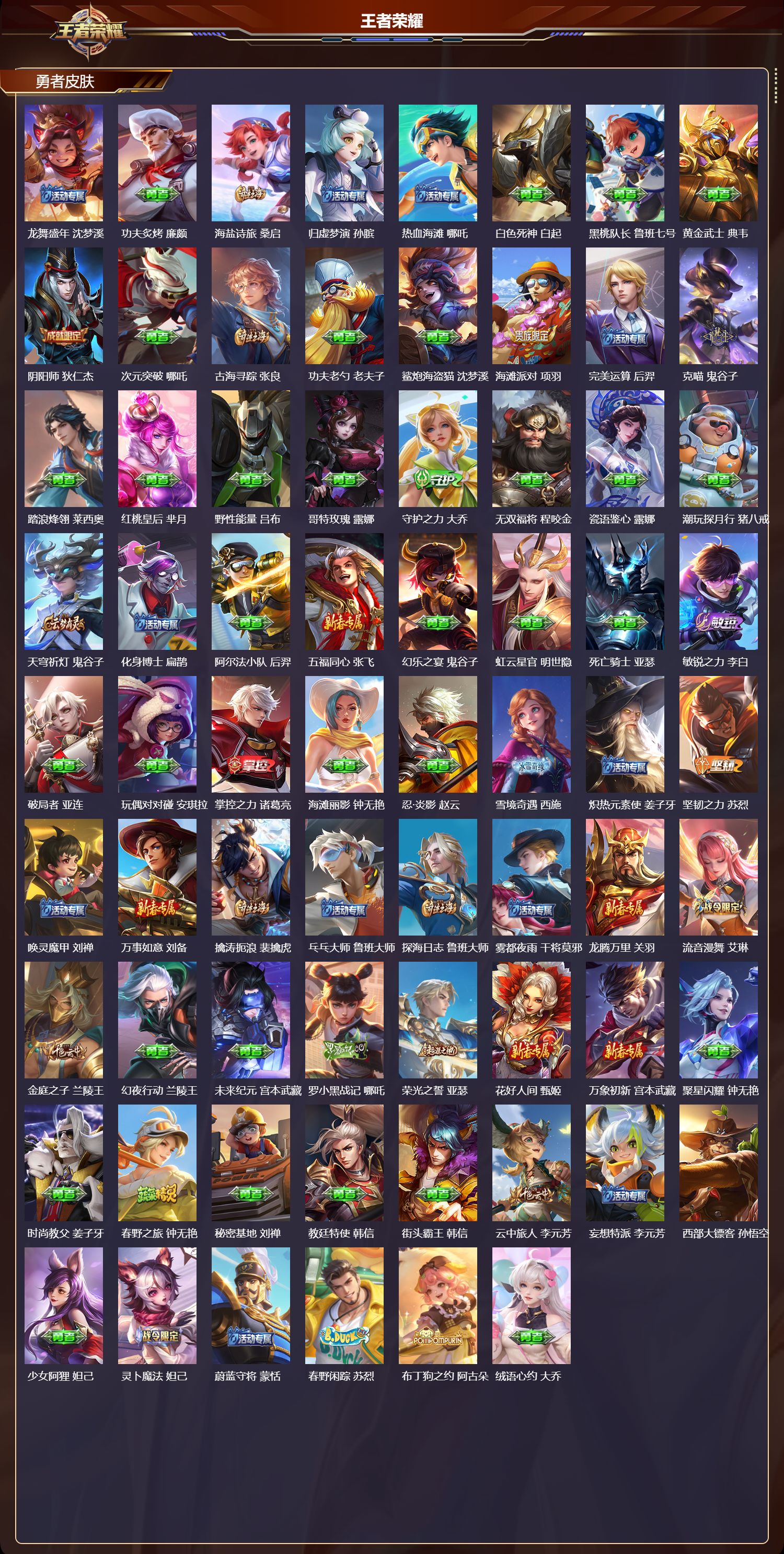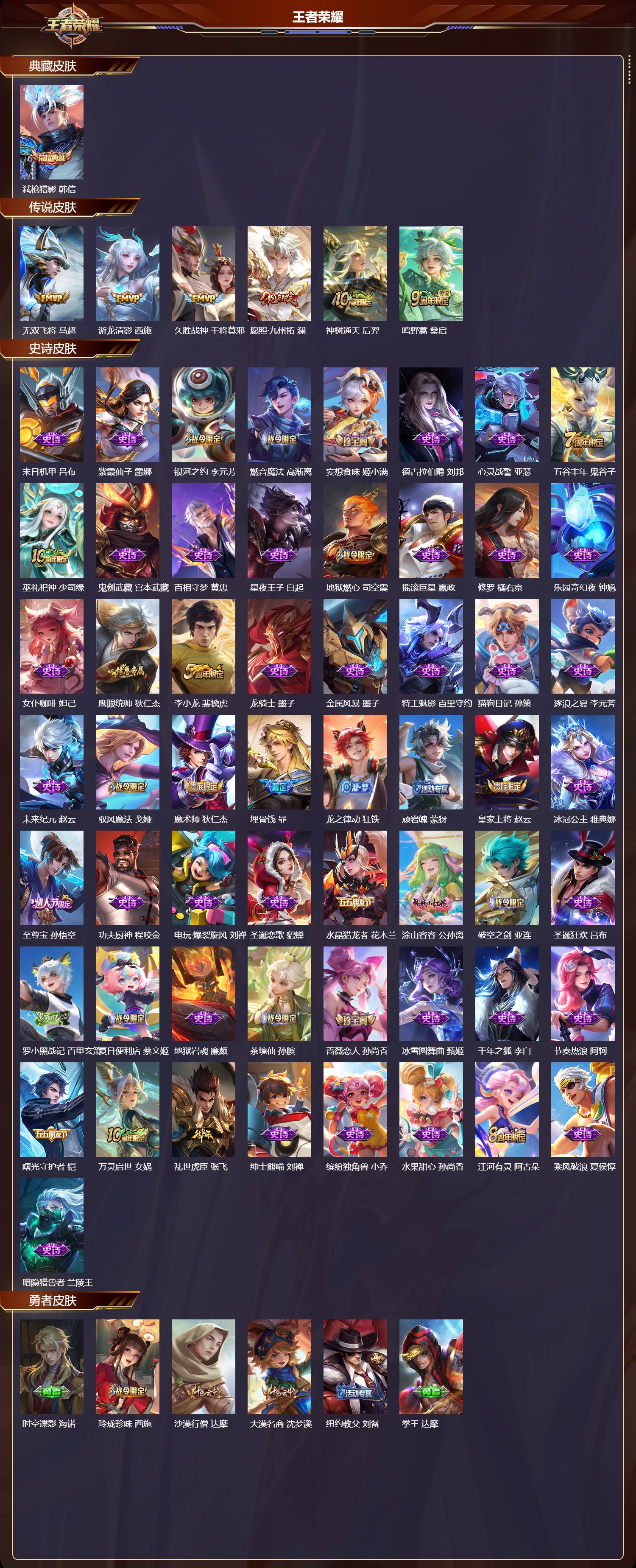 安卓qq/最强王者/223皮肤/127英雄/1典藏/0珍品无双/0无双/0珍品传说/6传说/57史诗/9稀有英雄【1 典藏皮肤】弑呛猎影 韩信【6 传说皮肤】无双飞将 马超游龙清影 西施久胜战神 干将莫邪愿照·九州拓 澜神树通天 后羿鸣野蒿 桑启【57 史诗皮肤】末日机甲 吕布紫霞仙子 露娜银河之约 李元芳燃音魔法 高渐离妄想食味 姬小满德古拉伯爵 刘邦