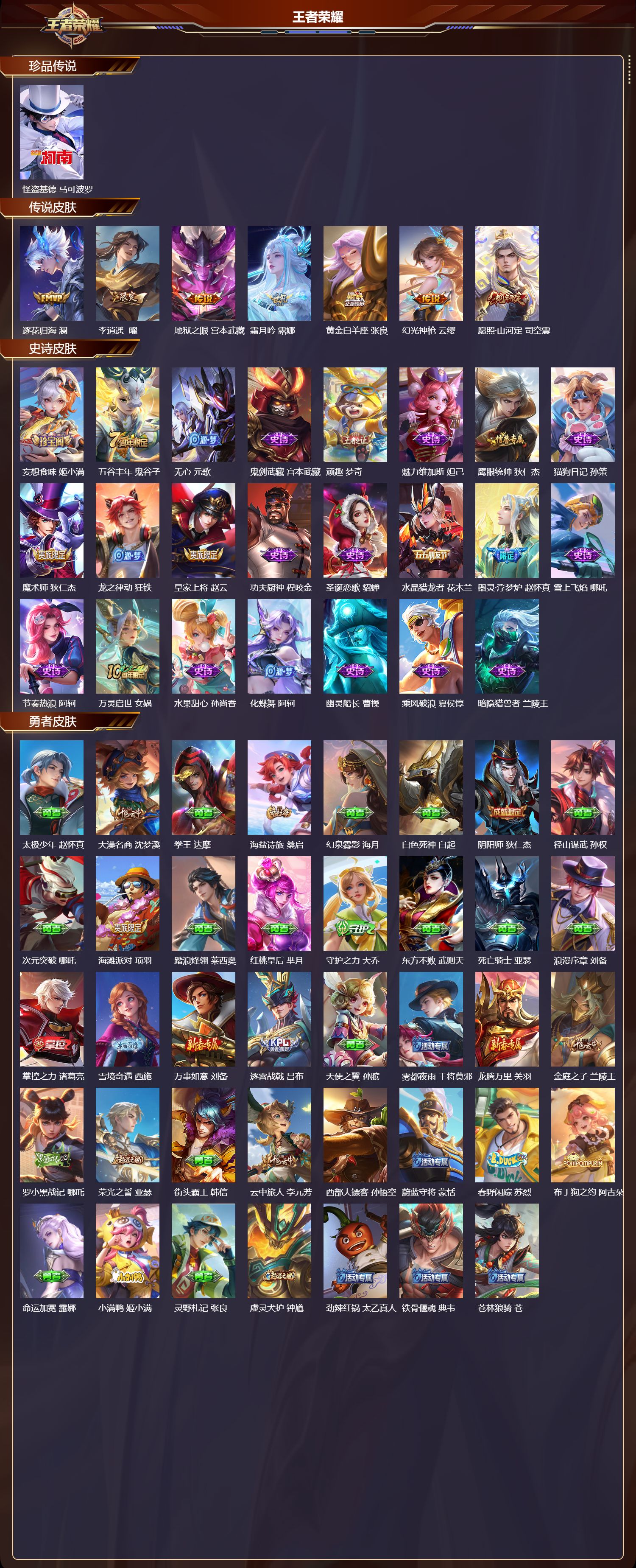 安卓qq/至圣王者/98皮肤/120英雄/0典藏/0珍品无双/0无双/1珍品传说/7传说/23史诗/7稀有英雄【1 珍品传说】怪盗基德 马可波罗【7 传说皮肤】逐花归海 澜李 曜地狱之眼 宫本武藏霜月吟 露娜黄金白羊座 张良幻光神呛 云缨愿照·山河定 司空震【23 史诗皮肤】妄想食味 姬小满五谷丰年 鬼谷子无心 元歌鬼剑武藏 宫本武藏顽趣 梦奇魅力维加斯 妲己鹰眼