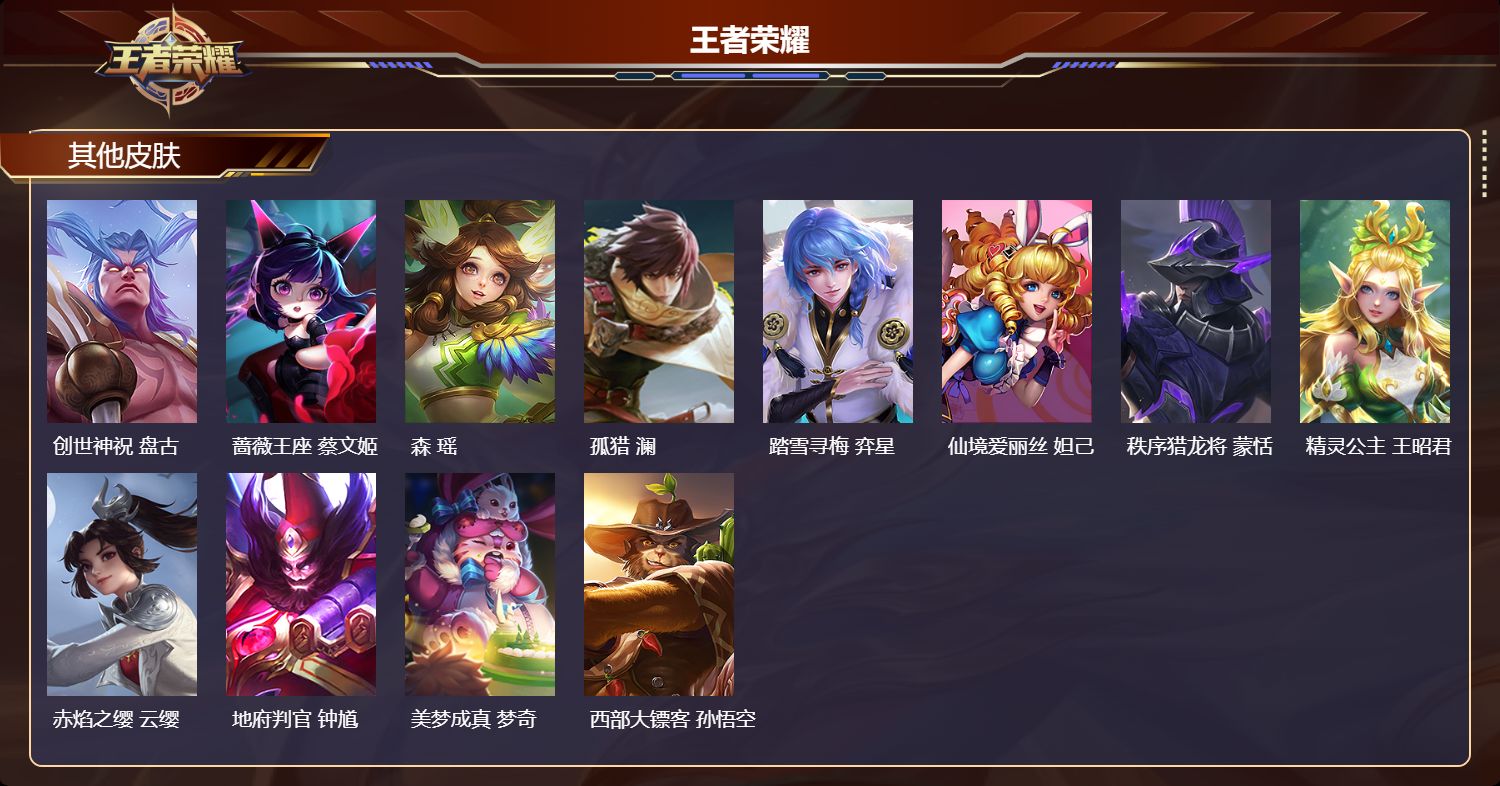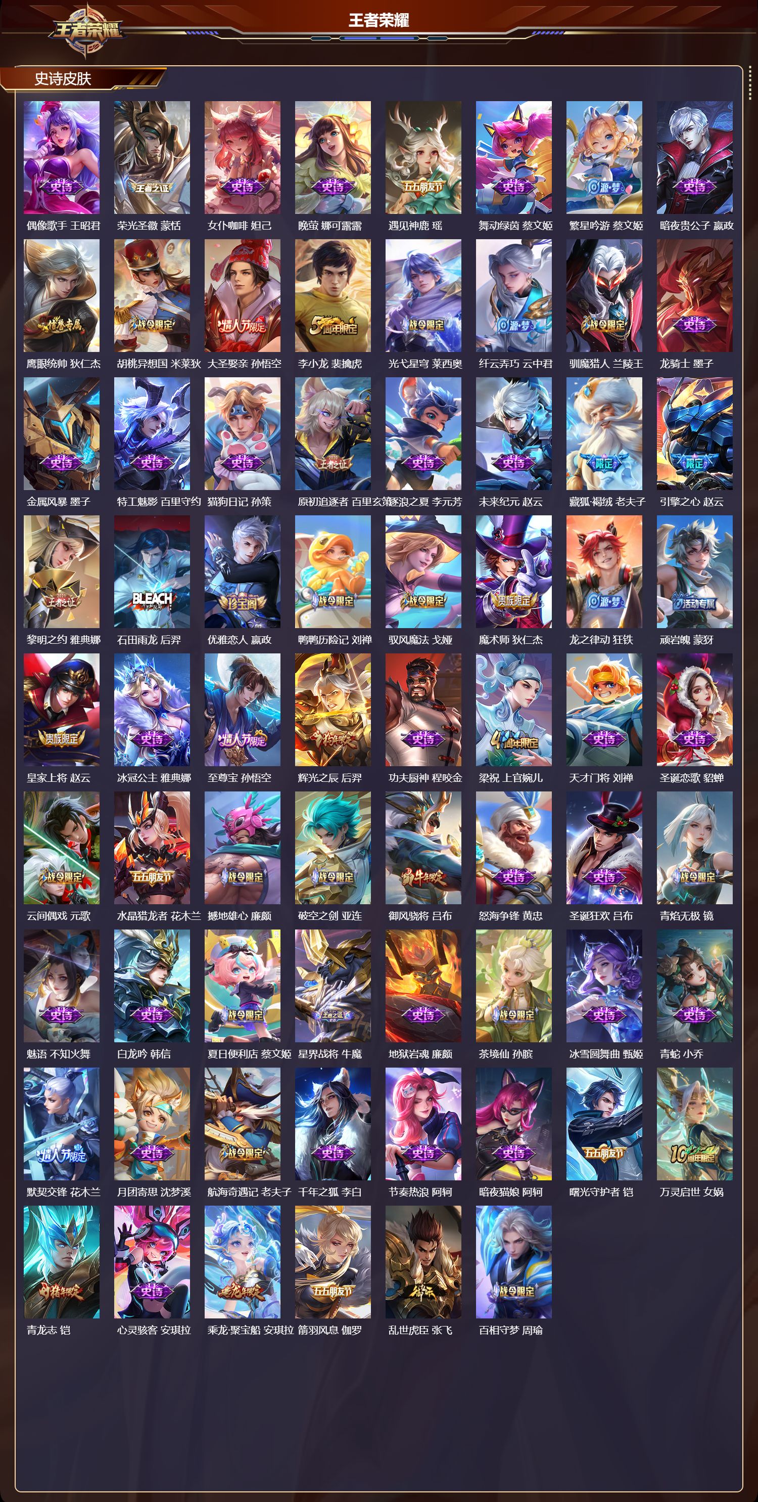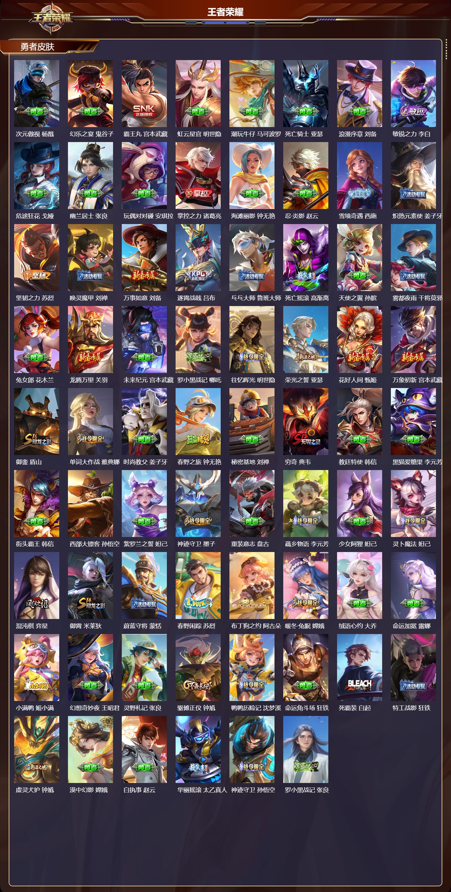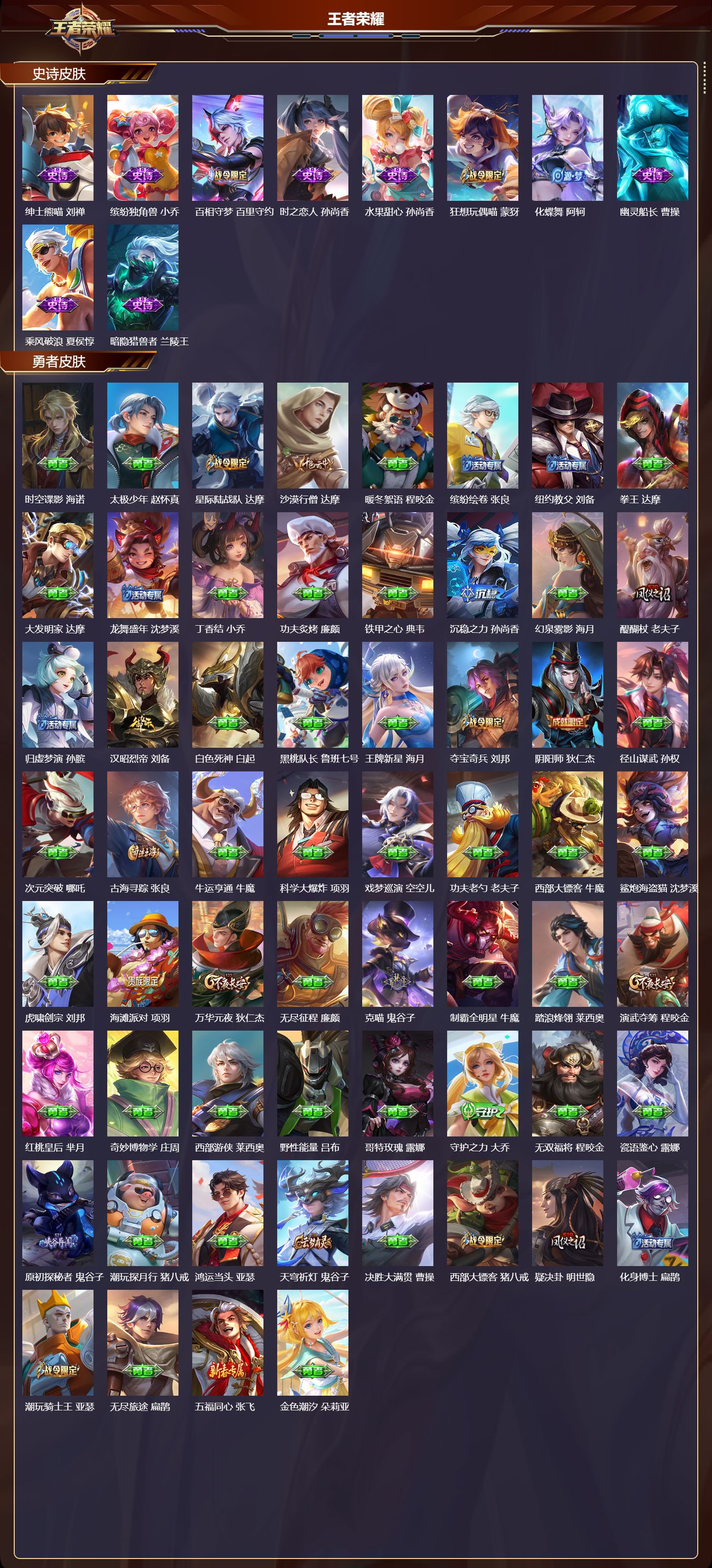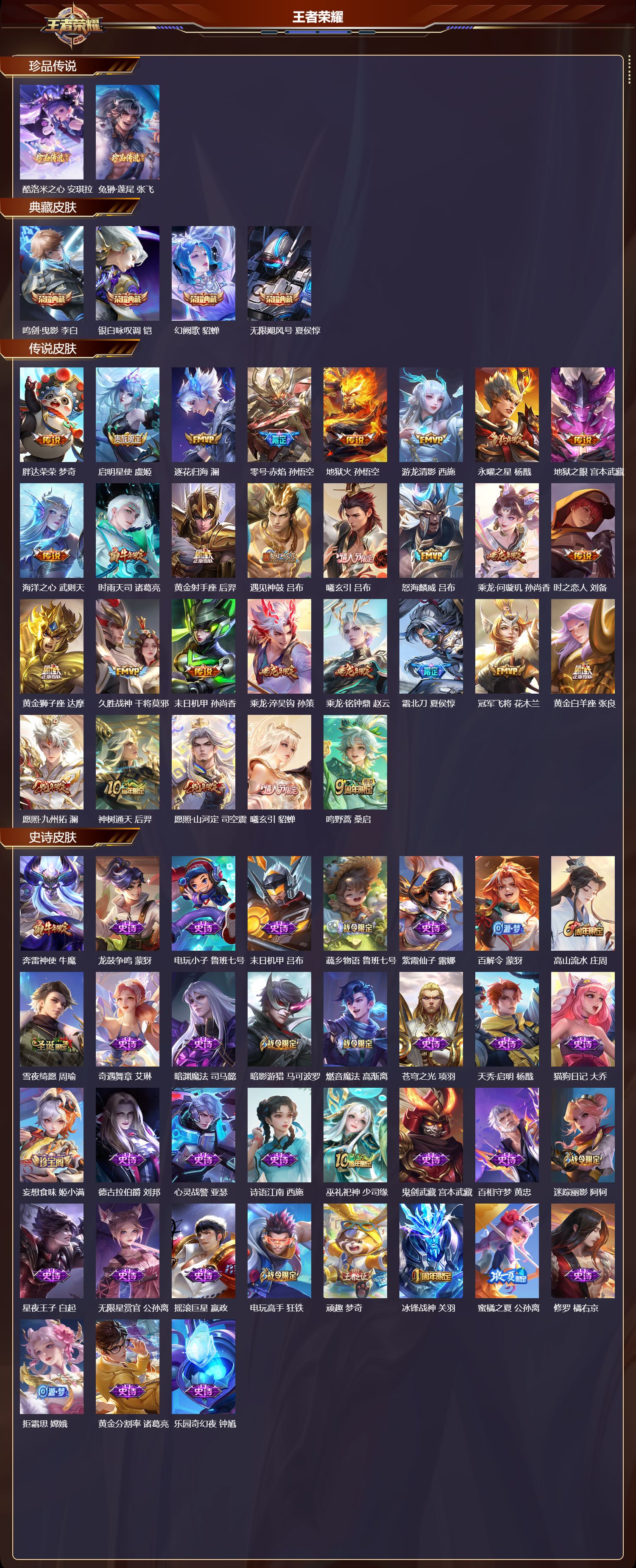 安卓微信/荣耀王者/360皮肤/127英雄/4典藏/0珍品无双/0无双/2珍品传说/29传说/115史诗/9稀有英雄【2 珍品传说】酷洛米之心 安琪拉兔狲·蓬尾 张飞【4 典藏皮肤】鸣剑·曳影 李白银白咏叹调 铠幻阙歌 貂蝉无限飓风号 夏侯惇【29 传说皮肤】胖达荣荣 梦奇启明星使 虞姬逐花归海 澜零号·赤焰 孙悟空地狱火 孙悟空游龙清影 西施永曜之星