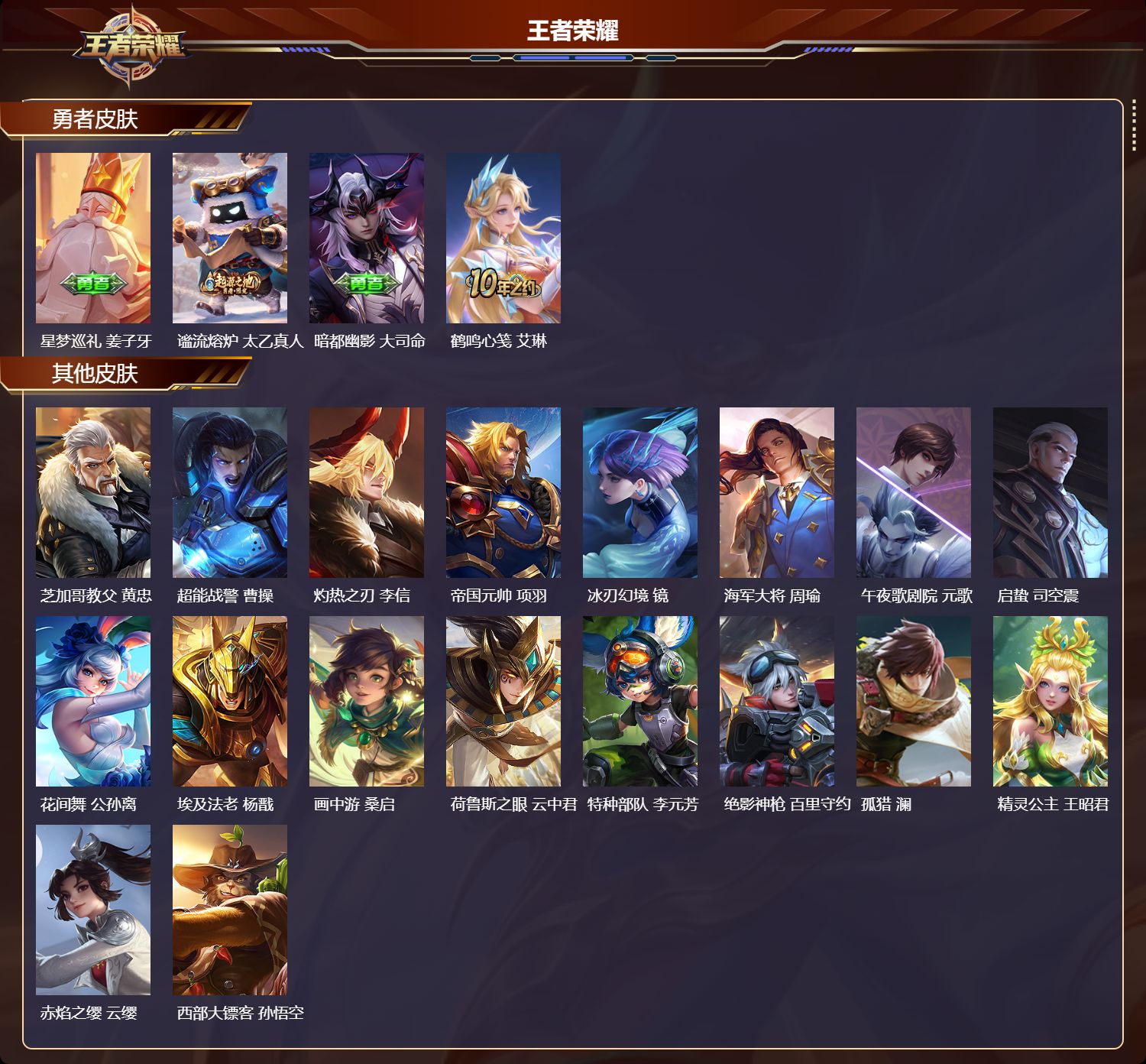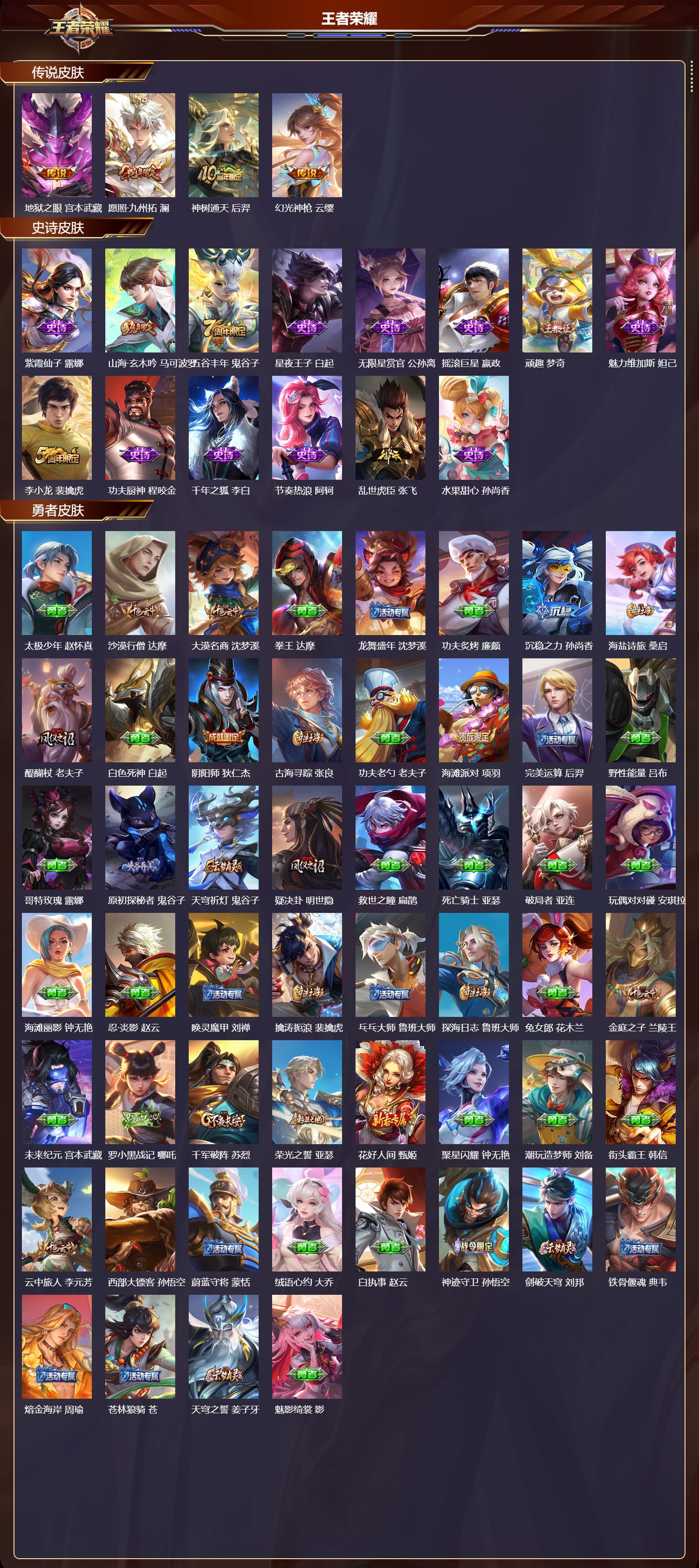 安卓qq/无双王者/91皮肤/101英雄/0典藏/0珍品无双/0无双/0珍品传说/4传说/14史诗/3稀有英雄【4 传说皮肤】地狱之眼 宫本武藏愿照·九州拓 澜神树通天 后羿幻光神呛 云缨【14 史诗皮肤】紫霞仙子 露娜山海·玄木吟 马可波罗五谷丰年 鬼谷子星夜王子 白起无限星赏官 公孙离摇滚巨星 嬴政顽趣 梦奇魅力维加斯 妲己李小龙 裴擒虎功夫厨神