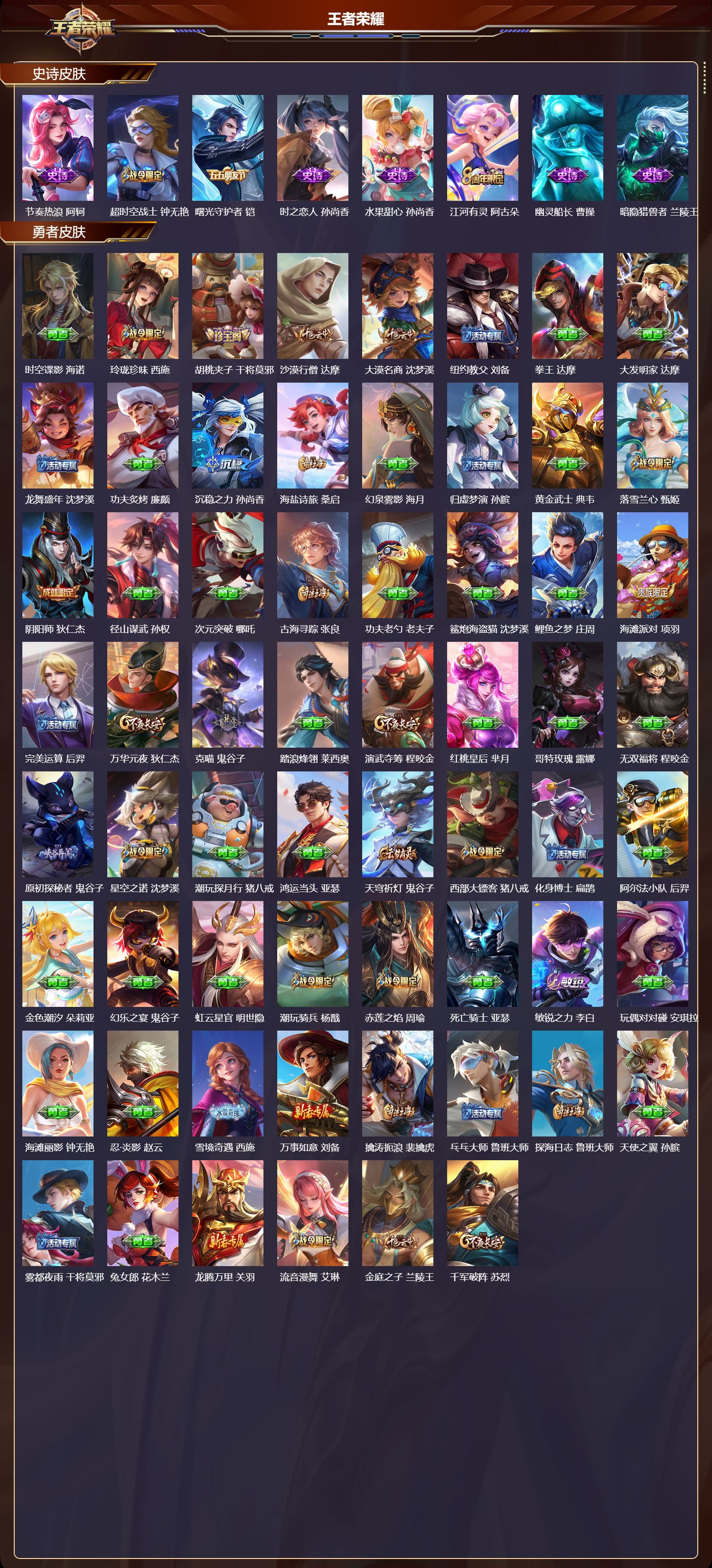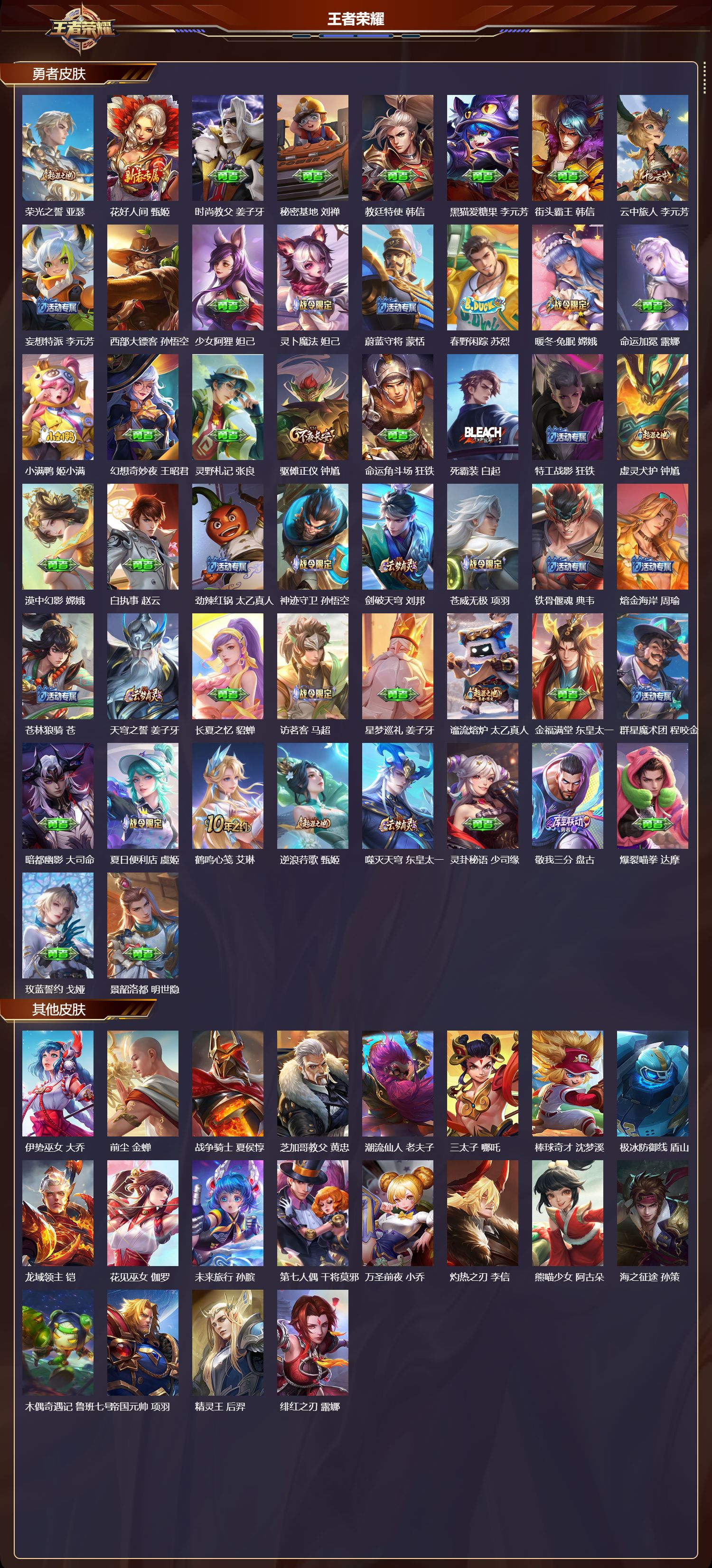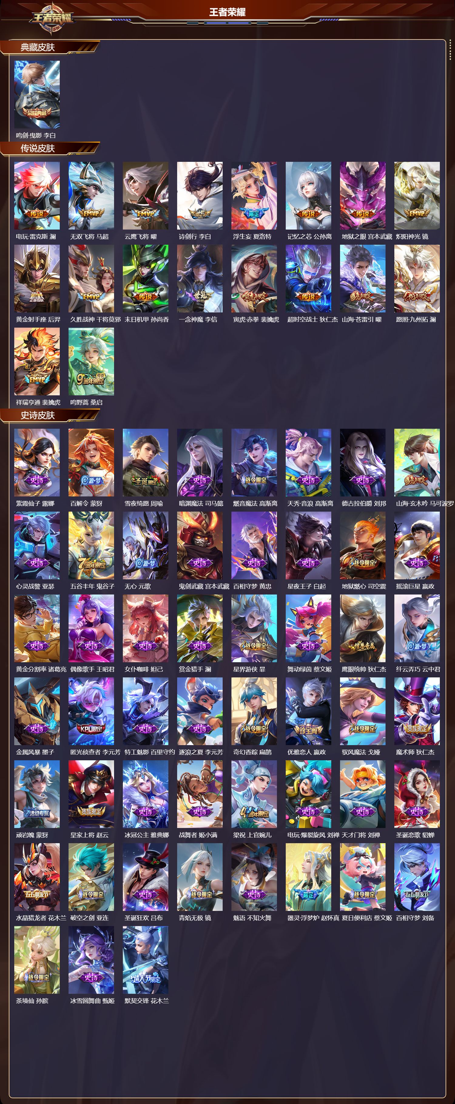 安卓qq/永恒钻石/248皮肤/126英雄/1典藏/0珍品无双/0无双/0珍品传说/18传说/59史诗/8稀有英雄【1 典藏皮肤】鸣剑·曳影 李白【18 传说皮肤】电玩·雷克斯 澜无双飞将 马超云鹰飞将 曜诗剑行 李白浮生妄 夏洛特记忆之芯 公孙离地狱之眼 宫本武藏炽阳神光 镜黄金射手座 后羿久胜战神 干将莫邪末日机甲 孙尚香一念神魔 李信寅虎·赤拳 裴擒虎超时空战士