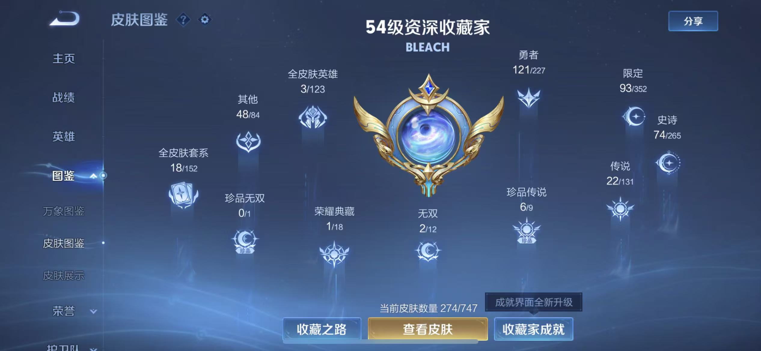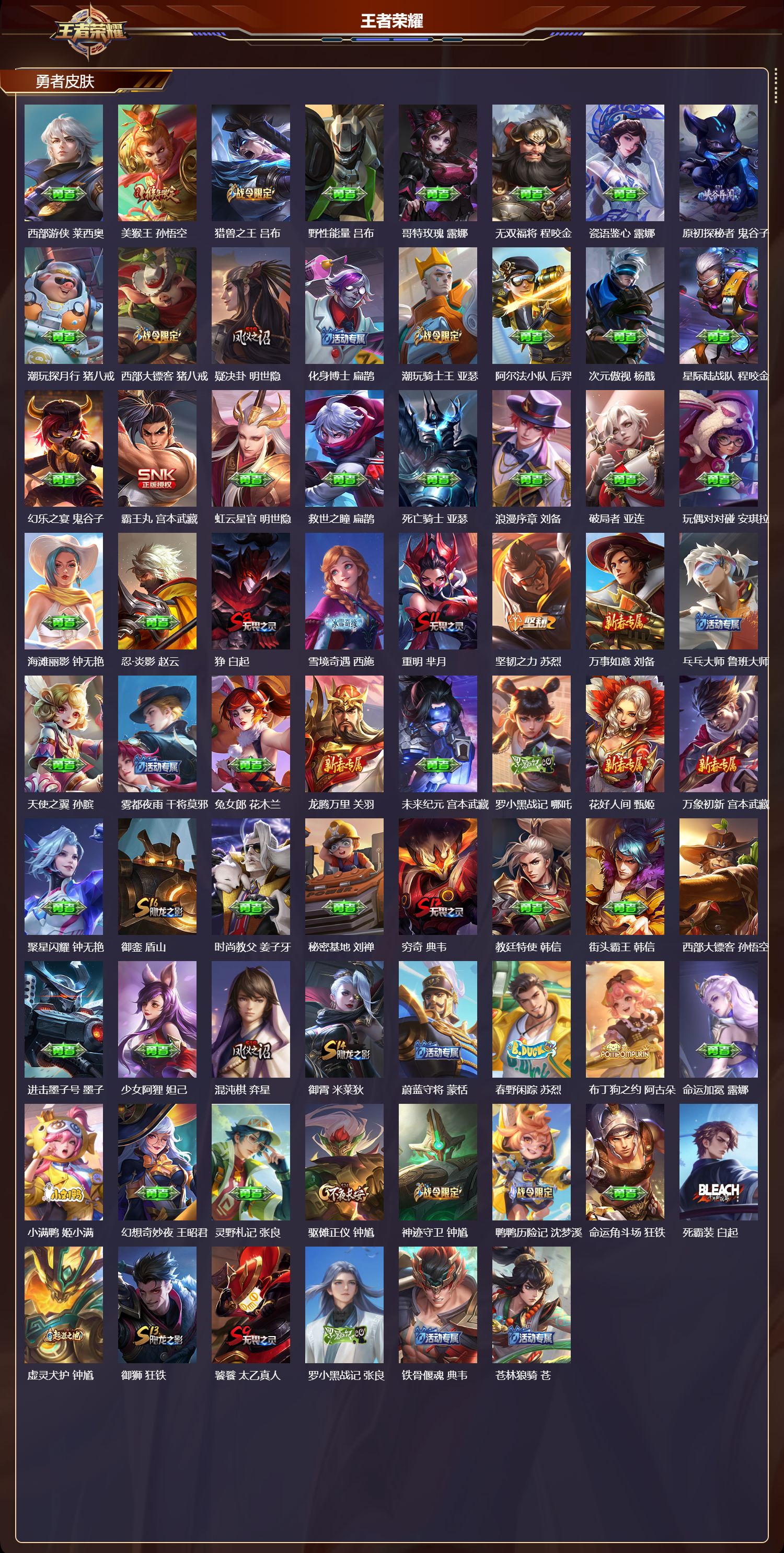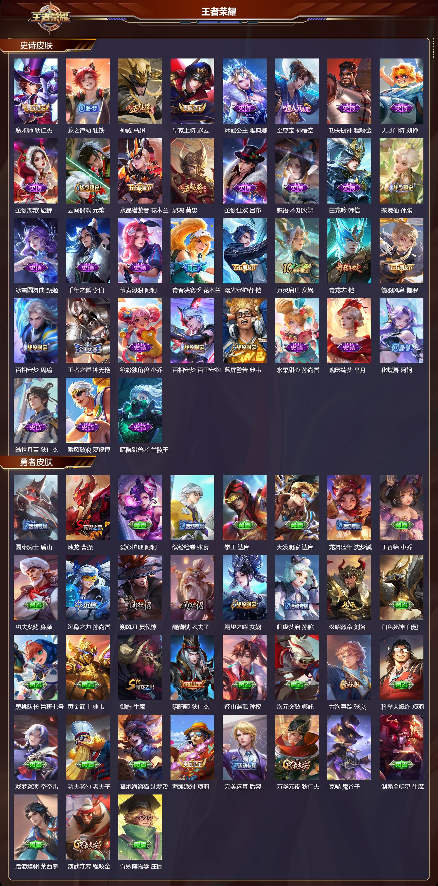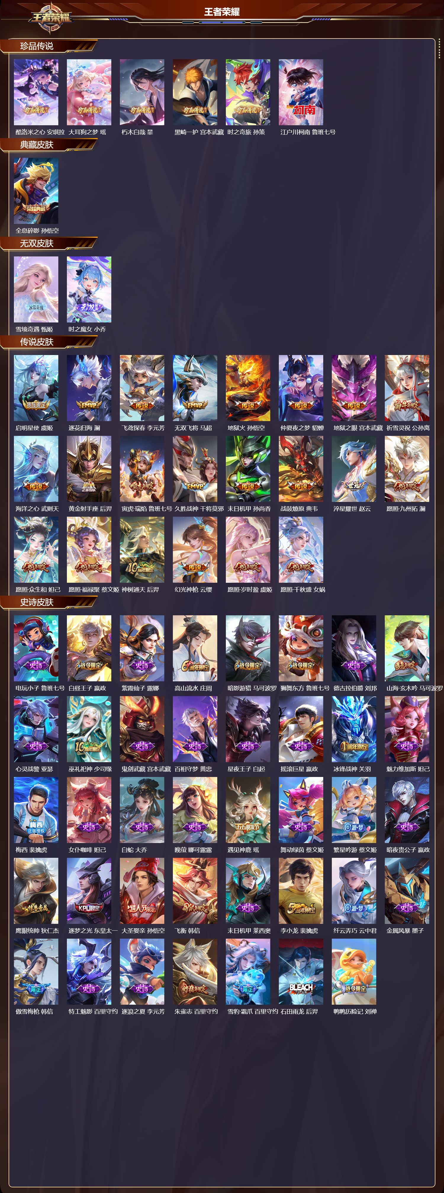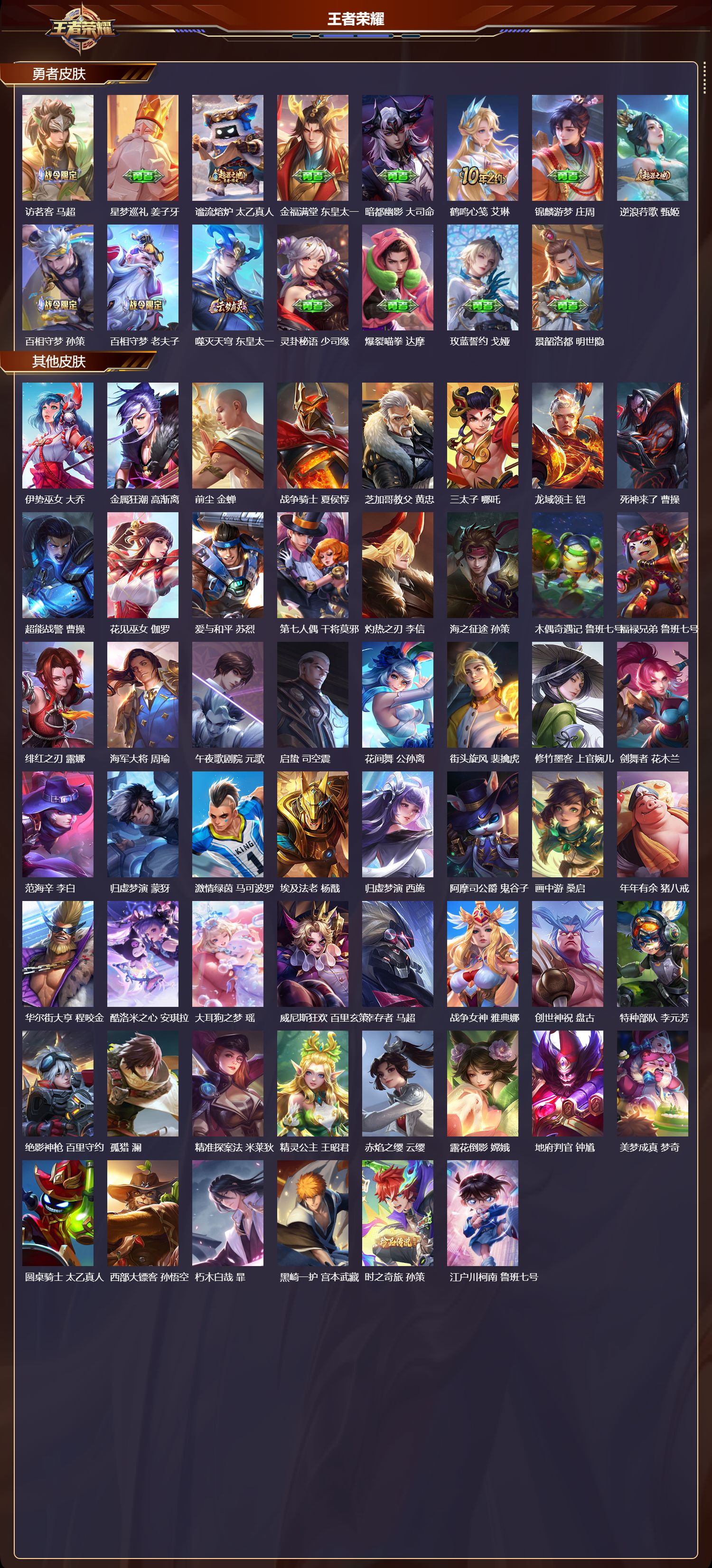苹果qq/非凡王者/274皮肤/127英雄/1典藏/0珍品无双/2无双/6珍品传说/22传说/74史诗/9稀有英雄【6 珍品传说】酷洛米之心 安琪拉大耳狗之梦 瑶朽木白哉 暃黑崎一护 宫本武藏时之奇旅 孙策江户川柯南 鲁班七号【1 典藏皮肤】全息碎影 孙悟空【2 无双皮肤】雪境奇遇 甄姬时之魔女 小乔【22 传说皮肤】启明星使 虞姬逐花归海 澜飞鸢探春 李元芳无双飞将 马超