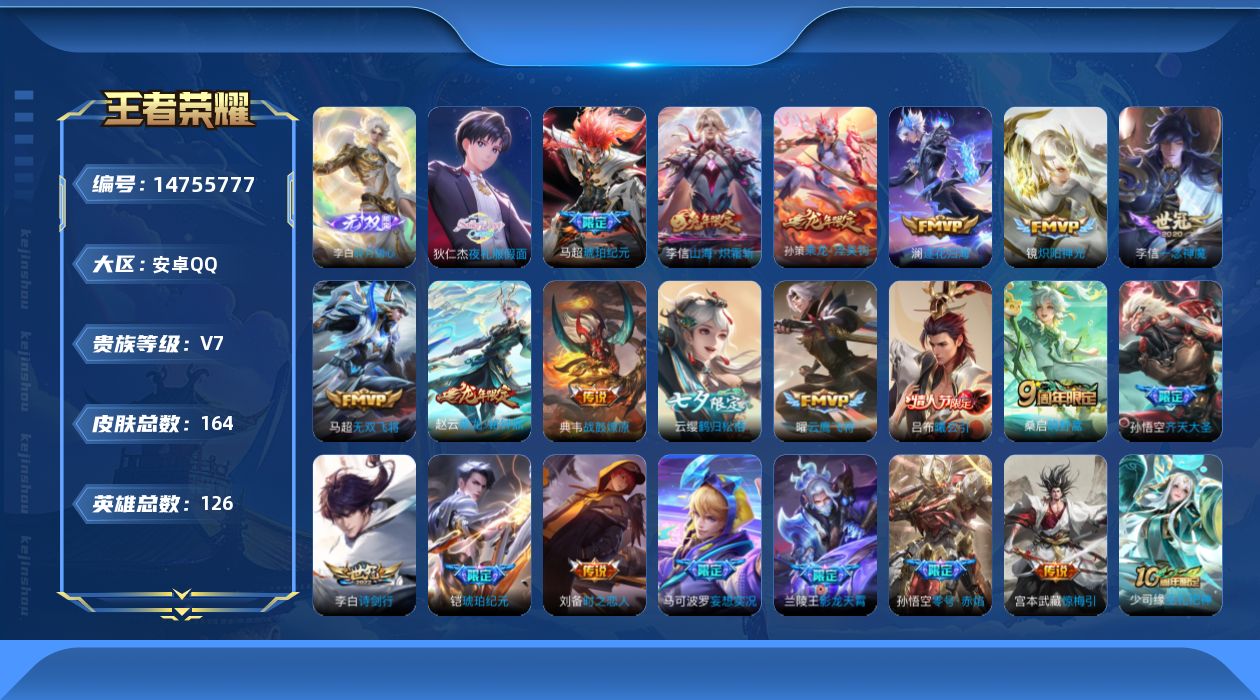 [14755777]【编号04762 可秒换绑】【店长推荐超值捡漏号!1无双23传说!荣耀水晶夺宝已经301抽!】 安卓q-v7-最强王者段位-126英雄-164皮肤-1无双-23传说-50史诗 【英雄全皮】:李信全皮 【无双皮肤】:李白碎月剑心 【传说皮肤】:后羿神树通天,桑启鸣野蒿,吕布曦玄引,典韦战鼓燎原,孙策乘龙淬吴钩,赵云乘龙铭钟鼎,马超琥珀纪元,铠琥珀纪元,澜逐花归海,狄仁杰夜礼服假面,兰陵王影龙天霄,宫本武藏惊梅引,云缨鹤归松栖,马可波罗妄想实况,孙悟空齐天大圣,李信山海炽霜斩,李白诗剑行,马超无双飞将,镜炽阳神光,孙悟空零号赤焰,曜云鹰飞将,李信一念神魔,刘备时之恋人 【限定皮肤】:虞姬夏日便利店,狄仁杰阴阳师,赵云皇家上将,芈月幻夜卜梦,吕布猎兽之王,马可波罗妄想实况,狄仁杰魔术师,达摩沙漠行僧,项羽海滩派对,兰陵王影龙天霄,兰陵王金庭之子,孙悟空零号赤焰,孙悟空齐天大圣,后羿如梦令,刘备百相守梦,李元芳云中旅人,鬼谷子五谷丰年,黄忠火炮绅士,公孙离玉兔公主,沈梦溪大漠名商,裴擒虎李小龙,裴擒虎擒涛扼浪,米莱狄胡桃异想国,云中君时之祈愿,李信山海炽霜斩,嫦娥拒霜思,西施玲珑珍味,鲁班大师探海日志,桑启海盐诗旅,戈娅驭风魔法,艾琳女武神,艾琳流音漫舞,赵怀真鹤归松栖,云缨鹤归松栖,司空震地狱燃心,阿古朵江河有灵,张良古海寻踪,狄仁杰夜礼服假面,高渐离燃音魔法,妲己灵卜魔法,鬼谷子天穹祈灯,李白碎月剑心,伽罗琥珀纪元,铠琥珀纪元,马超琥珀纪元,孙策乘龙淬吴钩,赵云乘龙铭钟鼎,吕布曦玄引,百里玄策超元猎域,沈梦溪龙舞盛年,刘邦剑破天穹,程咬金群星魔术团,刘备异域游侠 【年限皮肤】:李信山海炽霜斩,孙策乘龙淬吴钩,赵云乘龙铭钟鼎 【赛季限定】:达摩沙漠行僧,兰陵王金庭之子,张良古海寻踪,李元芳云中旅人,沈梦溪大漠名商,裴擒虎擒涛扼浪,鲁班大师探海日志,桑启海盐诗旅,鬼谷子天穹祈灯,刘邦剑破天穹 【战令限定】:虞姬夏日便利店,芈月幻夜卜梦,吕布猎兽之王,艾琳流音漫舞,黄忠火炮绅士,米莱狄胡桃异想国,西施玲珑珍味,司空震地狱燃心,戈娅驭风魔法,高渐离燃音魔法,妲己灵卜魔法 【史诗皮肤】:露娜紫霞仙子,赵云皇家上将,甄姬冰雪圆舞曲,王昭君偶像歌手,狄仁杰魔术师,宫本武藏鬼剑武藏,孙尚香水果甜心,嬴政摇滚巨星,妲己魅力维加斯,妲己女仆咖啡,墨子龙骑士,墨子金属风暴,曹操幽灵船长,