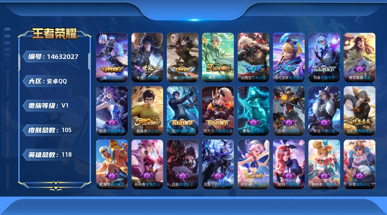 [14632027]连体和平 安卓q-v0-尊贵铂金ii段位-118英雄-105皮肤-6传说-25史诗 【传说皮肤】:桑启鸣野蒿,澜逐花归海,马可波罗妄想实况,孙悟空齐天大圣,曜云鹰飞将,李信一念神魔 【限定皮肤】:姜子牙天穹之誓,狄仁杰阴阳师,赵云皇家上将,孙尚香蔷薇恋人,马可波罗妄想实况,狄仁杰魔术师,项羽海滩派对,孙悟空齐天大圣,刘备百相守梦,裴擒虎李小龙,裴擒虎擒涛扼浪,鲁班大师探海日志,桑启海盐诗旅,阿古朵江河有灵,张良古海寻踪,鬼谷子天穹祈灯,沈梦溪龙舞盛年,刘邦剑破天穹,程咬金群星魔术团,周瑜熔金海岸 【赛季限定】:张良古海寻踪,裴擒虎擒涛扼浪,鲁班大师探海日志,桑启海盐诗旅,鬼谷子天穹祈灯,刘邦剑破天穹,姜子牙天穹之誓 【史诗皮肤】:赵云皇家上将,甄姬冰雪圆舞曲,狄仁杰魔术师,宫本武藏鬼剑武藏,孙尚香蔷薇恋人,孙尚香水果甜心,妲己魅力维加斯,墨子金属风暴,曹操幽灵船长,李白千年之狐,吕布末日机甲,花木兰水晶猎龙者,夏侯惇乘风破浪,小乔缤纷独角兽,百里守约特工魅影,铠曙光守护者,蔡文姬舞动绿茵,白起星夜王子,阿轲节奏热浪,孙策猫狗日记,狄仁杰鹰眼统帅,娜可露露晚萤,裴擒虎李小龙,刘备百相守梦,阿古朵江河有灵 【其他皮肤】:项羽海滩派对,韩信教廷特使,韩信街头霸王,露娜哥特玫瑰,达摩大发明家,赵云白执事,赵云忍炎影,白起白色死神,牛魔西部大镖客,宫本武藏未来纪元,典韦黄金武士,亚瑟死亡骑士,花木兰兔女郎,刘备万事如意,狄仁杰阴阳师,狂铁命运角斗场,老夫子功夫老勺,诸葛亮掌控之力,李白敏锐之力,鬼谷子幻乐之宴,苏烈坚韧之力,大乔守护之力,明世隐虹云星官,吕布野性能量,孙膑归虚梦演,狂铁特工战影,鲁班大师乓乓大师,刘禅唤灵魔甲,桑启海盐诗旅,白起乐园追猎者,赵怀真太极少年,裴擒虎擒涛扼浪,太乙真人劲辣红锅,莱西奥西部游侠,鲁班大师探海日志,姬小满零食大作战,李元芳妄想特派,张良古海寻踪,后羿完美运算,程咬金暖冬絮语,鬼谷子天穹祈灯,嫦娥漠中幻影,沈梦溪龙舞盛年,刘邦剑破天穹,程咬金群星魔术团,姜子牙天穹之誓,周瑜熔金海岸,太乙真人谧流熔炉,明世隐景韶洛都,戈娅玫蓝誓约,刘备浪漫序章,苏烈春野闲踪,张良灵野札记,阿古朵布丁狗之约,露娜命运加冕,露娜绯红之刃,花木兰剑舞者,孙悟空西部大镖客,后羿精灵王,马可波罗激情绿茵,诸葛亮星航指挥官,铠龙域领主,百里守约绝影神呛,梦奇美梦成真