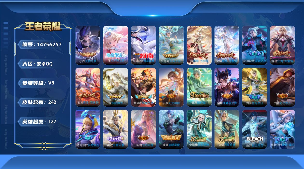 [14756257]安卓q-v8-最强王者段位-127英雄-242皮肤-1典藏皮肤-2珍品传说-17传说-76史诗 【英雄全皮】:苍全皮,海月全皮,蒙恬全皮,影全皮 【荣耀典藏】:小乔天鹅之梦 【珍品传说】:马可波罗怪盗基德,瑶大耳狗之梦 【传说皮肤】:公孙离云诺千山,女娲愿照千秋盛,澜愿照九州拓,云缨幻光神呛,裴擒虎祥瑞亨通,嬴政玄雷天君,桑启鸣野蒿,海月金乌负日,孙策乘龙淬吴钩,马可波罗妄想实况,李信山海炽霜斩,马可波罗深海之息,王昭君乞巧织情,镜炽阳神光,虞姬启明星使,刘备时之恋人,貂蝉仲夏夜之梦 【限定皮肤】:暃埋骨钱,蔡文姬夏日便利店,虞姬夏日便利店,姜子牙天穹之誓,狄仁杰阴阳师,赵云皇家上将,孙尚香蔷薇恋人,阿轲迷踪丽影,钟无艳超时空战士,扁鹊奇幻香踪,白起夜都怪侠,元歌无心,甄姬落雪兰心,马可波罗深海之息,马可波罗山海玄木吟,马可波罗妄想实况,狄仁杰魔术师,项羽海滩派对,安琪拉魔法小厨娘,王昭君午后时光,李元芳匿光侦查者,李元芳云中旅人,虞姬启明星使,杨玉环寅虎心曲,杨戬潮玩骑兵,雅典娜黎明之约,鬼谷子五谷丰年,百里玄策原初追逐者,梦奇顽趣,沈梦溪星空之诺,沈梦溪大漠名商,裴擒虎擒涛扼浪,云中君纤云弄巧,李信山海炽霜斩,上官婉儿梁祝,嫦娥暖冬兔眠,西施玲珑珍味,鲁班大师探海日志,桑启海盐诗旅,暃星界游侠,戈娅驭风魔法,艾琳流音漫舞,司空震地狱燃心,阿古朵江河有灵,张良古海寻踪,蒙犽百解令,蒙恬荣光圣徽,高渐离燃音魔法,妲己灵卜魔法,鬼谷子天穹祈灯,大乔乘龙忆丹青,安琪拉乘龙聚宝船,孙策乘龙淬吴钩,百里玄策超元猎域,沈梦溪龙舞盛年,李元芳蔬乡物语,海月金乌负日,刘邦剑破天穹,程咬金群星魔术团,镜青焰无极,项羽苍威无极,海诺心动手记,周瑜熔金海岸 【年限皮肤】:杨玉环寅虎心曲,马可波罗山海玄木吟,李信山海炽霜斩,大乔乘龙忆丹青,安琪拉乘龙聚宝船,孙策乘龙淬吴钩 【赛季限定】:张良古海寻踪,李元芳云中旅人,雅典娜黎明之约,百里玄策原初追逐者,梦奇顽趣,沈梦溪大漠名商,裴擒虎擒涛扼浪,鲁班大师探海日志,桑启海盐诗旅,鬼谷子天穹祈灯,蒙恬荣光圣徽,刘邦剑破天穹,姜子牙天穹之誓 【战令限定】:蔡文姬夏日便利店,虞姬夏日便利店,阿轲迷踪丽影,钟无艳超时空战士,扁鹊奇幻香踪,白起夜都怪侠,甄姬落雪兰心,王昭君午后时光,艾琳流音漫舞,杨戬潮玩骑兵,沈梦溪星空之诺,嫦娥暖冬兔眠,西施玲珑珍