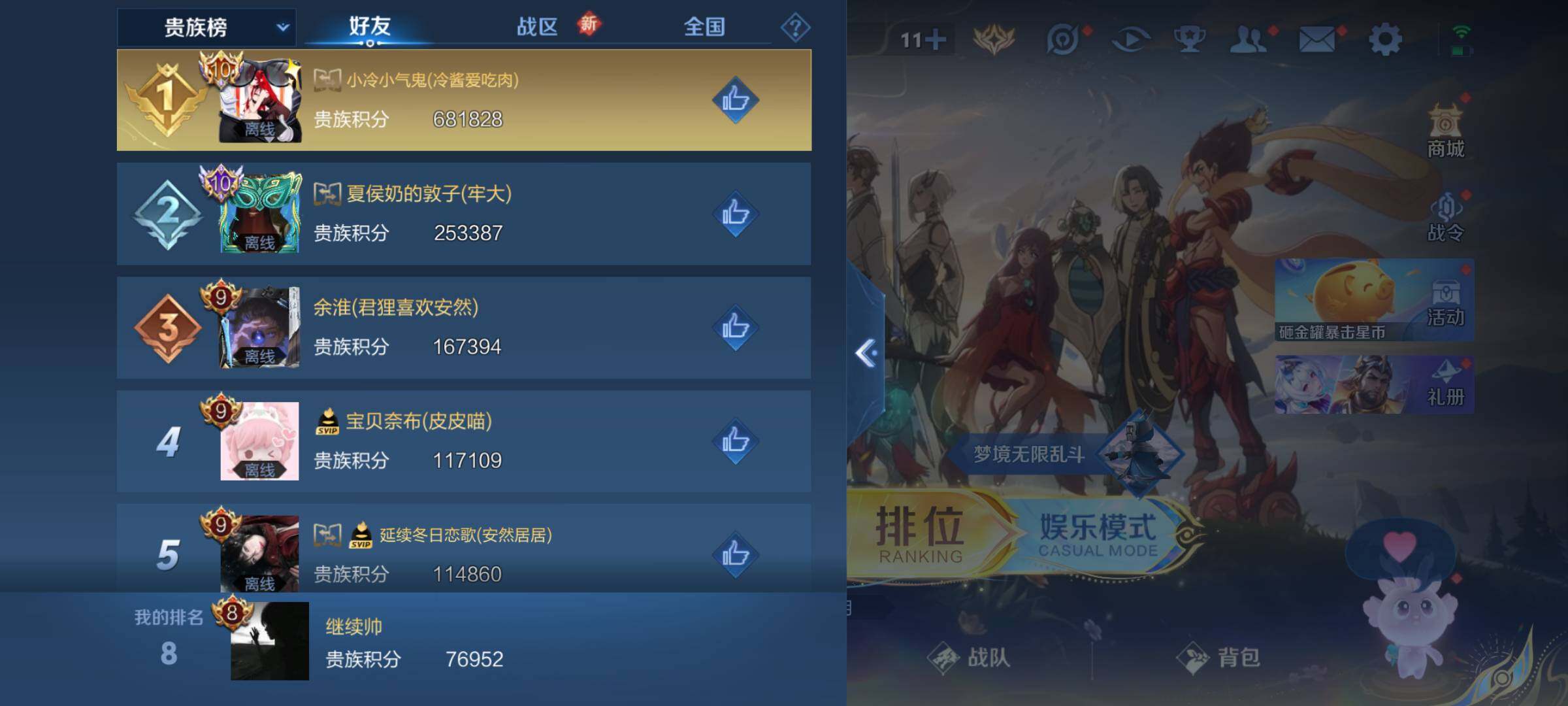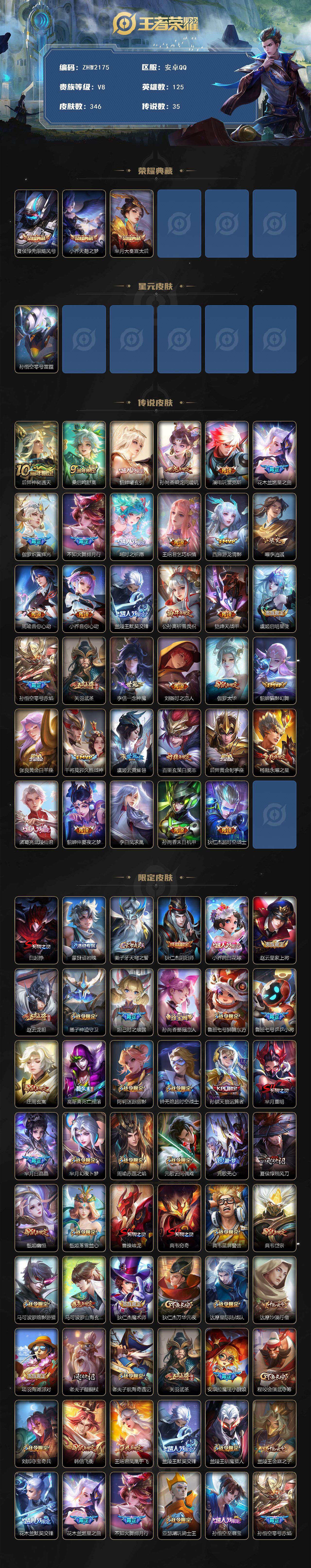 【店主推荐捡漏号!可直接换绑】发育路33段,安卓q-v8-最强王者段位-125英雄-346皮肤-3典藏皮肤-1星传说-35传说-114史诗 【英雄全皮】:刘邦全皮,蒙恬全皮 【荣耀典藏】:夏侯惇无限飓风号,小乔天鹅之梦,芈月大秦宣太后 【传说皮肤】:后羿神树通天,桑启鸣野蒿,貂蝉曦玄引,孙尚香乘龙问璇玑,澜电玩雷克斯,花木兰燃星之曲,伽罗炽翼辉光,不知火舞绯月行,瑶时之祈愿,王昭君乞巧织情,西施游龙清影,曜李 ,周瑜音你心动,小乔音你心动,兰陵王默契交锋,公孙离祈雪灵祝,铠绛天战甲,虞姬启明星使,孙悟空零号赤焰,关羽武圣,李信一念神魔,刘备时之恋人,伽罗太华,貂蝉猫影幻舞,张良黄金白羊座,干将莫邪久胜战神,虞姬云霓雀翎,百里玄策白虎志,后羿黄金射手座,杨戬永曜之星,诸葛亮武陵仙君,貂蝉仲夏夜之梦,李白凤求凰,孙尚香末日机甲,狄仁杰超时空战士 【限定皮肤】:白起狰,蒙犽顽岩魄,姜子牙天穹之誓,狄仁杰阴阳师,小乔纯白花嫁,赵云皇家上将,赵云龙胆,墨子神迹守卫,妲己时之彼端,孙尚香蔷薇恋人,鲁班七号狮舞东方,鲁班七号乒乒小将,庄周玄嵩,高渐离死亡摇滚,阿轲迷踪丽影,钟无艳超时空战士,孙膑天狼运算者,芈月重明,芈月白晶晶,芈月幻夜卜梦,周瑜赤莲之焰,元歌云间偶戏,元歌无心,夏侯惇朔风刀,甄姬幽恒,甄姬落雪兰心,曹操烛龙,典韦穷奇,典韦蓝屏警告,典韦岱宗,马可波罗暗影游猎,马可波罗山海玄木吟,狄仁杰魔术师,狄仁杰万华元夜,达摩星际陆战队,达摩沙漠行僧,项羽海滩派对,老夫子醍醐杖,老夫子航海奇遇记,关羽武圣,安琪拉魔法小厨娘,程咬金演武夺筹,刘邦夺宝奇兵,韩信飞衡,王昭君凤凰于飞,兰陵王默契交锋,兰陵王驯魔猎人,兰陵王金庭之子,花木兰默契交锋,花木兰燃星之曲,不知火舞绯月行,亚瑟潮玩骑士王,孙悟空至尊宝,孙悟空零号赤焰,牛魔御旌,后羿如梦令,李元芳银河之约,李元芳云中旅人,虞姬启明星使,钟馗神迹守卫,钟馗驱傩正仪,杨玉环遇见飞天,杨玉环寅虎心曲,杨戬永曜之星,女娲朔望之晖,雅典娜单词大作战,雅典娜黎明之约,蔡文姬奇迹圣诞,蔡文姬繁星吟游,太乙真人华丽摇滚,鬼谷子原初探秘者,鬼谷子五谷丰年,诸葛亮武陵仙君,大乔白鹤梁神女,黄忠火炮绅士,百里玄策白虎志,百里玄策原初追逐者,弈星混沌棋,梦奇顽趣,公孙离蜜橘之夏,公孙离祈雪灵祝,公孙离玉兔公主,沈梦溪星空之诺,沈梦溪大漠名商,明世隐疑决卦,裴擒虎天狼狩猎者,裴擒虎李小龙,裴擒虎擒涛扼浪,狂铁御狮,米莱狄御霄,米莱狄胡桃异想国,瑶时之祈愿,瑶山海碧波行,云中君纤云弄巧,伽罗太华,伽罗炽翼辉光,盾山御銮,猪八戒西部大镖客,上官婉儿梁祝,上官婉儿天狼绘梦者,嫦娥如梦令,嫦娥拒霜思,嫦娥暖冬兔眠,曜李 ,蒙犽狂想玩偶喵,鲁班大师探海日志,桑启海盐诗旅,暃星界游侠,蒙恬荣光圣徽,鬼谷子天穹祈灯,姬小满妄想食味,安琪拉乘龙聚宝船,孙尚香乘龙问璇玑,貂蝉曦玄引,沈梦溪龙舞盛年,刘邦剑破天穹,程咬金群星魔术团,周瑜熔金海岸 【年限皮肤】:百里玄策白虎志,杨玉环寅虎心曲,王昭君凤凰于飞,李白凤求凰,杨戬永曜之星,公孙离祈雪灵祝,伽罗太华,甄姬幽恒,韩信飞衡,典韦岱宗,庄周玄嵩,马超神威,关羽武圣,赵云龙胆,瑶山海碧波行,马可波罗山海玄木吟,伽罗炽翼辉光,安琪拉乘龙聚宝船,孙尚香乘龙问璇玑 【赛季限定】:白起狰,芈月重明,夏侯惇朔风刀,曹操烛龙,典韦穷奇,狄仁杰万华元夜,达摩沙漠行僧,老夫子醍醐杖,程咬金演武夺筹,兰陵王金庭之子,牛魔御旌,李元芳云中旅人,钟馗驱傩正仪,雅典娜黎明之约,鬼谷子原初探秘者,百里玄策原初追逐者,弈星混沌棋,梦奇顽趣,沈梦溪大漠名商,明世隐疑决卦,裴擒虎擒涛扼浪,狂铁御狮,米莱狄御霄,盾山御銮,鲁班大师探海日志,桑启海盐诗旅,鬼谷子天穹祈灯,蒙恬荣光圣徽,刘邦剑破天穹,姜子牙天穹之誓 【战令限定】:墨子神迹守卫,鲁班七号狮舞东方,阿轲迷踪丽影,钟无艳超时空战士,芈月幻夜卜梦,周瑜赤莲之焰,元歌云间偶戏,甄姬落雪兰心,典韦蓝屏警告,马可波罗暗影游猎,达摩星际陆战队,老夫子航海奇遇记,刘邦夺宝奇兵,兰陵王驯魔猎人,亚瑟潮玩骑士王,李元芳银河之约,钟馗神迹守卫,女娲朔望之晖,雅典娜单词大作战,黄忠火炮绅士,沈梦溪星空之诺,米莱狄胡桃异想国,猪八戒西部大镖客,嫦娥暖冬兔眠,蒙犽狂想玩偶喵,暃星界游侠 【史诗皮肤】:鲁班七号电玩小子,项羽苍穹之光,露娜紫霞仙子,赵云皇家上将,赵云未来纪元,貂蝉圣诞恋歌,甄姬冰雪圆舞曲,王昭君偶像歌手,狄仁杰魔术师,廉颇地狱岩魂,宫本武藏鬼剑武藏,孙尚香蔷薇恋人,孙尚香水果甜心,嬴政暗夜贵公子,嬴政摇滚巨星,妲己魅力维加斯,妲己女仆咖啡,墨子金属风暴,吕布圣诞狂欢,刘禅绅士熊喵,小乔纯白花嫁,曹操幽灵船长,李白千年之狐,吕布末日机甲,安琪拉魔法小厨娘,张飞乱世虎臣,王昭君凤凰于飞,孙悟空至尊宝,花木兰水晶猎龙者,刘邦德古拉伯爵,夏侯惇乘风破浪,小乔缤纷独角兽,兰陵王暗隐猎兽者,亚瑟心灵战警,雅典娜冰冠公主,安琪拉心灵骇客,百里守约特工魅影,铠曙光守护者,蔡文姬舞动绿茵,刘禅天才门将,公孙离蜜橘之夏,李元芳逐浪之夏,程咬金功夫厨神,白起星夜王子,阿轲节奏热浪,杨玉环遇见飞天,蔡文姬奇迹圣诞,孙策猫狗日记,大乔猫狗日记,典韦蓝屏警告,伽罗箭羽风息,裴擒虎天狼狩猎者,鲁班七号狮舞东方,狄仁杰鹰眼统