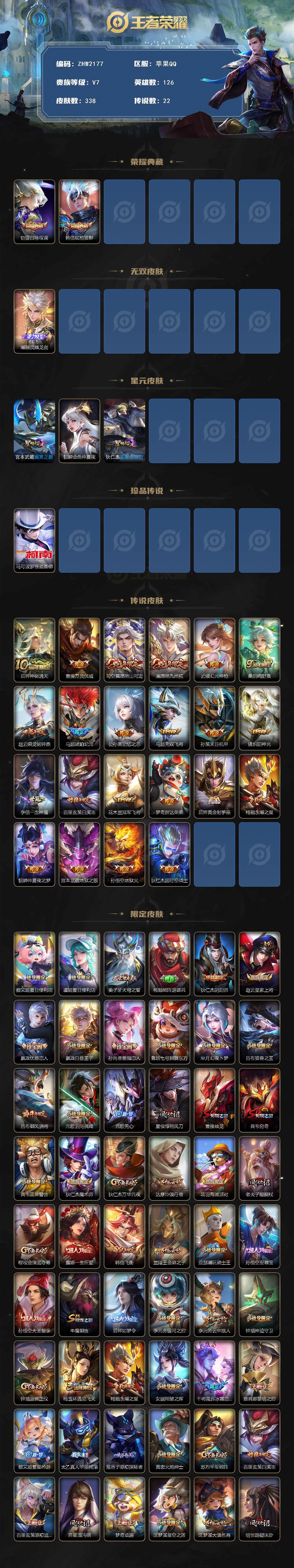 【店主推荐捡漏号!可直接换绑】打野41段,苹果q-v7-最强王者段位-126英雄-338皮肤-2典藏皮肤-1无双-1珍品传说-3星传说-22传说-87史诗 【英雄全皮】:孙权全皮,蒙恬全皮,司空震全皮,空空儿全皮 【荣耀典藏】:铠银白咏叹调,韩信弑呛猎影 【无双皮肤】:曜器灵螭龙剑 【珍品传说】:马可波罗怪盗基德 【传说皮肤】:后羿神树通天,曹操万灵伏威,司空震愿照山河定,澜愿照九州拓,云缨幻光神呛,桑启鸣野蒿,赵云乘龙铭钟鼎,马超琥珀纪元,公孙离记忆之芯,马超无双飞将,孙策末日机甲,镜炽阳神光,李信一念神魔,百里玄策白虎志,花木兰冠军飞将,梦奇胖达荣荣,后羿黄金射手座,杨戬永曜之星,貂蝉仲夏夜之梦,宫本武藏地狱之眼,孙悟空地狱火,狄仁杰超时空战士 【限定皮肤】:蔡文姬夏日便利店,虞姬夏日便利店,姜子牙天穹之誓,杨戬破阵退雄兵,狄仁杰阴阳师,赵云皇家上将,嬴政优雅恋人,嬴政白昼王子,孙尚香蔷薇恋人,鲁班七号狮舞东方,芈月幻夜卜梦,吕布猎兽之王,吕布御风骁将,元歌云间偶戏,元歌无心,夏侯惇朔风刀,曹操烛龙,典韦穷奇,典韦蓝屏警告,狄仁杰魔术师,狄仁杰万华元夜,达摩沙漠行僧,项羽海滩派对,老夫子醍醐杖,程咬金演武夺筹,露娜一生所爱,韩信飞衡,兰陵王金庭之子,亚瑟潮玩骑士王,孙悟空至尊宝,孙悟空大圣娶亲,牛魔御旌,后羿如梦令,李元芳银河之约,李元芳云中旅人,钟馗神迹守卫,钟馗驱傩正仪,杨玉环遇见飞天,杨戬永曜之星,女娲朔望之晖,干将莫邪冰霜恋舞曲,雅典娜黎明之约,蔡文姬繁星吟游,太乙真人华丽摇滚,鬼谷子原初探秘者,黄忠火炮绅士,苏烈千军破阵,百里玄策白虎志,百里玄策原初追逐者,弈星混沌棋,梦奇顽趣,沈梦溪星空之诺,沈梦溪大漠名商,明世隐疑决卦,裴擒虎李小龙,裴擒虎擒涛扼浪,狂铁御狮,米莱狄御霄,盾山御銮,上官婉儿梁祝,西施玲珑珍味,鲁班大师探海日志,镜匿光追影者,桑启海盐诗旅,戈娅驭风魔法,艾琳流音漫舞,司空震地狱燃心,阿古朵江河有灵,张良古海寻踪,蒙恬荣光圣徽,高渐离燃音魔法,妲己灵卜魔法,鬼谷子天穹祈灯,马超琥珀纪元,姬小满妄想食味,赵云乘龙铭钟鼎,沈梦溪龙舞盛年,鲁班七号蔬乡物语,李元芳蔬乡物语,刘邦剑破天穹,程咬金群星魔术团,镜青焰无极,项羽苍威无极,芈月浮光幕影,周瑜熔金海岸 【年限皮肤】:百里玄策白虎志,杨戬永曜之星,吕布御风骁将,韩信飞衡,马超神威,赵云乘龙铭钟鼎 【赛季限定】:夏侯惇朔风刀,曹操烛龙,典韦穷奇,狄仁杰万华元夜,达摩沙漠行僧,老夫子醍醐杖,程咬金演武夺筹,兰陵王金庭之子,张良古海寻踪,牛魔御旌,李元芳云中旅人,钟馗驱傩正仪,雅典娜黎明之约,鬼谷子原初探秘者,苏烈千军破阵,百里玄策原初追逐者,弈星混沌棋,梦奇顽趣,沈梦溪大漠名商,明世隐疑决卦,裴擒虎擒涛扼浪,狂铁御狮,米莱狄御霄,盾山御銮,鲁班大师探海日志,桑启海盐诗旅,鬼谷子天穹祈灯,蒙恬荣光圣徽,刘邦剑破天穹,姜子牙天穹之誓 【战令限定】:蔡文姬夏日便利店,虞姬夏日便利店,嬴政白昼王子,鲁班七号狮舞东方,芈月幻夜卜梦,吕布猎兽之王,元歌云间偶戏,典韦蓝屏警告,艾琳流音漫舞,亚瑟潮玩骑士王,李元芳银河之约,钟馗神迹守卫,女娲朔望之晖,黄忠火炮绅士,沈梦溪星空之诺,西施玲珑珍味,司空震地狱燃心,戈娅驭风魔法,高渐离燃音魔法,妲己灵卜魔法,鲁班七号蔬乡物语,李元芳蔬乡物语,镜青焰无极,项羽苍威无极 【史诗皮肤】:露娜紫霞仙子,阿轲暗夜猫娘,赵云皇家上将,貂蝉圣诞恋歌,甄姬冰雪圆舞曲,王昭君偶像歌手,狄仁杰魔术师,廉颇地狱岩魂,宫本武藏鬼剑武藏,孙尚香蔷薇恋人,孙尚香水果甜心,嬴政优雅恋人,嬴政摇滚巨星,妲己魅力维加斯,妲己女仆咖啡,墨子龙骑士,墨子金属风暴,吕布圣诞狂欢,刘禅绅士熊喵,曹操幽灵船长,吕布末日机甲,张飞乱世虎臣,孙悟空至尊宝,花木兰水晶猎龙者,刘邦德古拉伯爵,夏侯惇乘风破浪,小乔缤纷独角兽,兰陵王暗隐猎兽者,诸葛亮黄金分割率,亚瑟心灵战警,安琪拉心灵骇客,百里守约特工魅影,铠曙光守护者,蔡文姬舞动绿茵,刘禅天才门将,李元芳逐浪之夏,程咬金功夫厨神,白起星夜王子,阿轲节奏热浪,杨玉环遇见飞天,嬴政白昼王子,孙策猫狗日记,大乔猫狗日记,干将莫邪冰霜恋舞曲,露娜一生所爱,孙悟空大圣娶亲,典韦蓝屏警告,伽罗箭羽风息,鲁班七号狮舞东方,狄仁杰鹰眼统帅,上官婉儿梁祝,蔡文姬繁星吟游,李元芳银河之约,韩信飞衡,后羿如梦令,马超神威,百里玄策原初追逐者,裴擒虎李小龙,元歌云间偶戏,吕布御风骁将,钟馗乐园奇幻夜,司马懿暗渊魔法,镜匿光追影者,黄忠火炮绅士,雅典娜黎明之约,元歌无心,梦奇顽趣,戈娅驭风魔法,司空震地狱燃心,阿古朵江河有灵,妲己灵卜魔法,高渐离燃音魔法,蒙恬荣光圣徽,姬小满妄想食味,鲁班七号蔬乡物语,镜青焰无极,黄忠怒海争锋,芈月浮光幕影,蔡文姬夏日便利店,亚连破空之剑,牛魔星界战将,赵怀真器灵浮梦炉,狄仁杰绮世丹青,刘禅鸭鸭历险记,狂铁龙之律动,莱西奥光弋星穹,女娲万灵启世,少司缘巫礼祀神 【其他皮肤】:项羽海滩派对,韩信教廷特使,韩信街头霸王,露娜哥特玫瑰,达摩大发明家,赵云白执事,赵云忍炎影,白起白色死神,牛魔西部大镖客,武则天东方不败,扁鹊化身博士,扁鹊救世之瞳,宫本武藏未来纪元,安琪拉玩偶对对碰,孙膑天使之翼,妲己少女阿狸,典韦黄金武士,亚瑟死亡骑士,达摩拳王,