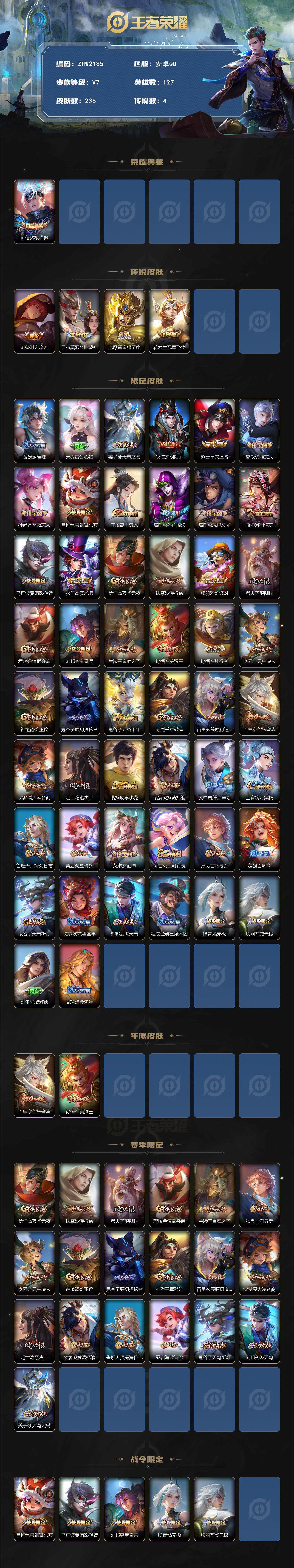 【店主推荐捡漏号!可直接换绑】安卓q-v7-最强王者段位-127英雄-236皮肤-1典藏皮肤-4传说-57史诗 【荣耀典藏】:韩信弑呛猎影 【传说皮肤】:刘备时之恋人,干将莫邪久胜战神,达摩黄金狮子座,花木兰冠军飞将 【限定皮肤】:蒙犽顽岩魄,大乔绒语心约,姜子牙天穹之誓,狄仁杰阴阳师,赵云皇家上将,嬴政优雅恋人,孙尚香蔷薇恋人,鲁班七号狮舞东方,庄周高山流水,高渐离死亡摇滚,高渐离玩趣恶龙,甄姬游园惊梦,马可波罗暗影游猎,狄仁杰魔术师,狄仁杰万华元夜,达摩沙漠行僧,项羽海滩派对,老夫子醍醐杖,程咬金演武夺筹,刘邦夺宝奇兵,兰陵王金庭之子,孙悟空美猴王,孙悟空孙行者,李元芳云中旅人,钟馗驱傩正仪,鬼谷子原初探秘者,鬼谷子五谷丰年,苏烈千军破阵,百里玄策原初追逐者,百里守约朱雀志,沈梦溪大漠名商,明世隐疑决卦,裴擒虎李小龙,裴擒虎擒涛扼浪,云中君纤云弄巧,上官婉儿梁祝,鲁班大师探海日志,桑启海盐诗旅,艾琳女武神,阿古朵江河有灵,张良古海寻踪,蒙犽百解令,鬼谷子天穹祈灯,沈梦溪龙舞盛年,刘邦剑破天穹,程咬金群星魔术团,镜青焰无极,项羽苍威无极,刘备异域游侠,周瑜熔金海岸 【年限皮肤】:百里守约朱雀志,孙悟空美猴王 【赛季限定】:狄仁杰万华元夜,达摩沙漠行僧,老夫子醍醐杖,程咬金演武夺筹,兰陵王金庭之子,张良古海寻踪,李元芳云中旅人,钟馗驱傩正仪,鬼谷子原初探秘者,苏烈千军破阵,百里玄策原初追逐者,沈梦溪大漠名商,明世隐疑决卦,裴擒虎擒涛扼浪,鲁班大师探海日志,桑启海盐诗旅,鬼谷子天穹祈灯,刘邦剑破天穹,姜子牙天穹之誓 【战令限定】:鲁班七号狮舞东方,马可波罗暗影游猎,刘邦夺宝奇兵,镜青焰无极,项羽苍威无极 【史诗皮肤】:鲁班七号电玩小子,项羽苍穹之光,赵云皇家上将,赵云未来纪元,貂蝉圣诞恋歌,甄姬冰雪圆舞曲,狄仁杰魔术师,宫本武藏鬼剑武藏,孙尚香蔷薇恋人,孙尚香水果甜心,嬴政优雅恋人,嬴政暗夜贵公子,嬴政摇滚巨星,妲己魅力维加斯,墨子金属风暴,吕布圣诞狂欢,李白千年之狐,吕布末日机甲,张飞乱世虎臣,花木兰水晶猎龙者,刘邦德古拉伯爵,兰陵王暗隐猎兽者,诸葛亮黄金分割率,甄姬游园惊梦,铠曙光守护者,刘禅天才门将,李元芳逐浪之夏,白起星夜王子,孙策猫狗日记,百里守约朱雀志,伽罗箭羽风息,鲁班七号狮舞东方,狄仁杰鹰眼统帅,上官婉儿梁祝,孙尚香时之恋人,马可波罗暗影游猎,百里玄策原初追逐者,裴擒虎李小龙,云中君纤云弄巧,孙悟空孙行者,庄周高山流水,哪吒雪上飞焰,鬼谷子五谷丰年,刘禅电玩爆裂旋风,阿古朵江河有灵,蒙犽百解令,镜青焰无极,黄忠怒海争锋,蒙犽顽岩魄,牛魔星界战将,孙膑茶境仙,阿轲化蝶舞,狂铁龙之律动,后羿石田雨龙,黄忠百相守梦,百里玄策罗小黑战记,女娲万灵启世 【其他皮肤】:项羽海滩派对,韩信教廷特使,韩信街头霸王,露娜哥特玫瑰,阿轲爱心护理,达摩大发明家,赵云白执事,赵云忍炎影,艾琳女武神,程咬金爱与正义,白起白色死神,牛魔西部大镖客,扁鹊化身博士,扁鹊救世之瞳,宫本武藏未来纪元,安琪拉玩偶对对碰,孙膑天使之翼,姜子牙时尚教父,妲己少女阿狸,典韦黄金武士,亚瑟死亡骑士,达摩拳王,孙悟空美猴王,花木兰兔女郎,张飞五福同心,甄姬花好人间,刘备万事如意,宫本武藏万象初新,后羿阿尔法小队,狄仁杰阴阳师,刘备纽约教父,高渐离死亡摇滚,刘备汉昭烈帝,关羽龙腾万里,钟无艳海滩丽影,宫本武藏霸王丸,王昭君幻想奇妙夜,老夫子功夫老勺,孙尚香沉稳之力,诸葛亮掌控之力,李白敏锐之力,鬼谷子幻乐之宴,苏烈坚韧之力,大乔守护之力,项羽科学大爆炸,明世隐虹云星官,张良幽兰居士,庄周奇妙博物学,吕布野性能量,高渐离玩趣恶龙,沈梦溪鲨炮海盗猫,姜子牙炽热元素使,哪吒次元突破,明世隐疑决卦,刘邦夺宝奇兵,盾山圆桌骑士,老夫子醍醐杖,狂铁特工战影,鬼谷子原初探秘者,狄仁杰万华元夜,刘禅秘密基地,杨戬次元傲视,程咬金演武夺筹,张良缤纷绘卷,钟馗驱傩正仪,鲁班大师乓乓大师,苏烈千军破阵,妲己紫罗兰之誓,马可波罗潮玩牛仔,达摩沙漠行僧,程咬金无双福将,兰陵王金庭之子,刘禅唤灵魔甲,沈梦溪大漠名商,蒙恬蔚蓝守将,李元芳云中旅人,戈娅危途狂花,刘备潮玩造梦师,桑启海盐诗旅,海月幻泉雾影,猪八戒潮玩探月行,牛魔牛运亨通,赵怀真太极少年,裴擒虎擒涛扼浪,太乙真人劲辣红锅,鲁班大师探海日志,李元芳妄想特派,哪吒热血海滩,张良古海寻踪,钟无艳聚星闪耀,亚连破局者,后羿完美运算,鬼谷子天穹祈灯,廉颇功夫炙烤,沈梦溪龙舞盛年,钟无艳春野之旅,扁鹊无尽旅途,刘邦剑破天穹,盘古经纬探寻者,程咬金群星魔术团,项羽苍威无极,大司命暗都幽影,刘备异域游侠,姜子牙天穹之誓,周瑜熔金海岸,大乔绒语心约,太乙真人谧流熔炉,马超访茗客,姜子牙星梦巡礼,明世隐景韶洛都,戈娅玫蓝誓约,刘备浪漫序章,钟馗虚灵犬护,苏烈春野闲踪,小乔秘证寻踪,张良灵野札记,阿古朵布丁狗之约,露娜命运加冕,雅典娜潮玩士官长,白起死霸装,甄姬逆浪荇歌,云中君云械蓝图,莱西奥踏浪烽翎,鬼谷子克喵,亚瑟荣光之誓,艾琳鹤鸣心笺,鲁班七号福禄兄弟,鲁班七号木偶奇遇记,高渐离金属狂潮,项羽帝国元帅,花木兰剑舞者,老夫子潮流仙人,王昭君精灵公主,狄仁杰锦衣卫,曹操超能战警,张良一千零一夜,小乔万圣前夜,孙悟空西部大镖客,后羿精灵王,刘禅英喵野