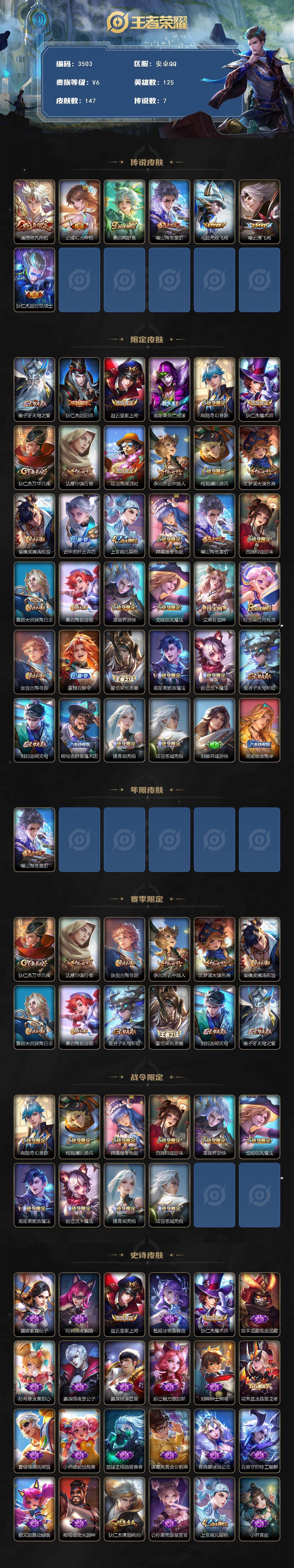 [14766798]安卓q-v0-永恒钻石iv段位-125英雄-147皮肤-7传说-37史诗 【传说皮肤】:澜愿照九州拓,云缨幻光神呛,桑启鸣野蒿,曜山海苍雷引,马超无双飞将,曜云鹰飞将,狄仁杰超时空战士 【限定皮肤】:姜子牙天穹之誓,狄仁杰阴阳师,赵云皇家上将,高渐离死亡摇滚,扁鹊奇幻香踪,狄仁杰魔术师,狄仁杰万华元夜,达摩沙漠行僧,项羽海滩派对,李元芳云中旅人,杨戬潮玩骑兵,沈梦溪大漠名商,裴擒虎擒涛扼浪,云中君纤云弄巧,上官婉儿梁祝,嫦娥暖冬兔眠,曜山海苍雷引,西施玲珑珍味,鲁班大师探海日志,桑启海盐诗旅,暃星界游侠,戈娅驭风魔法,艾琳女武神,阿古朵江河有灵,张良古海寻踪,蒙犽百解令,蒙恬荣光圣徽,高渐离燃音魔法,妲己灵卜魔法,鬼谷子天穹祈灯,刘邦剑破天穹,程咬金群星魔术团,镜青焰无极,项羽苍威无极,刘备异域游侠,周瑜熔金海岸 【年限皮肤】:曜山海苍雷引 【赛季限定】:狄仁杰万华元夜,达摩沙漠行僧,张良古海寻踪,李元芳云中旅人,沈梦溪大漠名商,裴擒虎擒涛扼浪,鲁班大师探海日志,桑启海盐诗旅,鬼谷子天穹祈灯,蒙恬荣光圣徽,刘邦剑破天穹,姜子牙天穹之誓 【战令限定】:扁鹊奇幻香踪,杨戬潮玩骑兵,嫦娥暖冬兔眠,西施玲珑珍味,暃星界游侠,戈娅驭风魔法,高渐离燃音魔法,妲己灵卜魔法,镜青焰无极,项羽苍威无极 【史诗皮肤】:露娜紫霞仙子,阿轲暗夜猫娘,赵云皇家上将,甄姬冰雪圆舞曲,狄仁杰魔术师,宫本武藏鬼剑武藏,孙尚香水果甜心,嬴政暗夜贵公子,嬴政摇滚巨星,妲己魅力维加斯,刘禅绅士熊喵,花木兰水晶猎龙者,夏侯惇乘风破浪,小乔缤纷独角兽,兰陵王暗隐猎兽者,诸葛亮黄金分割率,雅典娜冰冠公主,百里守约特工魅影,蔡文姬舞动绿茵,程咬金功夫厨神,狄仁杰鹰眼统帅,公孙离无限星赏官,上官婉儿梁祝,小乔青蛇,不知火舞魅语,橘右京修罗,云中君纤云弄巧,暃星界游侠,扁鹊奇幻香踪,戈娅驭风魔法,阿古朵江河有灵,蒙犽百解令,妲己灵卜魔法,高渐离燃音魔法,蒙恬荣光圣徽,镜青焰无极,黄忠怒海争锋,公孙离涂山容容 【其他皮肤】:项羽海滩派对,韩信教廷特使,韩信街头霸王,赵云白执事,赵云忍炎影,艾琳女武神,白起白色死神,扁鹊化身博士,宫本武藏未来纪元,安琪拉玩偶对对碰,姜子牙时尚教父,妲己少女阿狸,典韦黄金武士,亚瑟死亡骑士,达摩拳王,花木兰兔女郎,张飞五福同心,刘备万事如意,后羿阿尔法小队,狄仁杰阴阳师,高渐离死亡摇滚