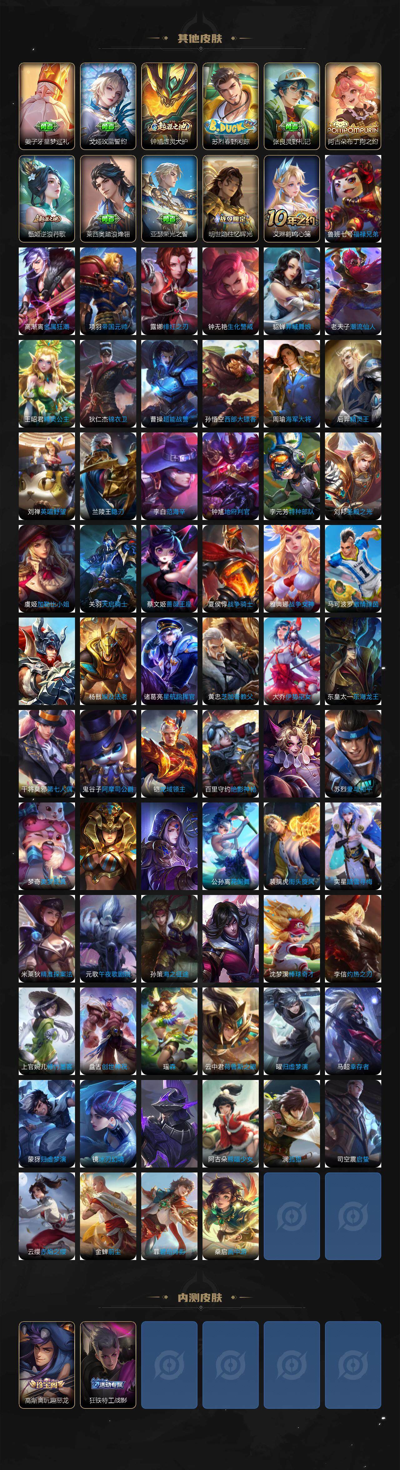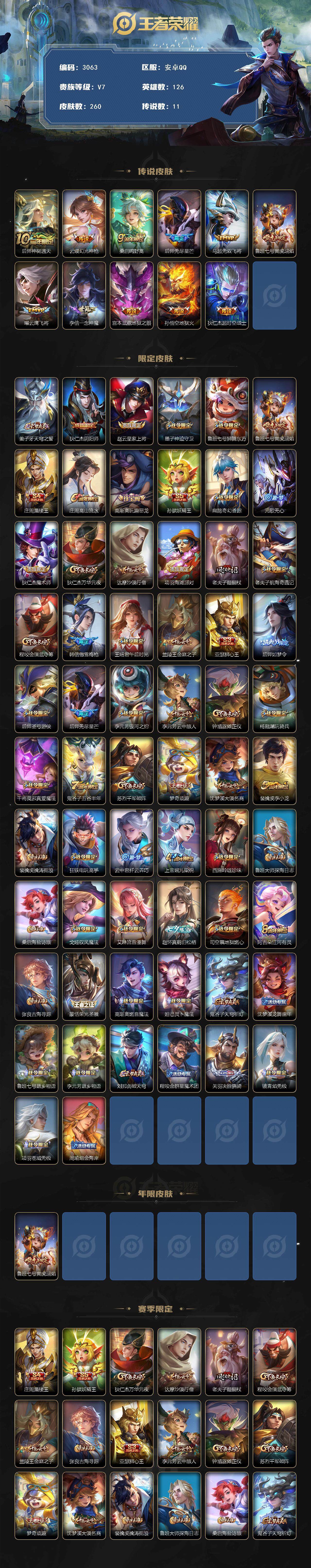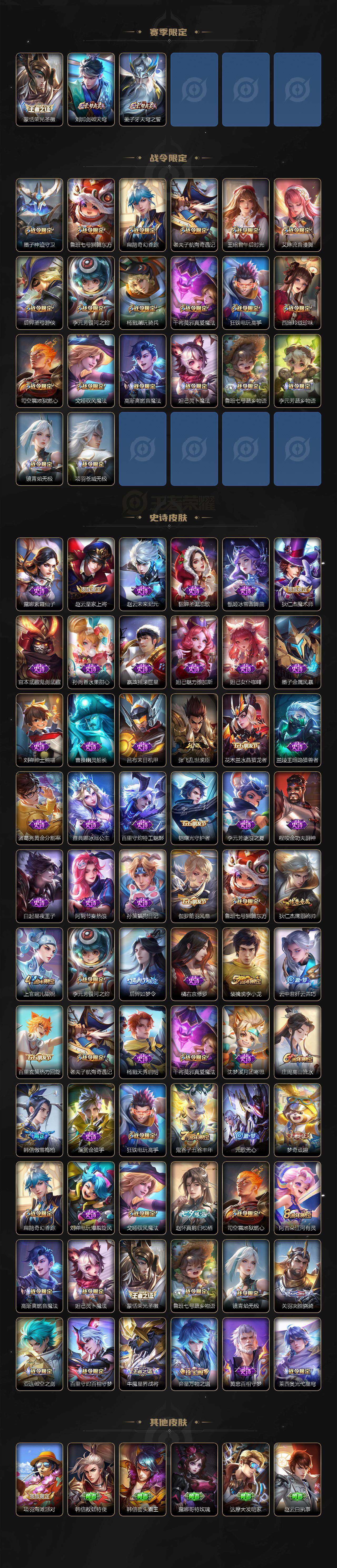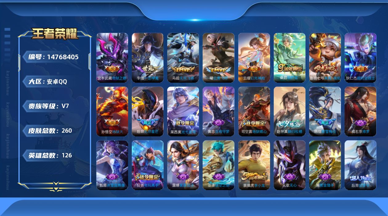 [14768405]安卓q-v7-最强王者段位-126英雄-260皮肤-0典藏-0珍品无双-0无双-0珍品传说-11传说-65史诗 【英雄全皮】:蒙恬全皮 【传说皮肤】:后羿神树通天,云缨幻光神呛,桑启鸣野蒿,后羿无尽星芒,马超无双飞将,鲁班七号寅虎瑞焰,曜云鹰飞将,李信一念神魔,宫本武藏地狱之眼,孙悟空地狱火,狄仁杰超时空战士 【限定皮肤】:姜子牙天穹之誓,狄仁杰阴阳师,赵云皇家上将,墨子神迹守卫,鲁班七号狮舞东方,鲁班七号寅虎瑞焰,庄周蜃楼王,庄周高山流水,高渐离玩趣恶龙,孙膑妖精王,扁鹊奇幻香踪,元歌无心,狄仁杰魔术师,狄仁杰万华元夜,达摩沙漠行僧,项羽海滩派对,老夫子醍醐杖,老夫子航海奇遇记,程咬金演武夺筹,韩信傲雪梅呛,王昭君午后时光,兰陵王金庭之子,亚瑟狮心王,后羿如梦令,后羿圣弓游侠,后羿无尽星芒,李元芳银河之约,李元芳云中旅人,钟馗驱傩正仪,杨戬潮玩骑兵,干将莫邪真爱魔法,鬼谷子五谷丰年,苏烈千军破阵,梦奇顽趣,沈梦溪大漠名商,裴擒虎李小龙,裴擒虎擒涛扼浪,狂铁电玩高手,云中君纤云弄巧,上官婉儿梁祝,西施玲珑珍味,鲁班大师探海日志,桑启海盐诗旅,戈娅驭风魔法,艾琳流音漫舞,赵怀真鹤归松栖,司空震地狱燃心,阿古朵江河有灵,张良古海寻踪,蒙恬荣光圣徽,高渐离燃音魔法,妲己灵卜魔法,鬼谷子天穹祈灯,沈梦溪龙舞盛年,鲁班七号蔬乡物语,李元芳蔬乡物语,刘邦剑破天穹,程咬金群星魔术团,关羽决胜骁骑,镜青焰无极,项羽苍威无极,周瑜熔金海岸 【年限皮肤】:鲁班七号寅虎瑞焰 【赛季限定】:庄周蜃楼王,孙膑妖精王,狄仁杰万华元夜,达摩沙漠行僧,老夫子醍醐杖,程咬金演武夺筹,兰陵王金庭之子,张良古海寻踪,亚瑟狮心王,李元芳云中旅人,钟馗驱傩正仪,苏烈千军破阵,梦奇顽趣,沈梦溪大漠名商,裴擒虎擒涛扼浪,鲁班大师探海日志,桑启海盐诗旅,鬼谷子天穹祈灯,蒙恬荣光圣徽,刘邦剑破天穹,姜子牙天穹之誓 【战令限定】:墨子神迹守卫,鲁班七号狮舞东方,扁鹊奇幻香踪,老夫子航海奇遇记,王昭君午后时光,艾琳流音漫舞,后羿圣弓游侠,李元芳银河之约,杨戬潮玩骑兵,干将莫邪真爱魔法,狂铁电玩高手,西施玲珑珍味,司空震地狱燃心,戈娅驭风魔法,高渐离燃音魔法,妲己灵卜魔法,鲁班七号蔬乡物语,李元芳蔬乡物语,镜青焰无极,项羽苍威无极 【史诗皮肤】:露娜紫霞仙子,赵云皇家上将,赵云未来纪元,貂蝉圣诞恋歌,甄姬冰雪圆舞曲,狄