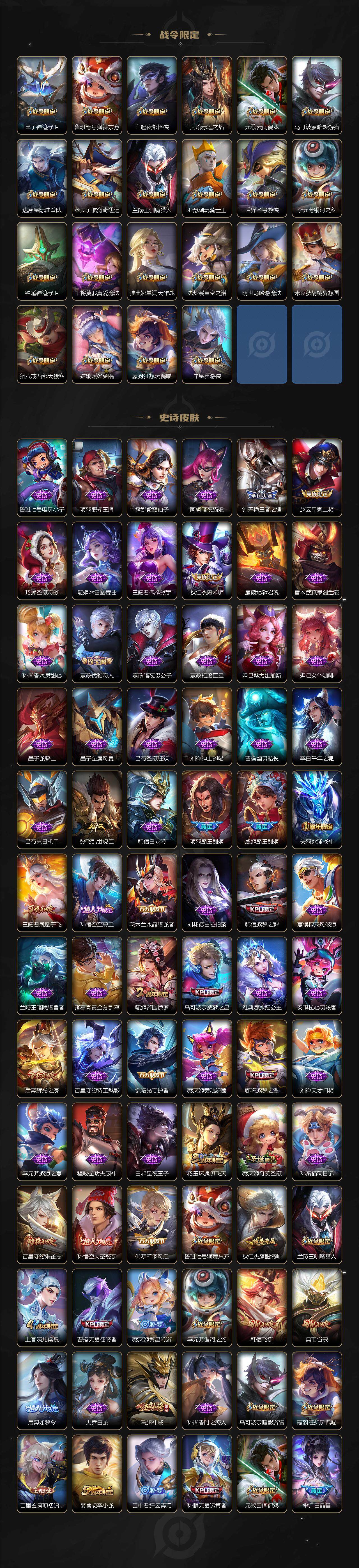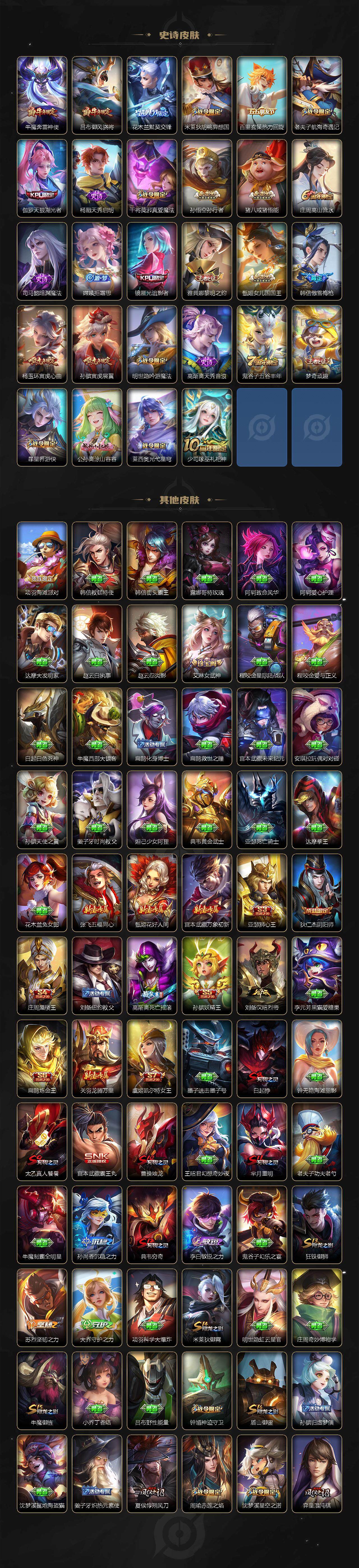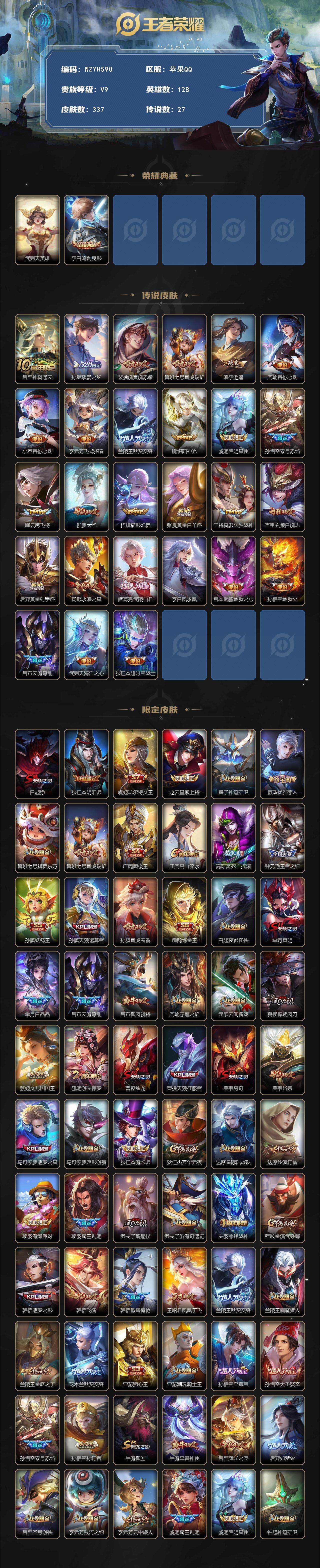 128英雄-337皮肤-【wzyh590】贵族9/皮肤337/典藏1/传说27/史诗106/英雄128/猪八戒全皮/武则天/李白-鸣剑·曳影/后羿神树通天/孙策-挚爱之约/裴擒虎-寅虎·赤拳/鲁班-寅虎·瑞焰/曜-李/周瑜-音你心动/小乔-音你心动/李元芳-飞鸢探春/兰陵王-默契交锋/镜-炽阳神光/虞姬-启明星使/孙悟空-零号·赤焰/曜-云鹰飞将/伽罗-太华/貂蝉-猫影幻舞/张良-黄金白羊座/干将莫邪-久胜战神/