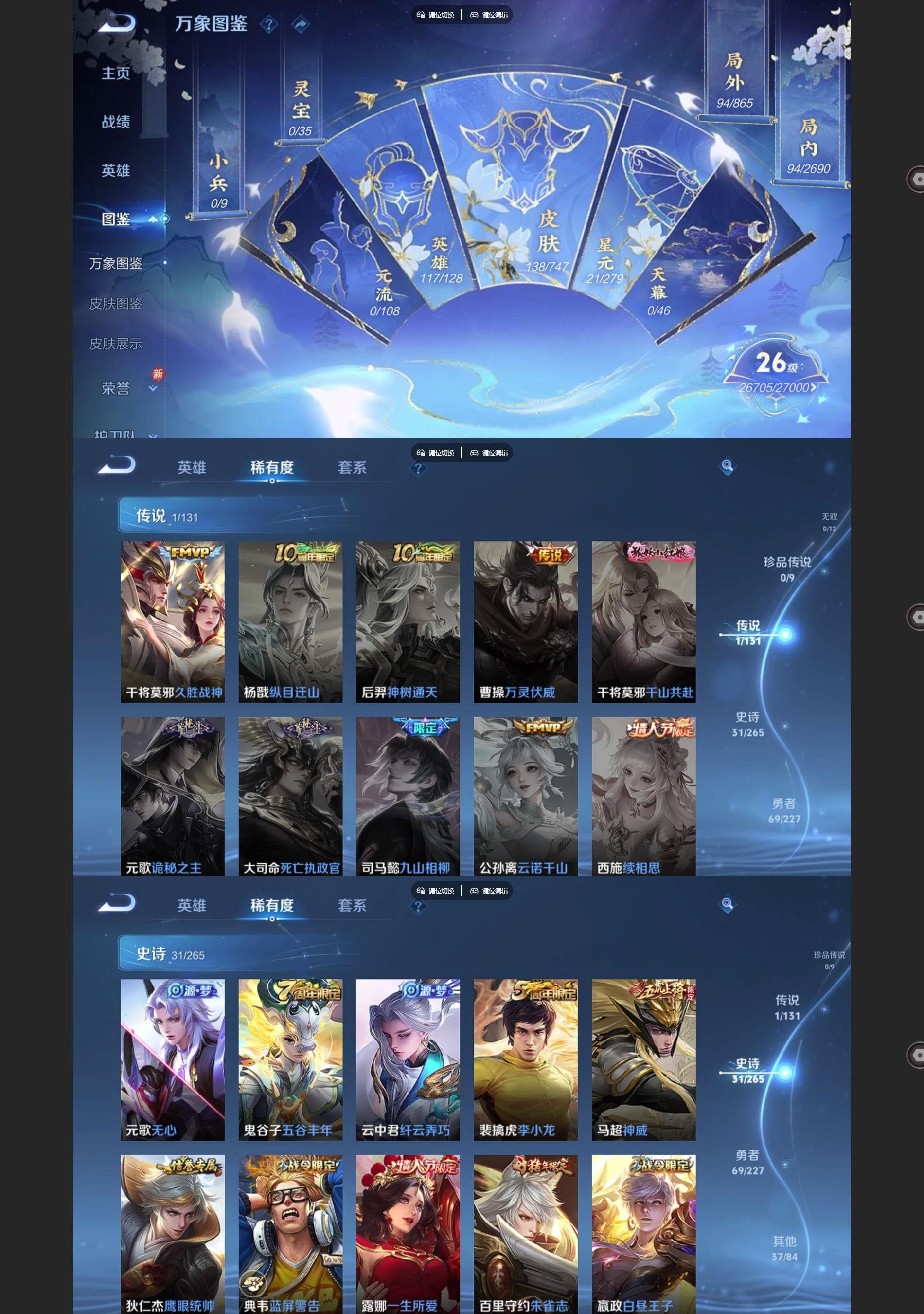 2294413-138皮肤1传说31史诗43限定653紫星币 【传说】 久胜战神 【热门】神威 冰封战神 朱雀志 逐梦之影 一生所爱 猎兽之王 蓝屏警告 朔望之晖 原初探秘者 李小龙 水晶猎龙者 暗隐猎兽者 金属风暴 白昼王子 黄金分割率 胡桃夹子 千年之狐 圣诞恋歌 乘风破浪 末日机甲男 节奏热浪 街头霸王 缤纷独角兽 鬼剑武藏 德古拉伯爵 花好人间 蜃楼王 妖精王 炼金王 凯尔特