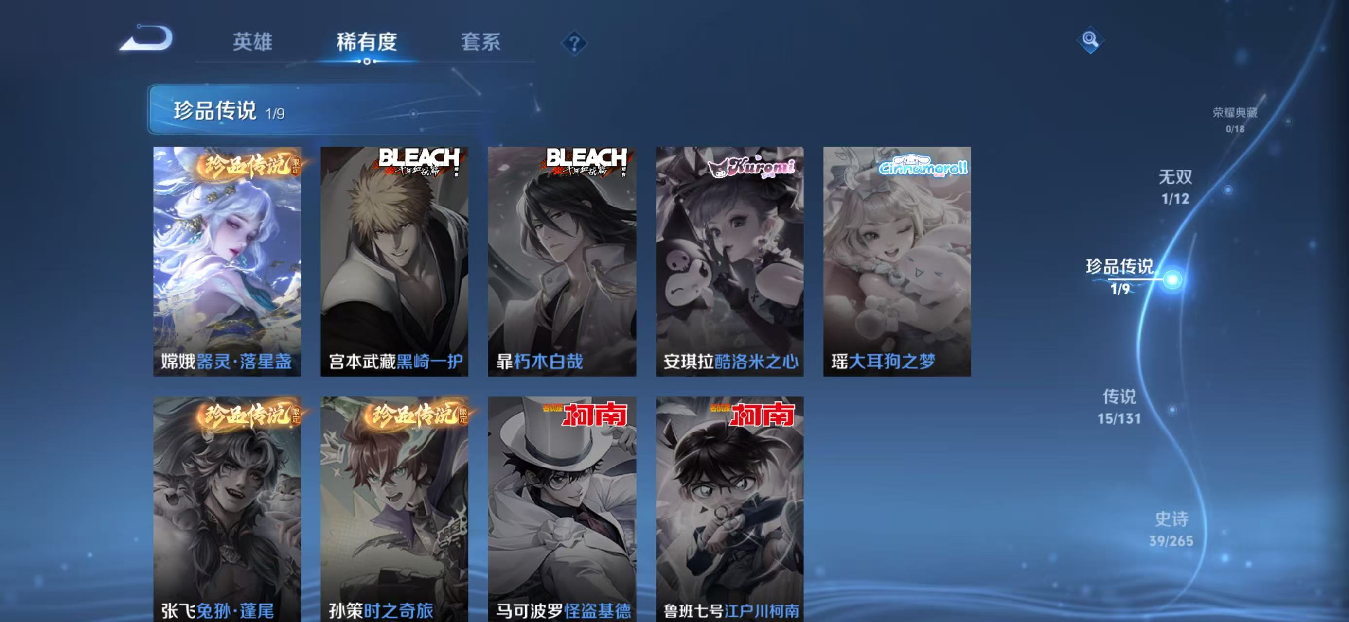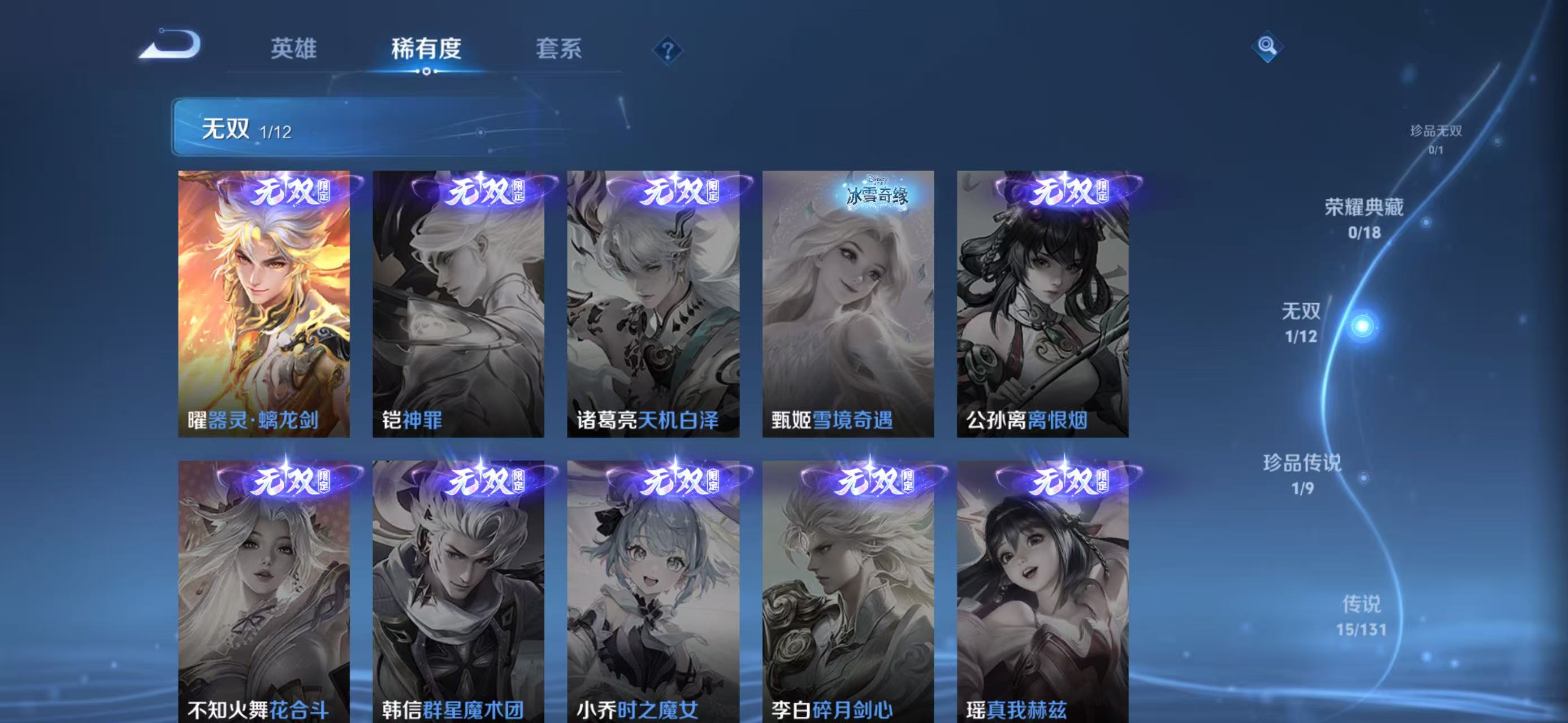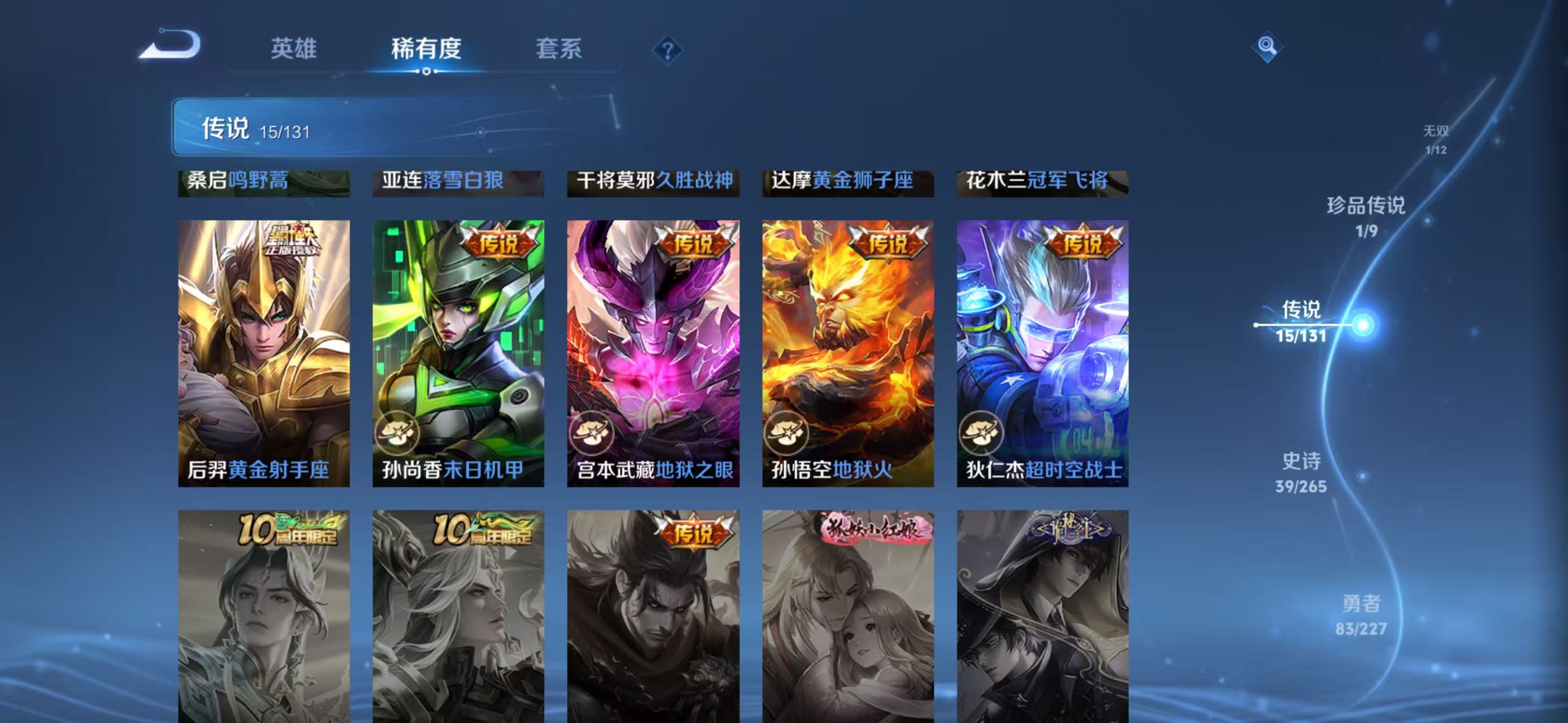 v7-180皮1无双器灵·螭龙剑1珍品器灵·落星盏15传说地狱之眼,鸣野蒿,落雪白狼,云诺千山,续相思,幻光神呛,愿照·千秋盛,愿照·九州拓,久胜战神,末日机甲,黄金射手座,冠军飞将,黄金狮子座,地狱火,超时空战士39史诗