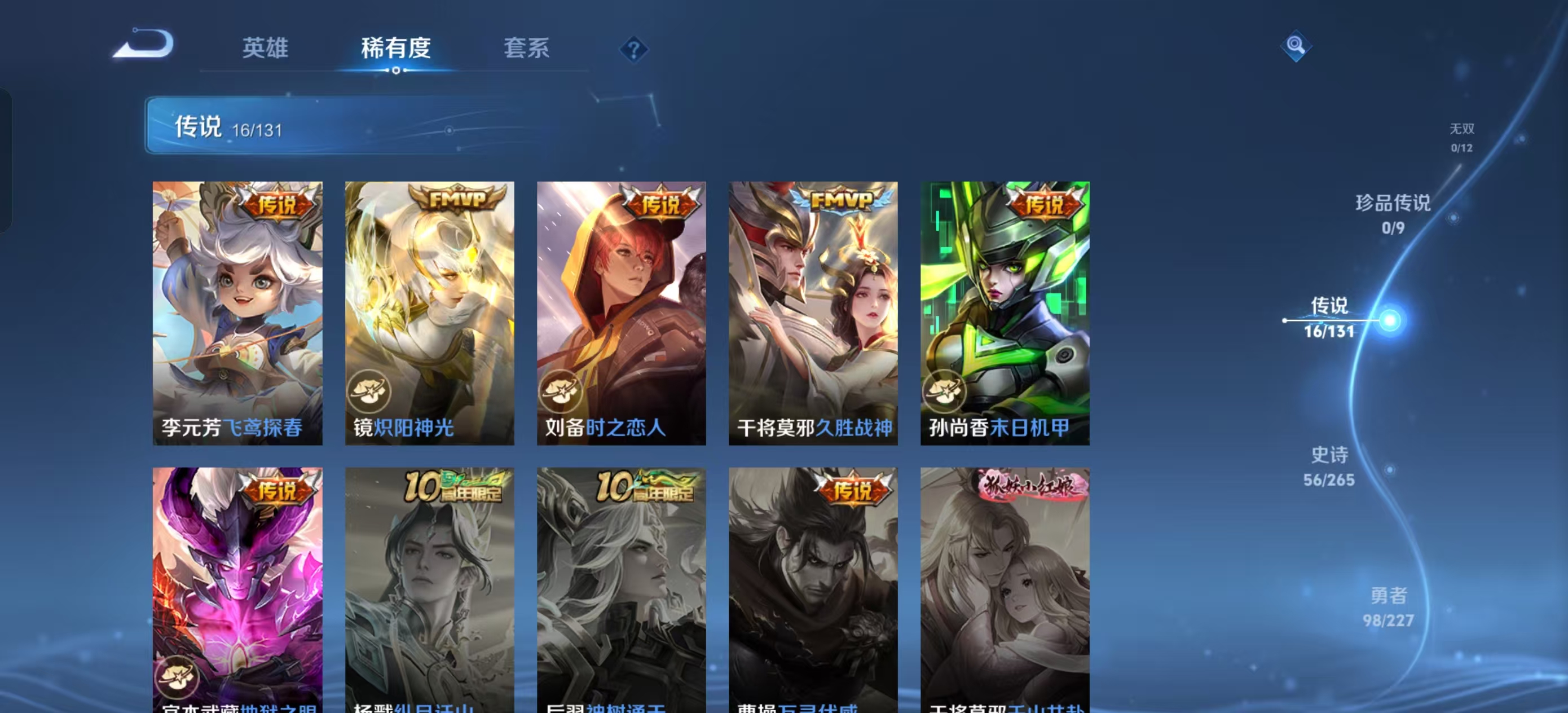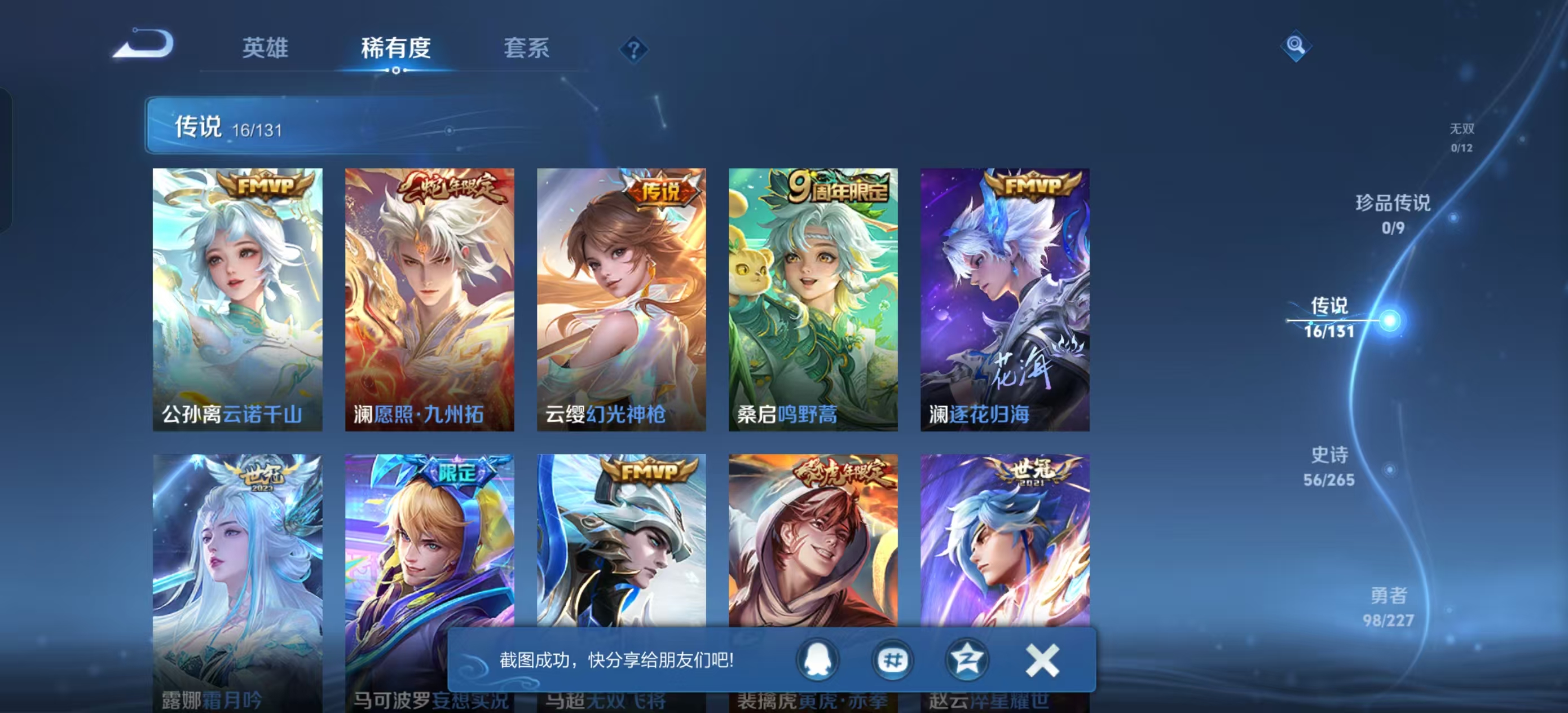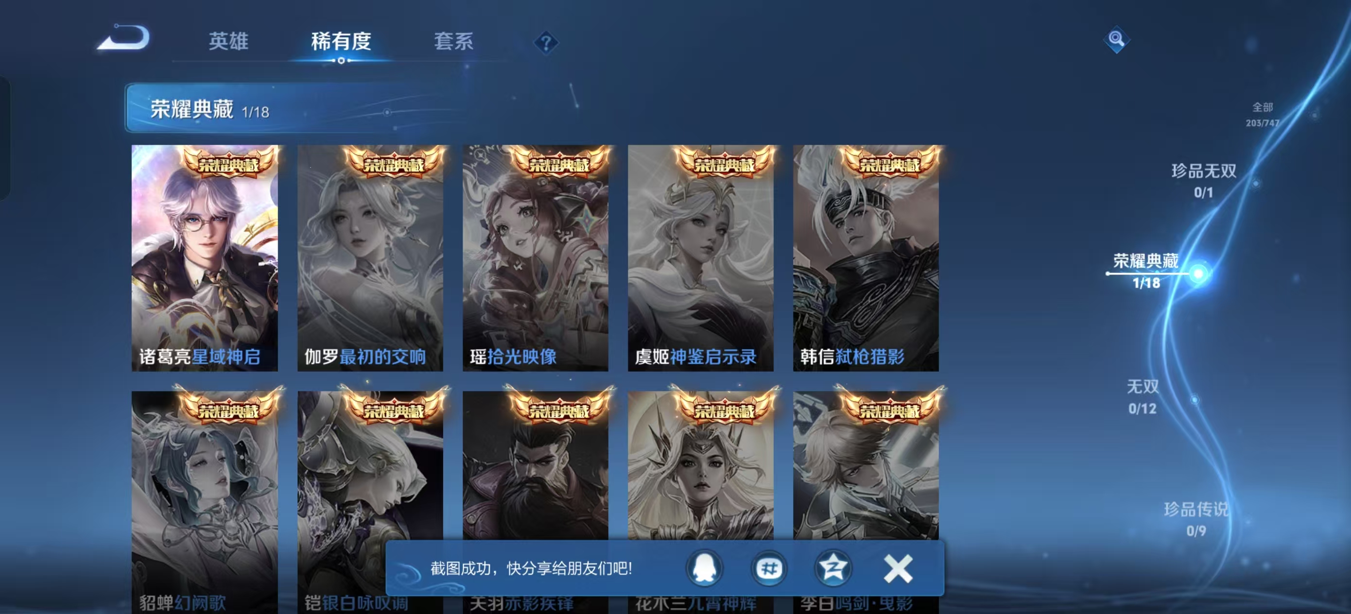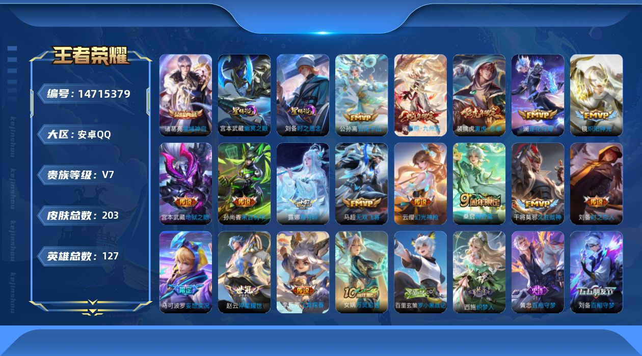 [14715379]【贵族7 203皮肤2星传说1水晶16传说10个性按键】荣耀水晶: 星域神启 星传说: 幽冥之眼时之思念 传说皮: 久胜战神炽阳神光末日机甲-孙尚香地狱之眼飞鸢探春时之恋人-刘备淬星耀世无双飞将妄想实况霜月吟澜逐花归海幻光神呛云诺千山 限定皮: 飞衡孙行者寅虎·赤拳山海·玄木吟鸣野蒿逐霄战戟愿照·九州拓