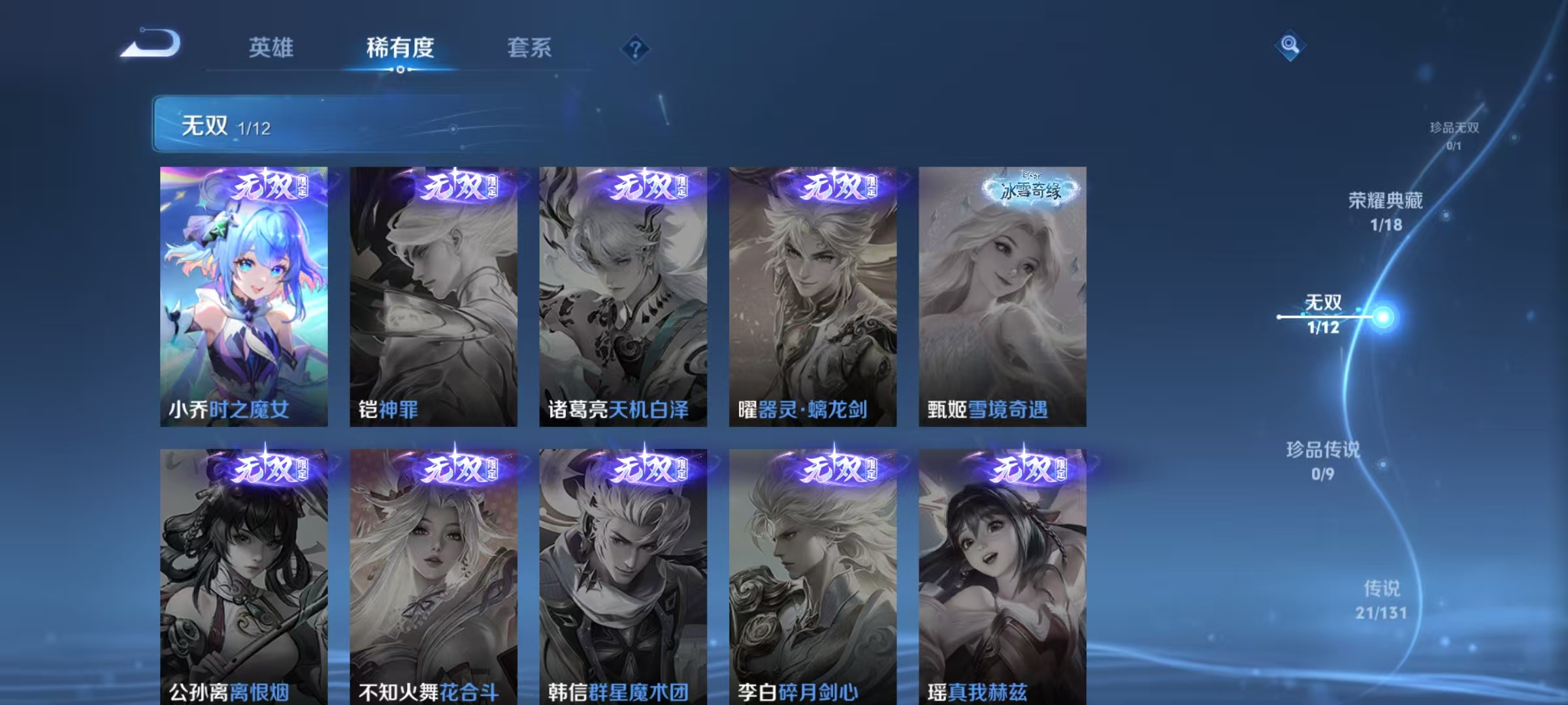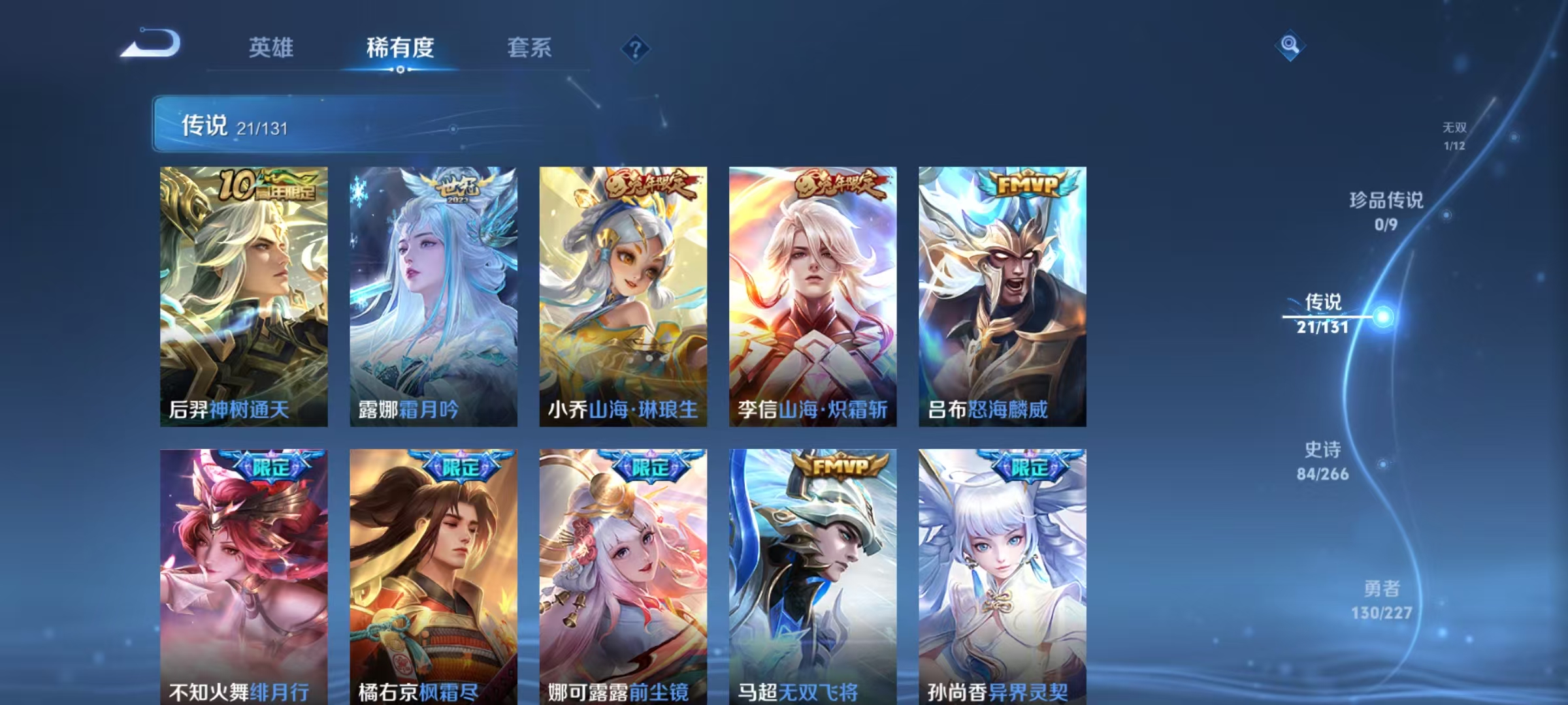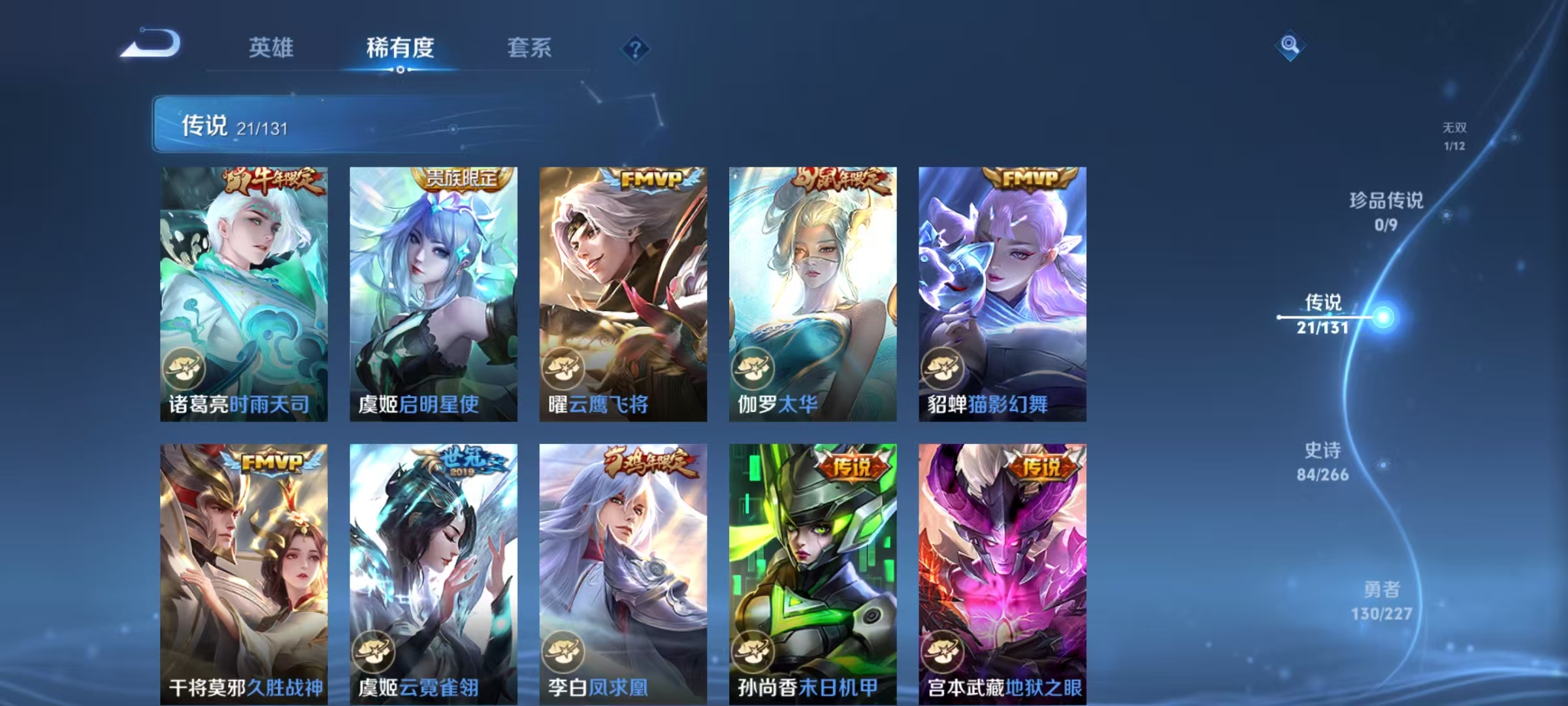 [14715165]【贵族8 291皮肤1水晶1无双传说21传说7个性按键】荣耀水晶: 九霄神辉 无双皮: 小乔时之魔女 传说皮: 云鹰飞将猫影幻舞久胜战神云霓雀翎末日机甲-孙尚香地狱火地狱之眼无双飞将山海·炽霜斩山海·琳琅生霜月吟神树通天 限定皮: 遇见飞天李小龙梁祝时雨天司异界灵契太华天狼狩猎者神奇女侠天狼绘梦者凤求凰美猴王如梦令-嫦娥至尊宝如梦令-后羿大圣娶亲高山流水孙行者猪悟能前尘镜枫霜尽五谷丰年绯月行神器·万象笔怒海麟威山海·玄木吟山海·碧波行