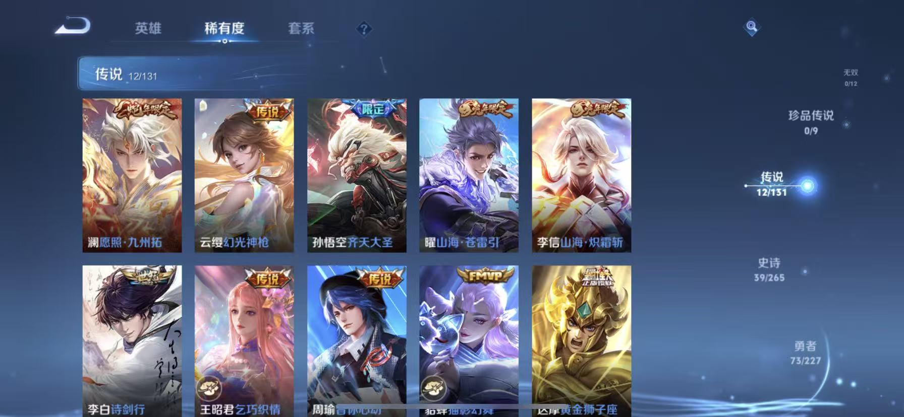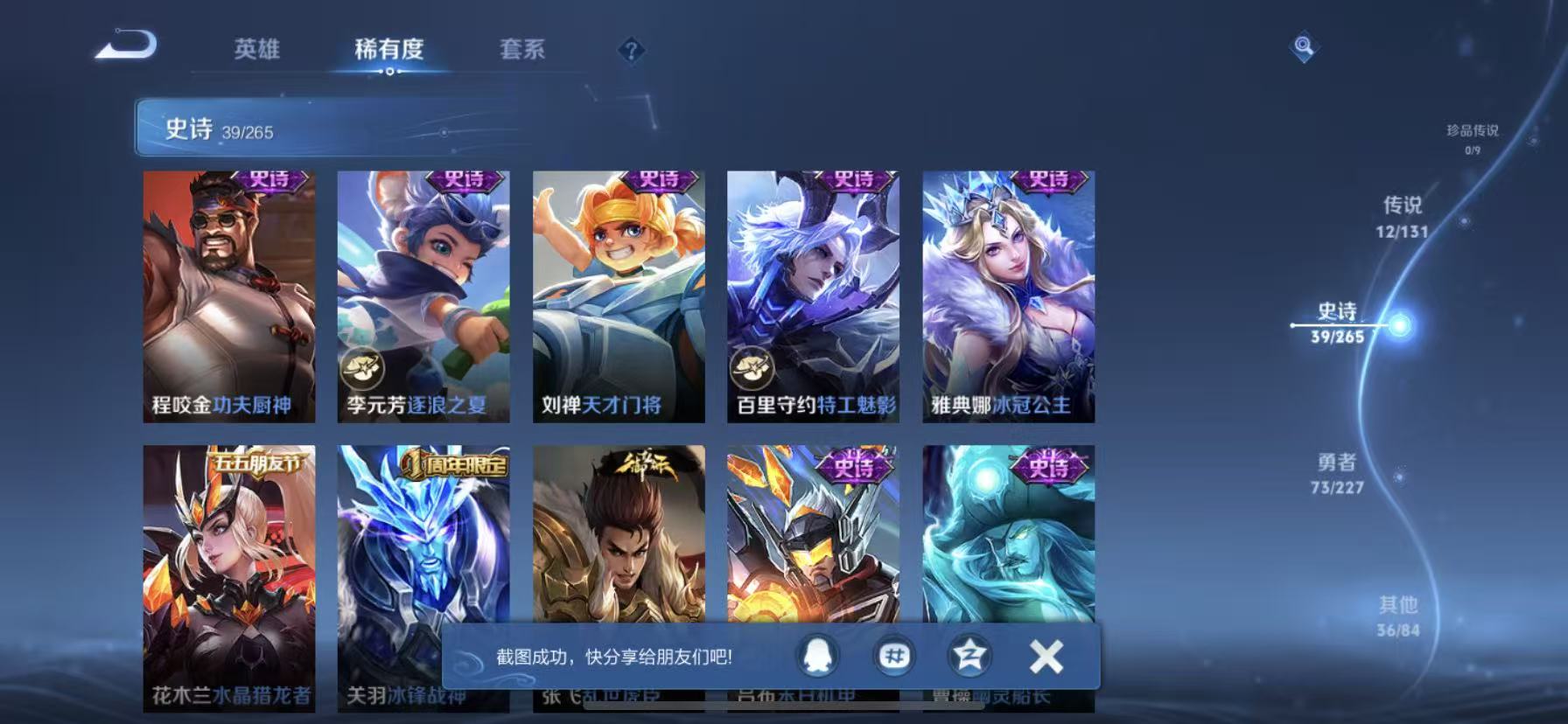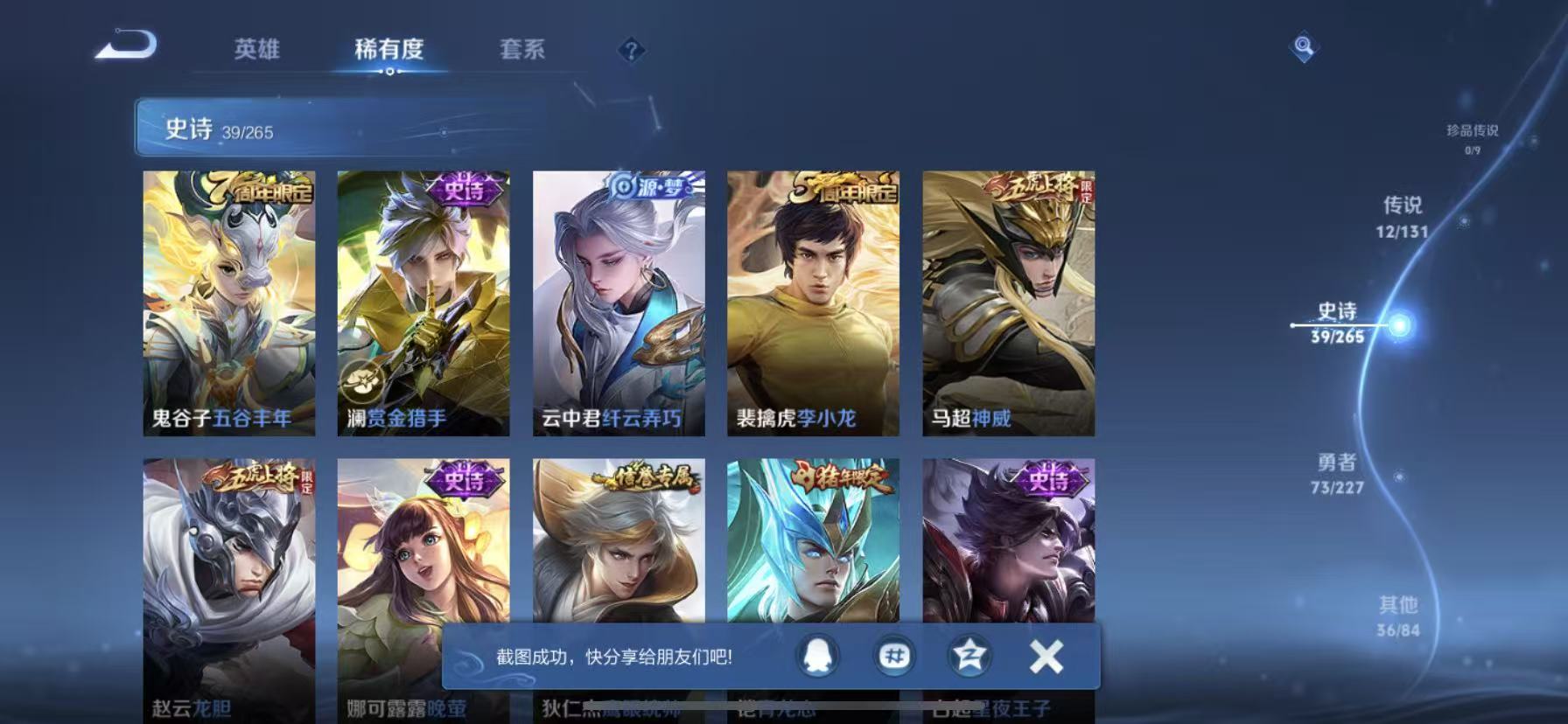 [14318927]【贵族7 161皮肤1星传说12传说】星传说: 幽冥之眼 传说皮: 黄金狮子座猫影幻舞地狱之眼音你心动-周瑜胖达荣荣乞巧织情山海·炽霜斩山海·苍雷引幻光神呛 限定皮: 冰锋战神李小龙龙胆神威青龙志五谷丰年诗剑行山海·玄木吟齐天大圣愿照·九州拓