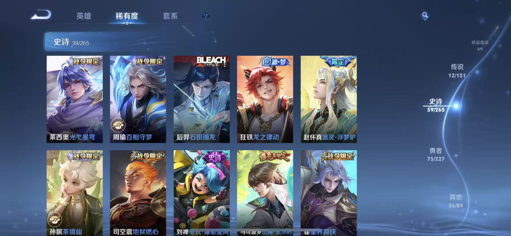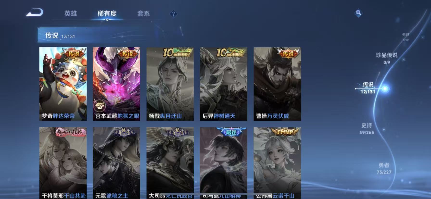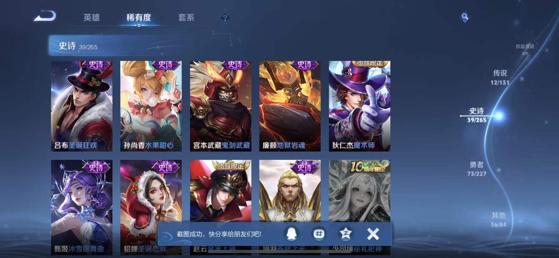 [14318927]【贵族7 161皮肤1星传说12传说】星传说: 幽冥之眼 传说皮: 黄金狮子座猫影幻舞地狱之眼音你心动-周瑜胖达荣荣乞巧织情山海·炽霜斩山海·苍雷引幻光神呛 限定皮: 冰锋战神李小龙龙胆神威青龙志五谷丰年诗剑行山海·玄木吟齐天大圣愿照·九州拓