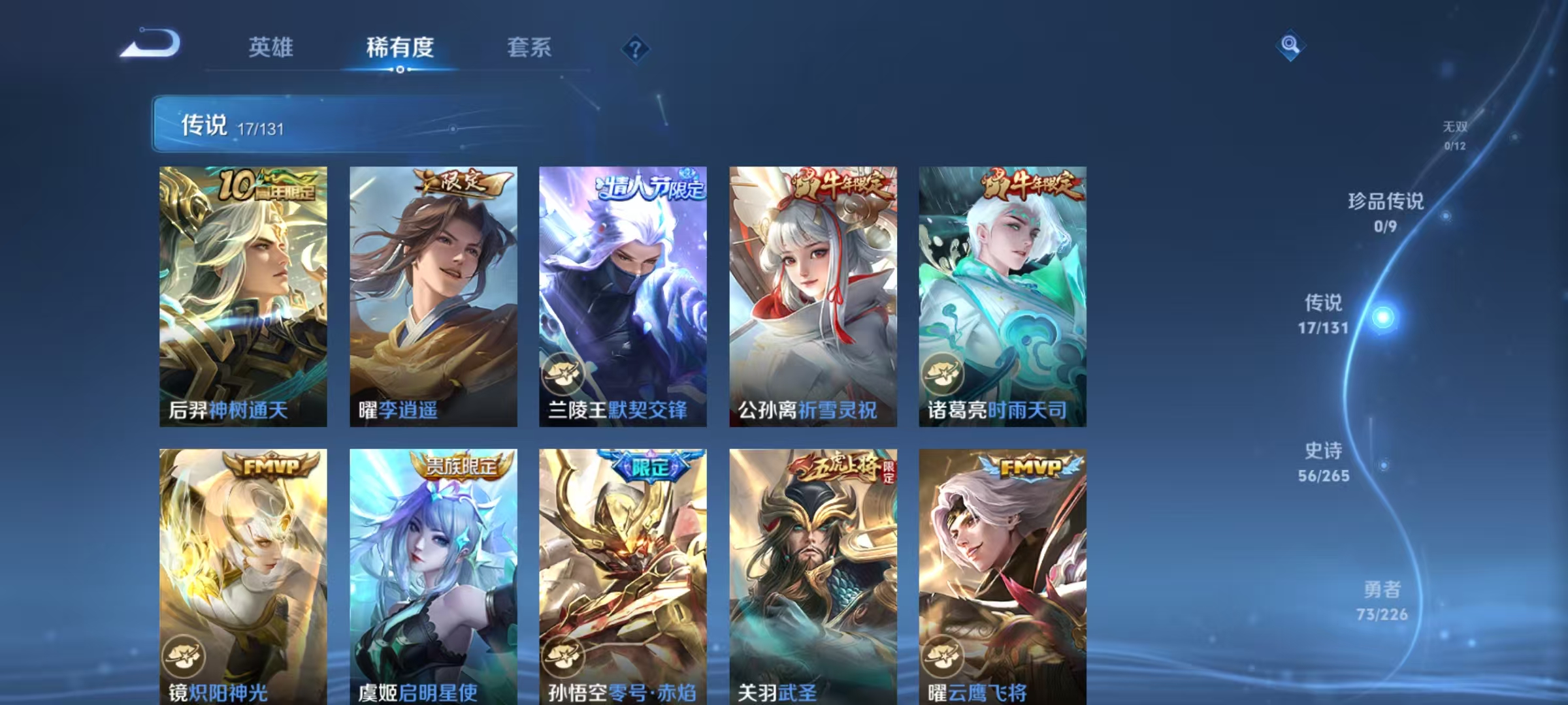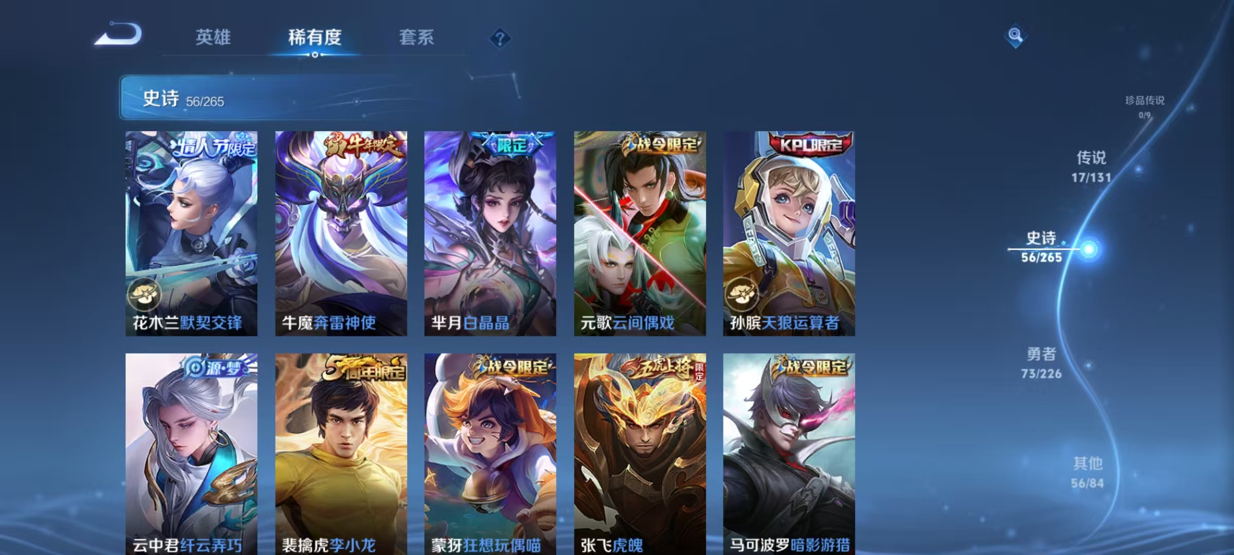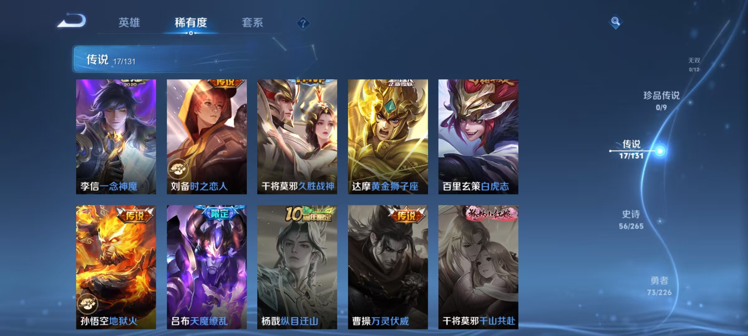 [14277350]【贵族8 203皮肤1水晶17传说】荣耀水晶: 全息碎影 传说皮: 黄金狮子座云鹰飞将久胜战神炽阳神光一念神魔地狱火零号·赤焰李时之恋人-刘备神树通天 限定皮: 李小龙奔雷神使祈雪灵祝云端筑梦师时雨天司龙胆武圣烈魂白晶晶虎魄天魔缭乱神威时之彼端飞衡冰霜恋舞曲天狼运算者逐梦之影天狼绘梦者白虎志至尊宝默契交锋-兰陵王如梦令-后羿大圣娶亲默契交锋-花木兰