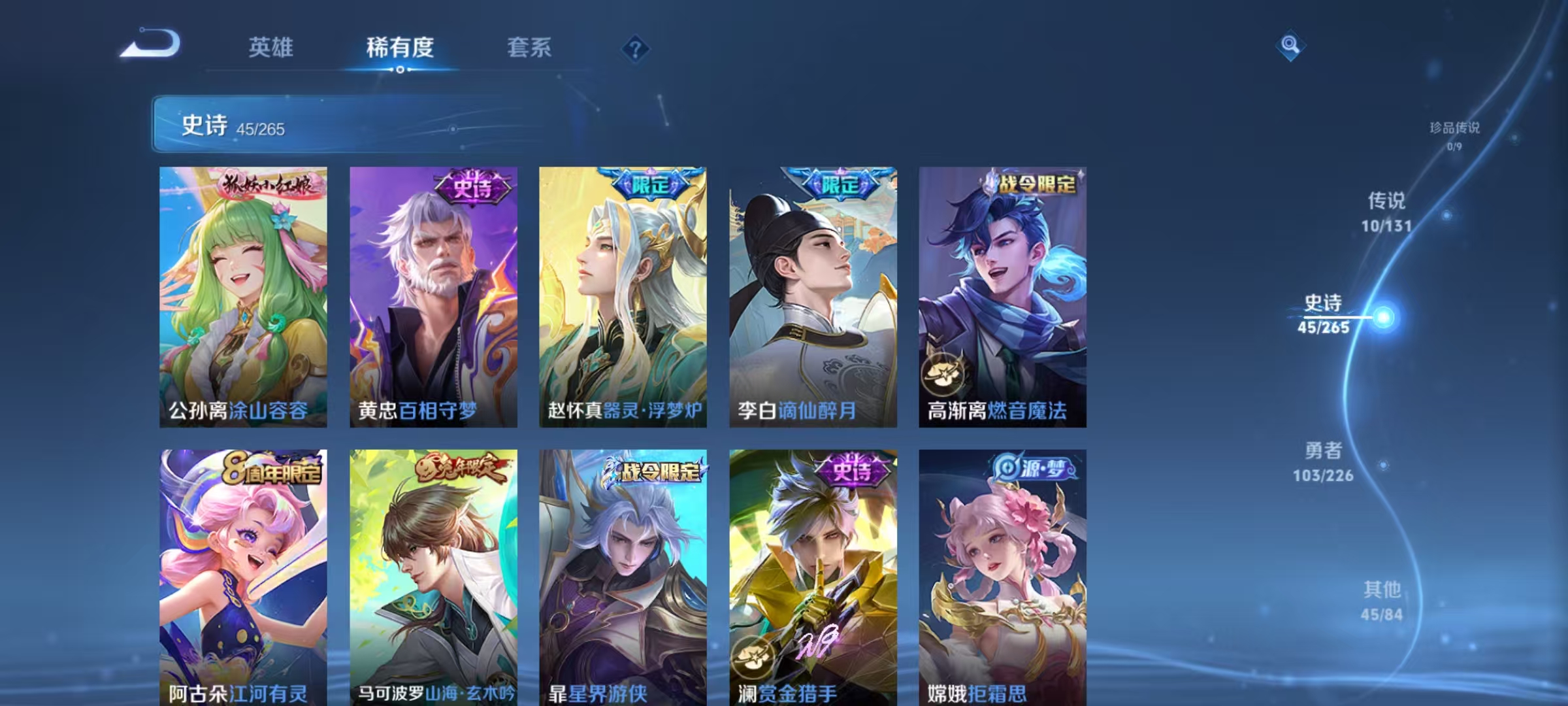 [14164739]【贵族7 203皮肤2星传说10传说7个性按键328夺宝幸运值】星传说: 幽冥之眼幽冥火 传说皮: 炽阳神光地狱火地狱之眼燃星之曲貂蝉曦玄引神树通天 限定皮: 李小龙梁祝高山流水怒海麟威山海·玄木吟齐天大圣鸣野蒿逐霄战戟愿照·山河定