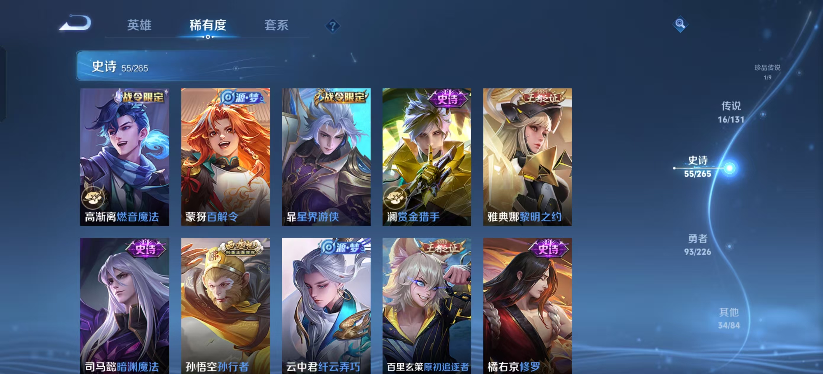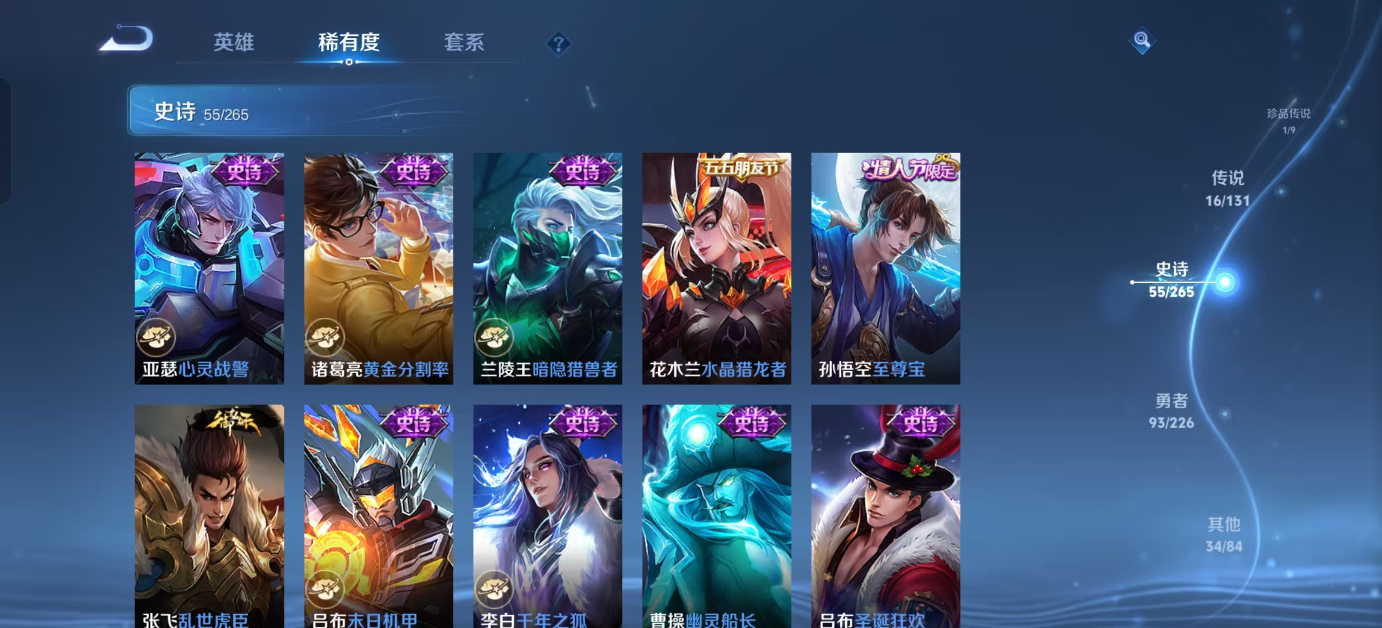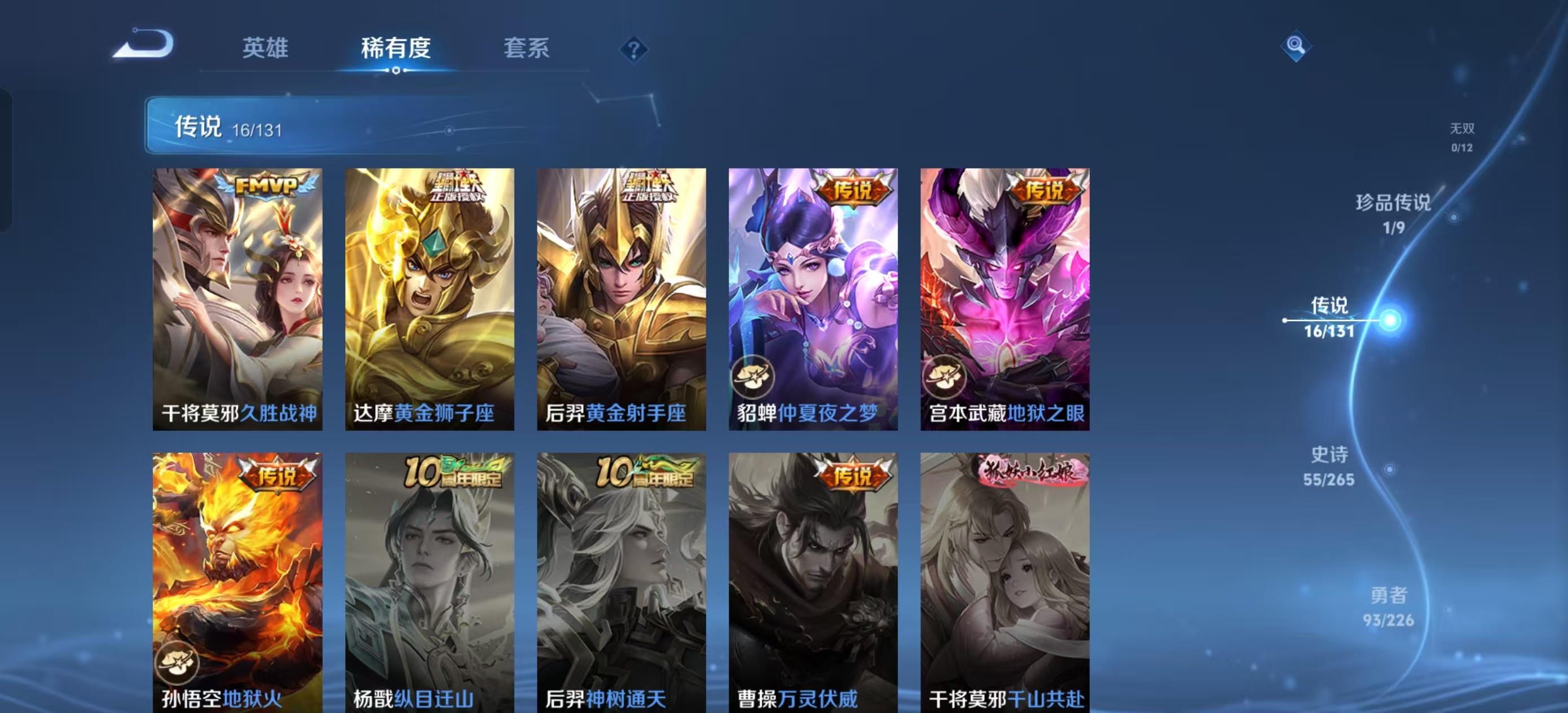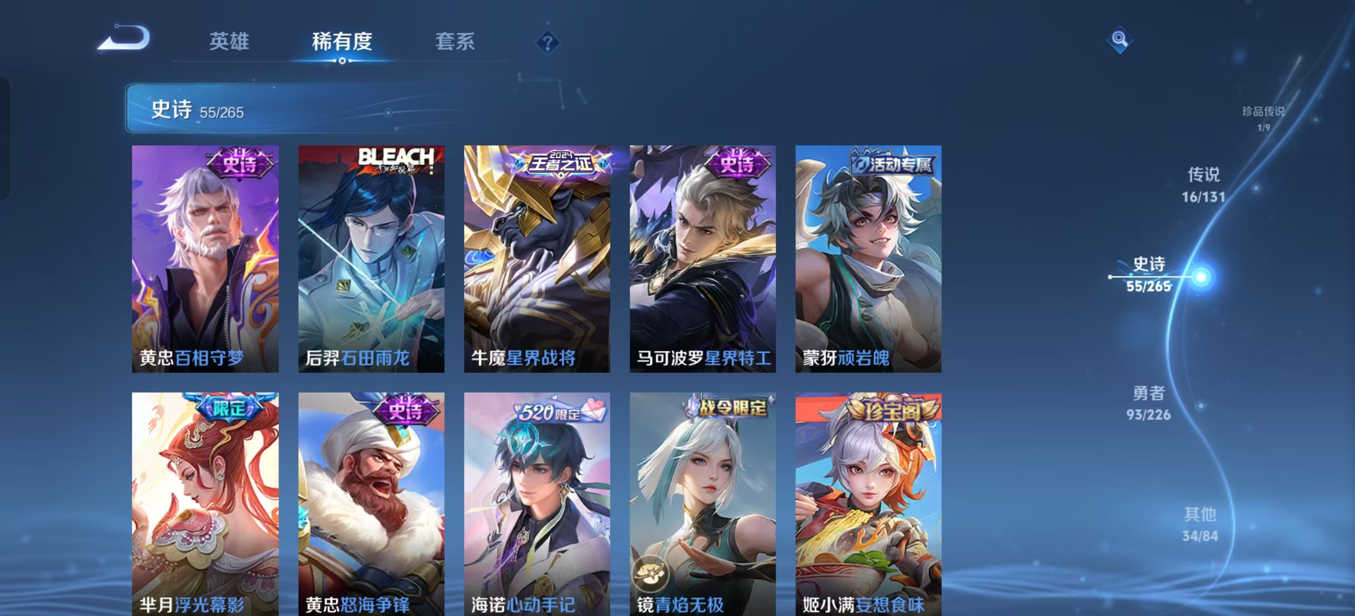 [13884421]【贵族7 200皮肤1水晶1珍品传说2星传说16传说15个性按键】荣耀水晶: 全息碎影 珍品传说: 怪盗基德 星传说: 幽冥之眼幽冥火 传说皮: 黄金狮子座黄金射手座久胜战神炽阳神光一念神魔地狱火仲夏夜之梦地狱之眼时之恋人-刘备澜逐花归海祥瑞亨通九山相柳 限定皮: 梁祝时雨天司至尊宝孙行者诗剑行鸣野蒿愿照·九州拓