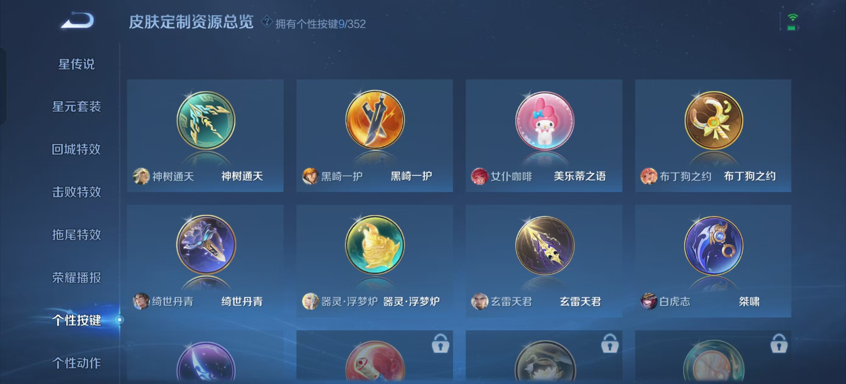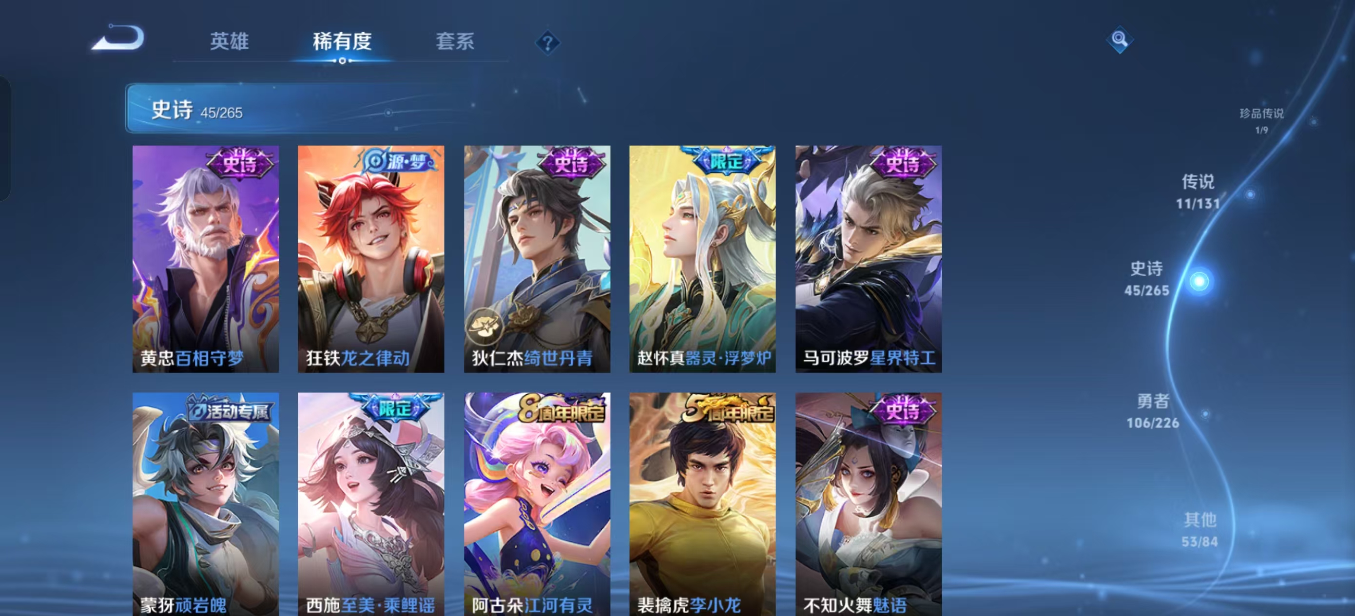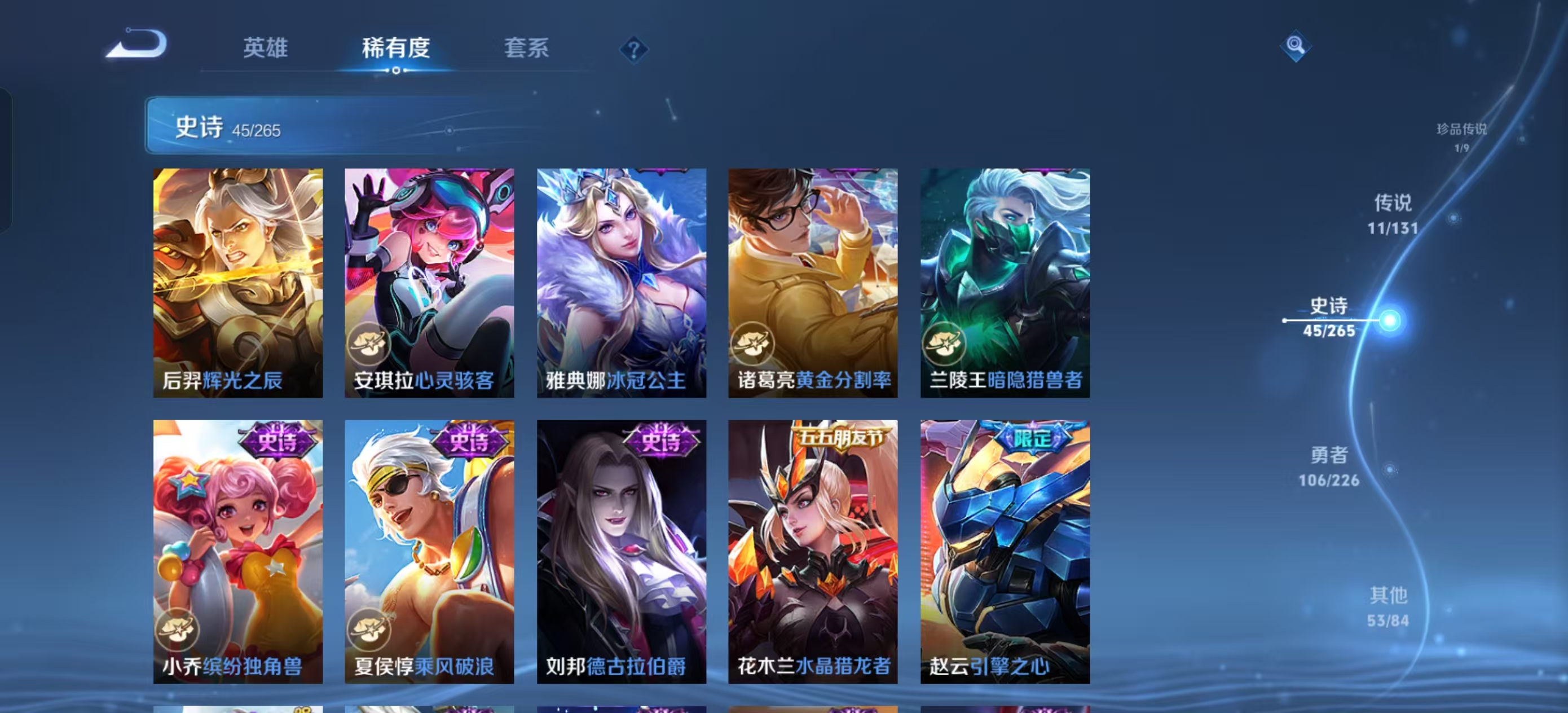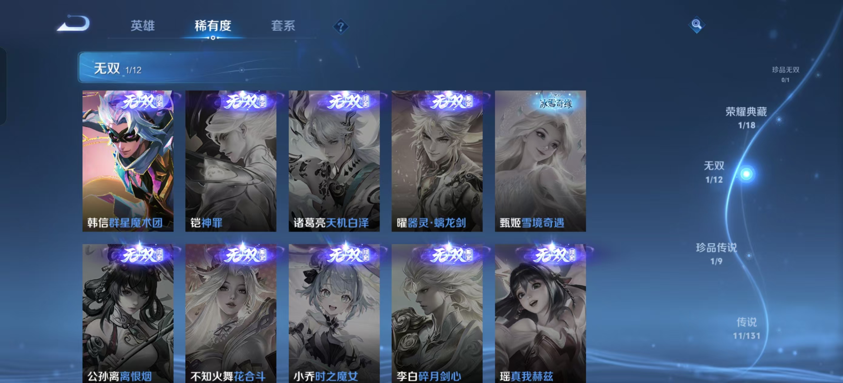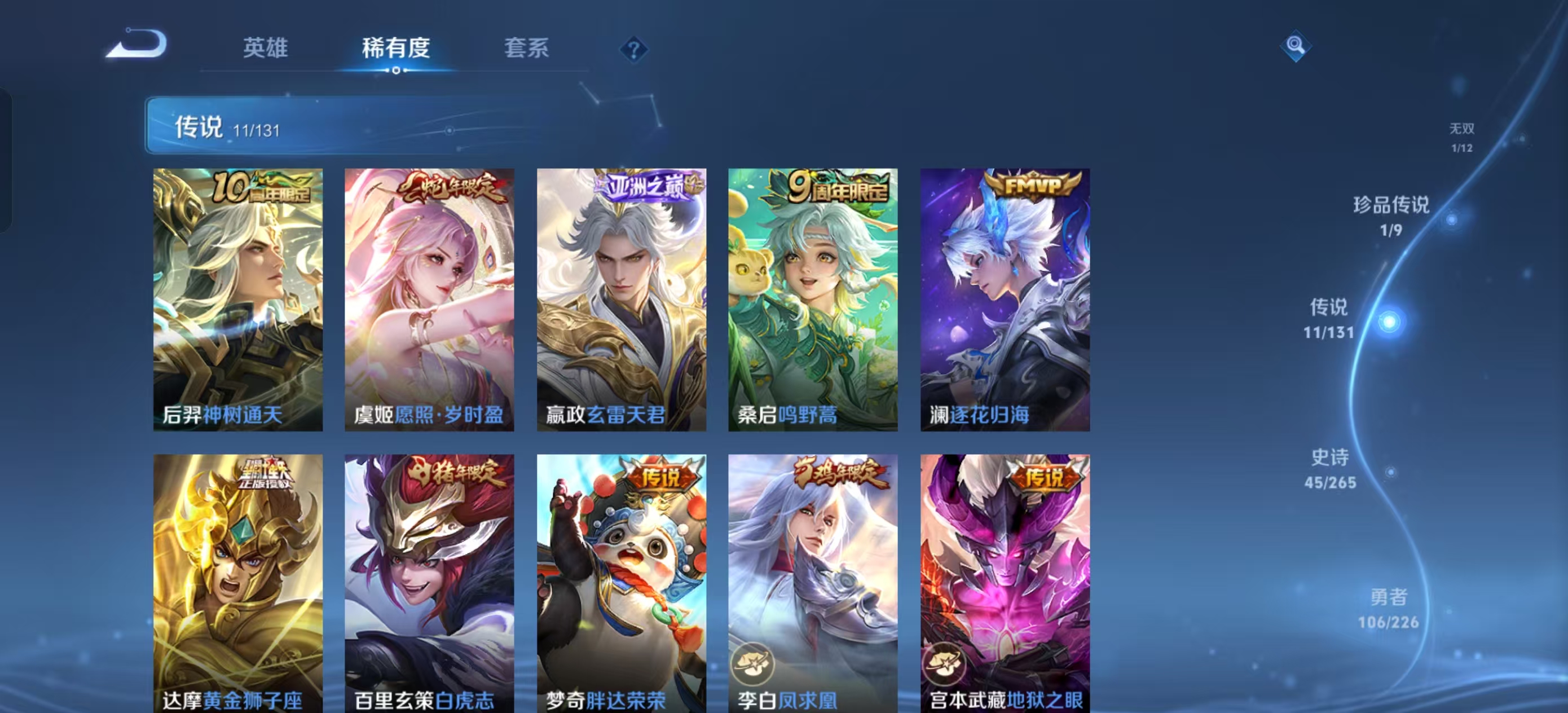 [13821932]【贵族7 218皮肤1水晶1无双传说1珍品传说11传说9个性按键】荣耀水晶: 鸣剑·曳影 无双皮: 韩信群星魔术团 珍品传说: 黑崎一护 传说皮: 黄金狮子座地狱火地狱之眼胖达荣荣澜逐花归海玄雷天君神树通天 限定皮: 李小龙引擎之心辉光之辰天狼狩猎者冰霜恋舞曲凤求凰白虎志至尊宝至美·乘鲤谣鸣野蒿愿照·岁时盈