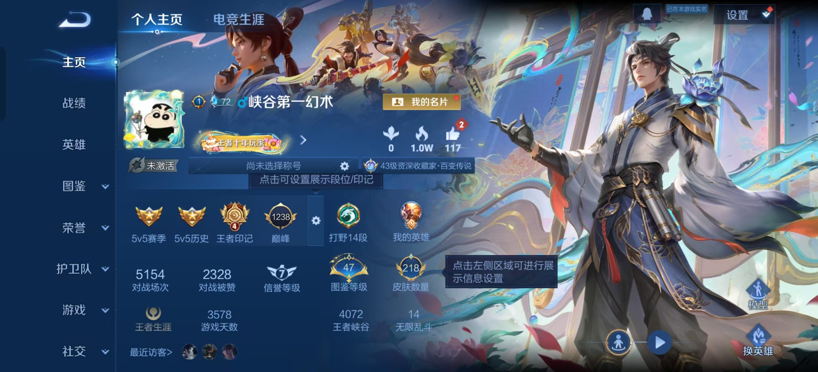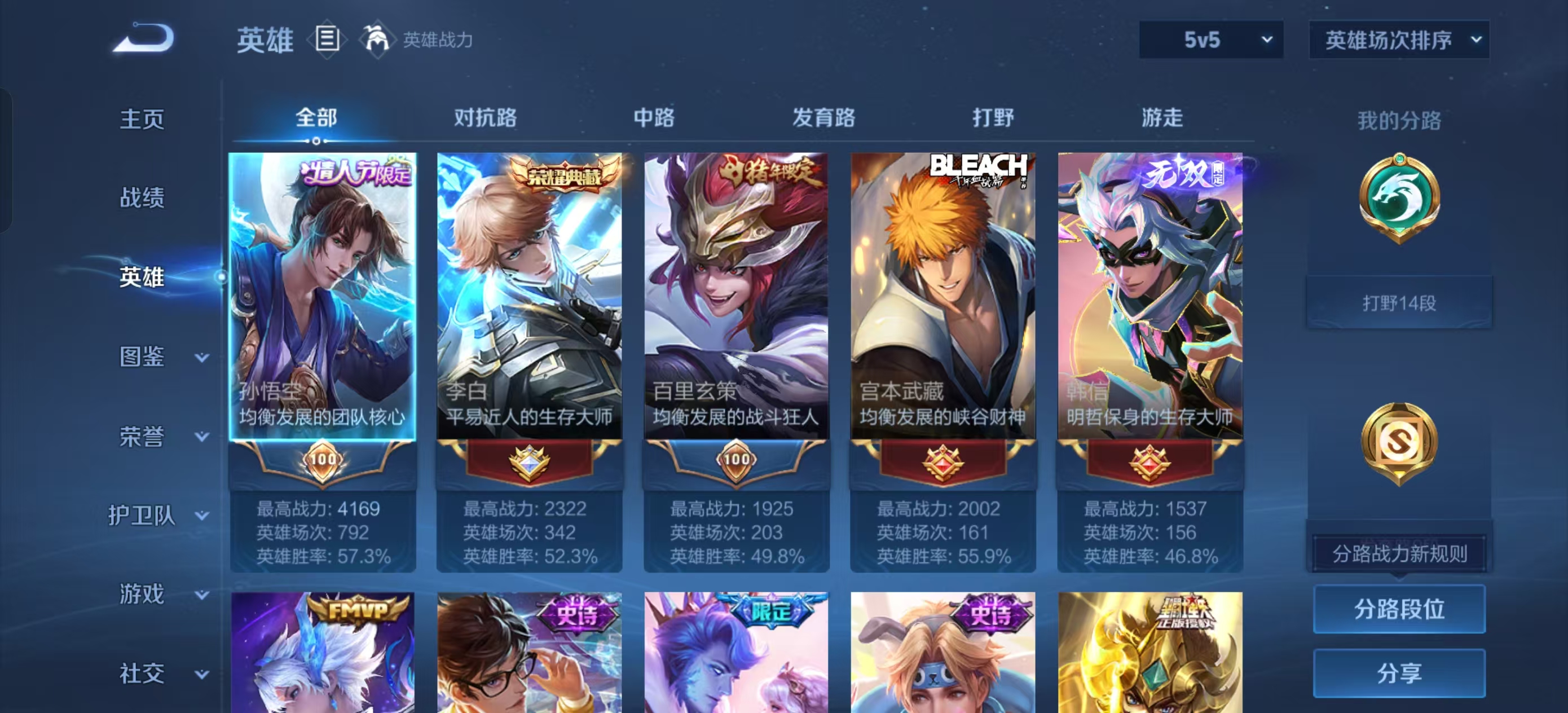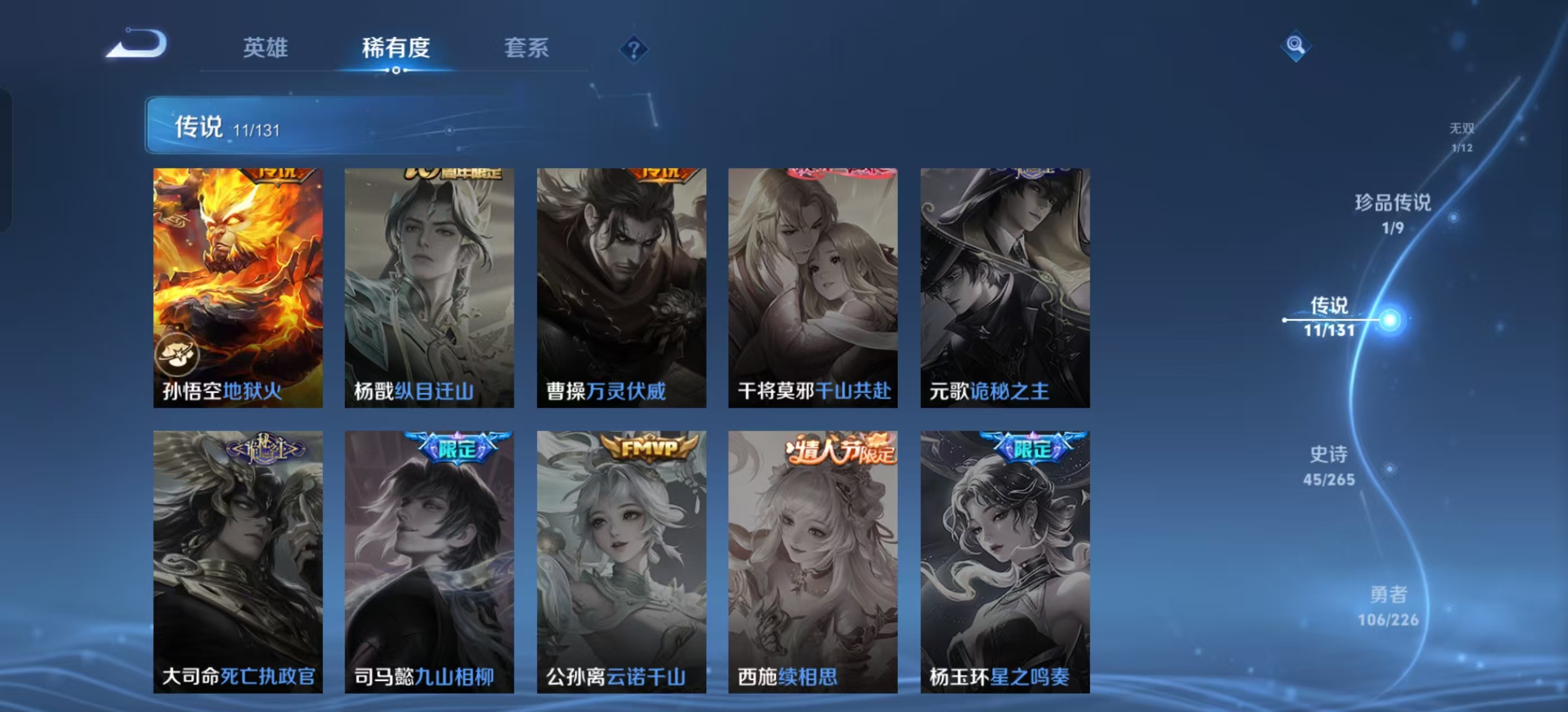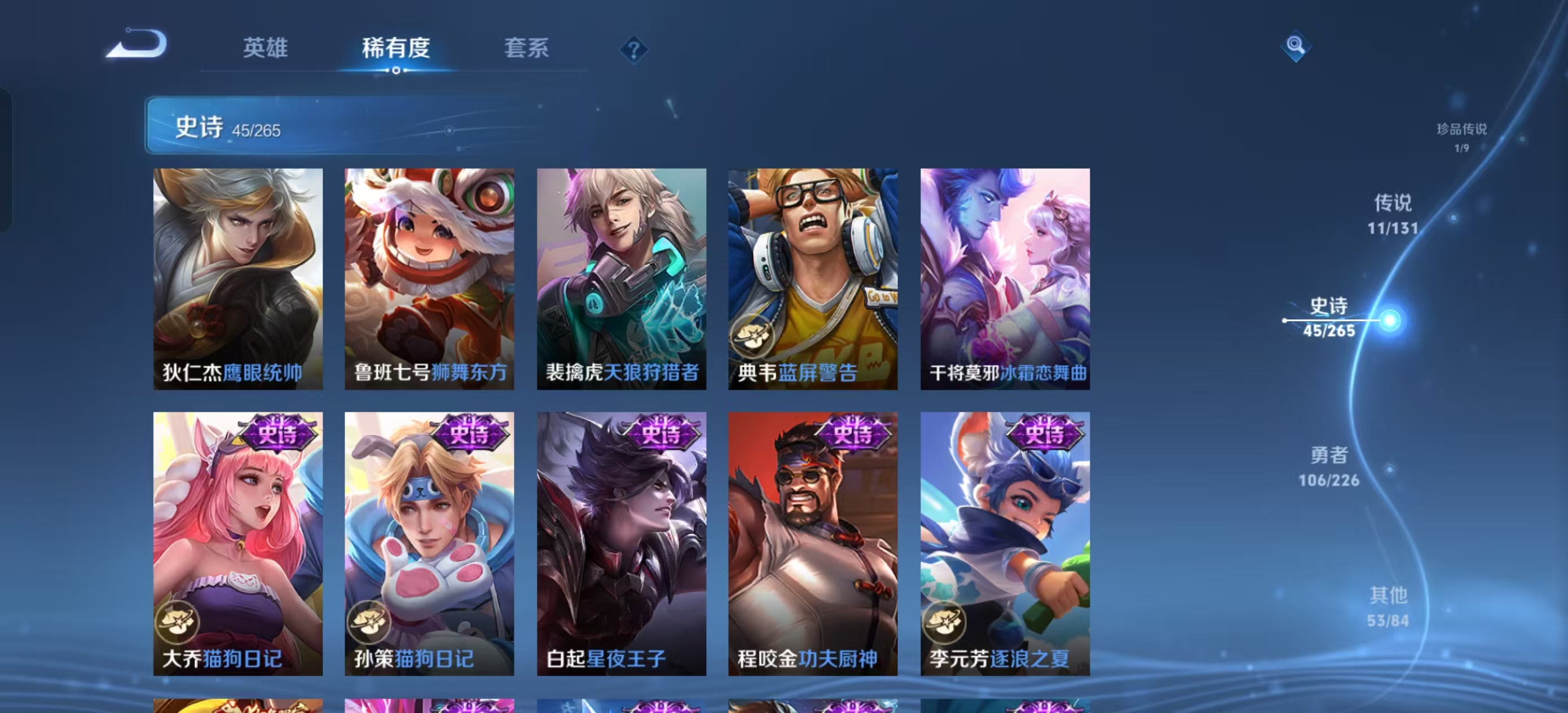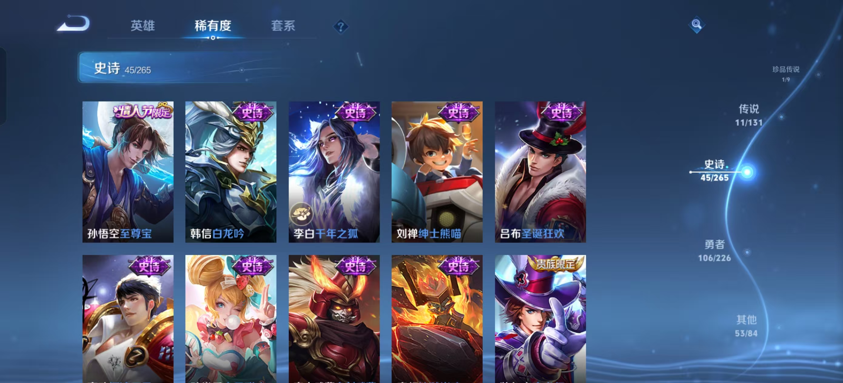 [13821932]【贵族7 218皮肤1水晶1无双传说1珍品传说11传说9个性按键】荣耀水晶: 鸣剑·曳影 无双皮: 韩信群星魔术团 珍品传说: 黑崎一护 传说皮: 黄金狮子座地狱火地狱之眼胖达荣荣澜逐花归海玄雷天君神树通天 限定皮: 李小龙引擎之心辉光之辰天狼狩猎者冰霜恋舞曲凤求凰白虎志至尊宝至美·乘鲤谣鸣野蒿愿照·岁时盈