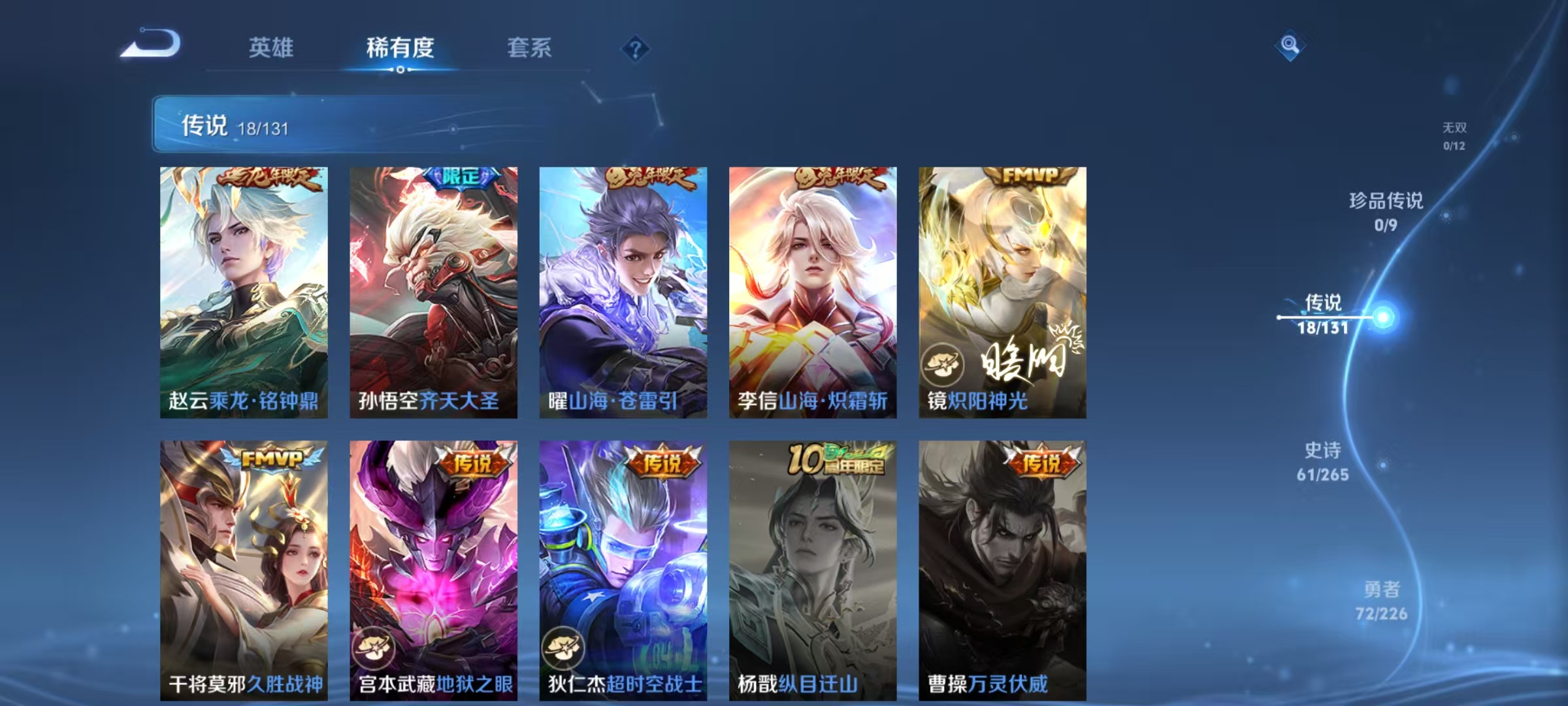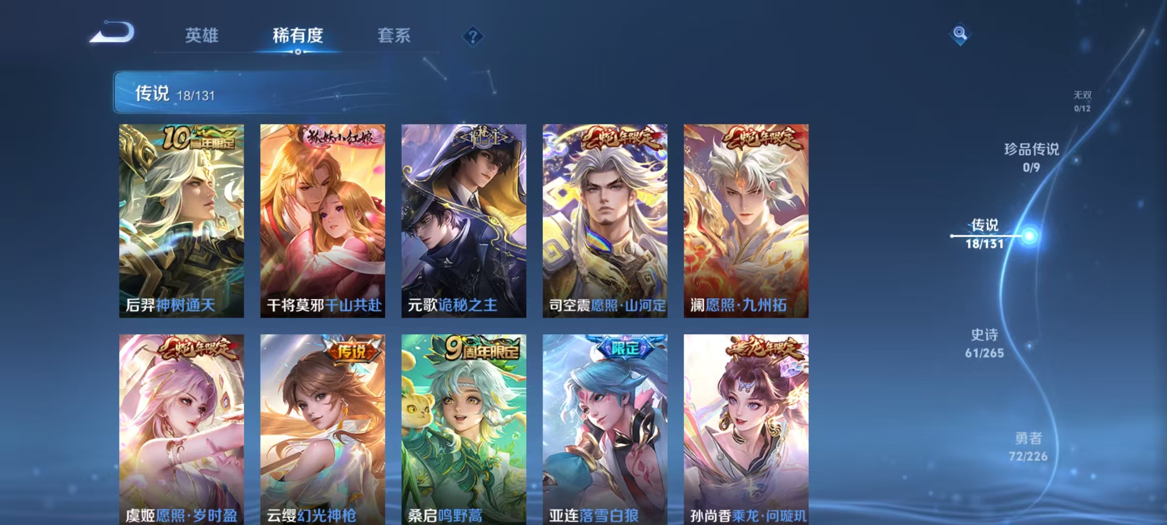 [13737768]【贵族7 183皮肤1水晶18传说】荣耀水晶: 弑呛猎影 传说皮: 久胜战神炽阳神光地狱之眼超时空战士-狄仁杰山海·炽霜斩山海·苍雷引乘龙·问璇玑乘龙·铭钟鼎落雪白狼幻光神呛诡秘之主神树通天 限定皮: 至尊宝五谷丰年神器·万象笔山海·玄木吟齐天大圣鸣野蒿愿照·山河定愿照·岁时盈愿照·九州拓