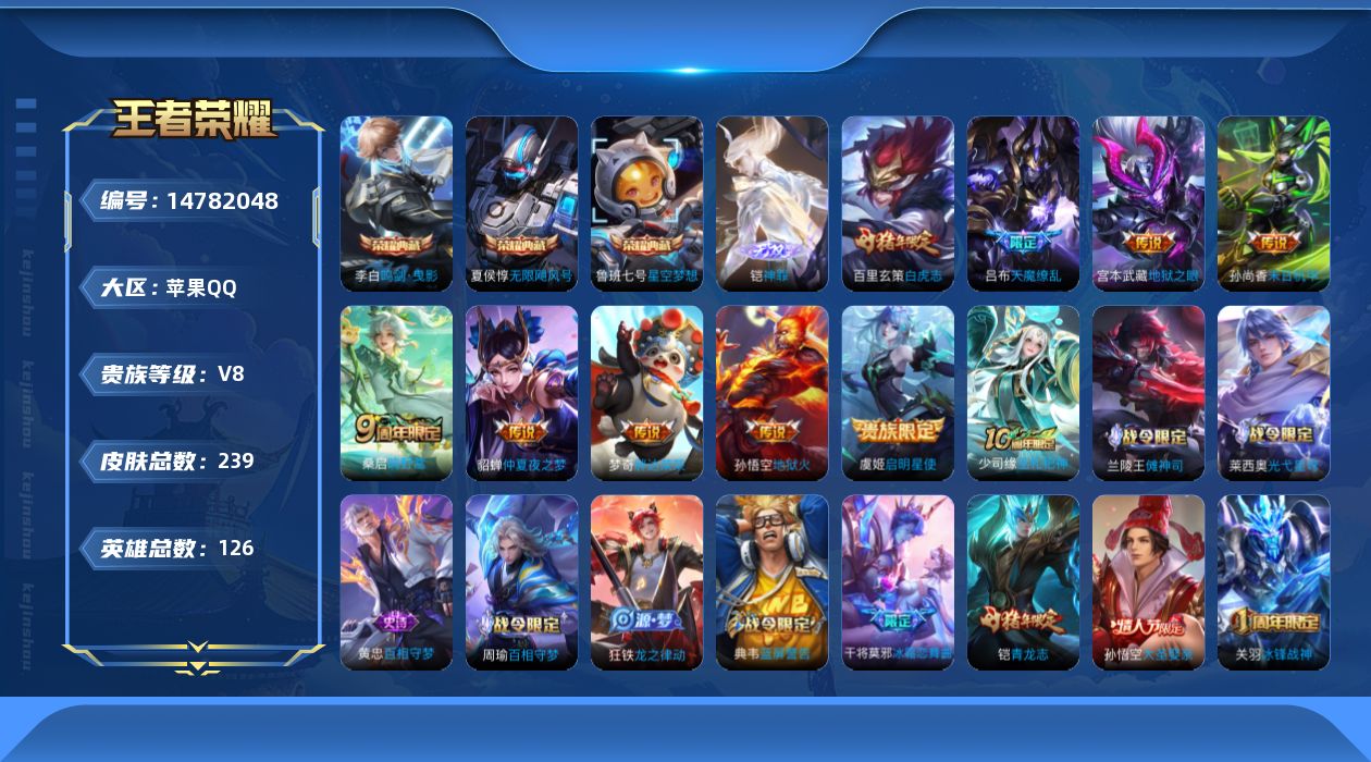v8 3典藏 1无双 10传说 126英雄 239皮肤 可修改实名 【稀有英雄】:大司命嬴政始皇帝韩信韩跳跳夏洛特夏师傅艾琳橘右京橘子娜可露露鸟人不知火舞赵云金蝉唐僧戈娅 【荣耀水晶】:鸣剑·曳影无限飓风号高达星空梦想太空人 【无双皮】:神罪
