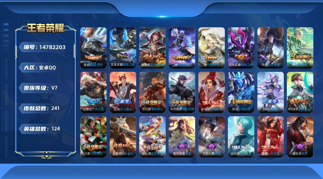 [14782203]v7-241皮肤-1典藏-7传说-78史诗,,,sa1025 【荣耀典藏】:李白鸣剑曳影 【内测皮肤】:嬴政优雅恋人,高渐离玩趣恶龙,狂铁特工战影,干将莫邪胡桃夹子 【传说皮肤】:宫本武藏地狱之眼,李信一念神魔,镜炽阳神光,裴擒虎寅虎赤拳,孙悟空齐天大圣,澜逐花归海,桑启鸣野蒿 【限定皮肤】:姜子牙天穹之誓,狄仁杰阴阳师,廉颇寅虎御盾,赵云皇家上将,嬴政优雅恋人,嬴政白昼王子,庄周高山流水,高渐离玩趣恶龙,芈月幻夜卜梦,元歌云间偶戏,马可波罗暗影游猎,马可波罗山海玄木吟,狄仁杰魔术师,狄仁杰万华元夜,达摩星际陆战队,达摩沙漠行僧,项羽海滩派对,老夫子醍醐杖,关羽冰锋战神,程咬金演武夺筹,露娜一生所爱,韩信逐梦之影,王昭君午后时光,兰陵王金庭之子,亚瑟潮玩骑士王,孙悟空大圣娶亲,孙悟空齐天大圣,李元芳云中旅人,钟馗驱傩正仪,杨玉环遇见飞天,干将莫邪胡桃夹子,干将莫邪真爱魔法,雅典娜黎明之约,蔡文姬繁星吟游,鬼谷子原初探秘者,鬼谷子五谷丰年,黄忠火炮绅士,苏烈千军破阵,百里玄策原初追逐者,百里守约朱雀志,梦奇顽趣,沈梦溪大漠名商,裴擒虎李小龙,裴擒虎寅虎赤拳,裴擒虎擒涛扼浪,狂铁电玩高手,米莱狄胡桃异想国,云中君纤云弄巧,云中君时之祈愿,猪八戒西部大镖客,上官婉儿梁祝,嫦娥拒霜思,鲁班大师探海日志,镜匿光追影者,桑启海盐诗旅,艾琳流音漫舞,司空震地狱燃心,阿古朵江河有灵,张良古海寻踪,蒙犽百解令,蒙恬荣光圣徽,高渐离燃音魔法,妲己灵卜魔法,鬼谷子天穹祈灯,伽罗琥珀纪元,姬小满妄想食味,沈梦溪龙舞盛年,鲁班七号蔬乡物语,李元芳蔬乡物语,刘邦剑破天穹,程咬金群星魔术团,刘备异域游侠 【年限皮肤】:百里守约朱雀志,裴擒虎寅虎赤拳,廉颇寅虎御盾,马可波罗山海玄木吟 【赛季限定】:狄仁杰万华元夜,达摩沙漠行僧,老夫子醍醐杖,程咬金演武夺筹,兰陵王金庭之子,张良古海寻踪,李元芳云中旅人,钟馗驱傩正仪,雅典娜黎明之约,鬼谷子原初探秘者,苏烈千军破阵,百里玄策原初追逐者,梦奇顽趣,沈梦溪大漠名商,裴擒虎擒涛扼浪,鲁班大师探海日志,桑启海盐诗旅,鬼谷子天穹祈灯,蒙恬荣光圣徽,刘邦剑破天穹,姜子牙天穹之誓 【战令限定】:嬴政白昼王子,芈月幻夜卜梦,元歌云间偶戏,马可波罗暗影游猎,达摩星际陆战队,王昭君午后时光,艾琳流音漫舞,亚瑟潮玩骑士王,干将莫邪真爱魔法,黄忠火炮绅士,狂铁电玩高手,米
