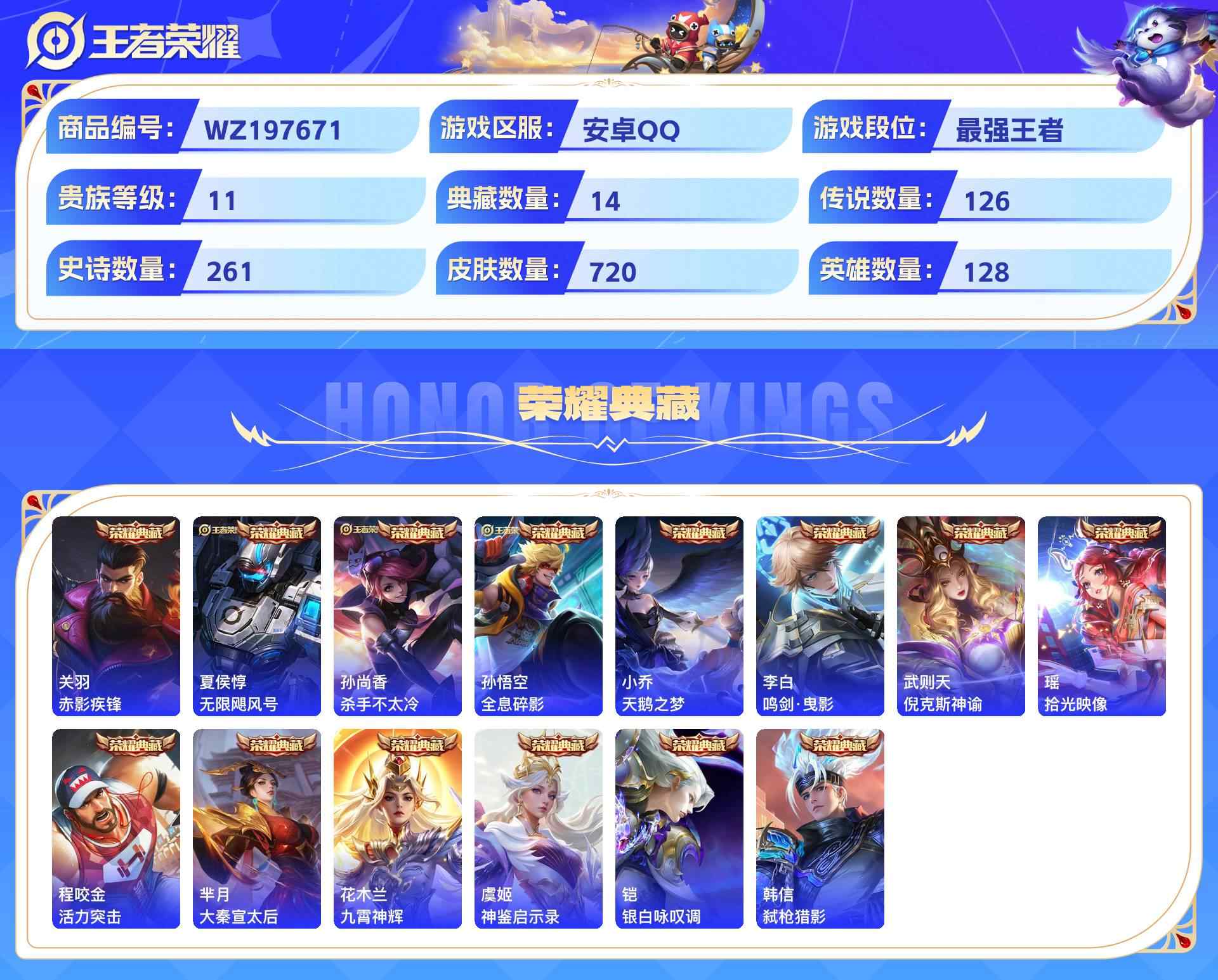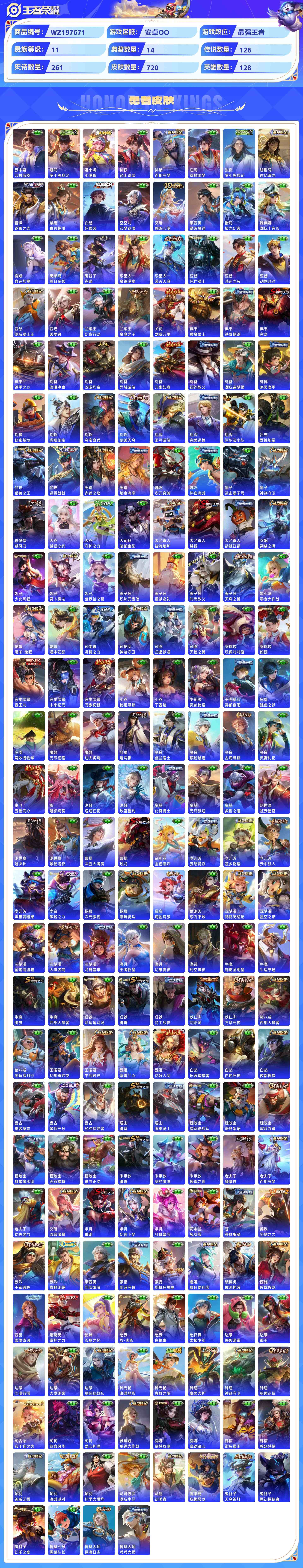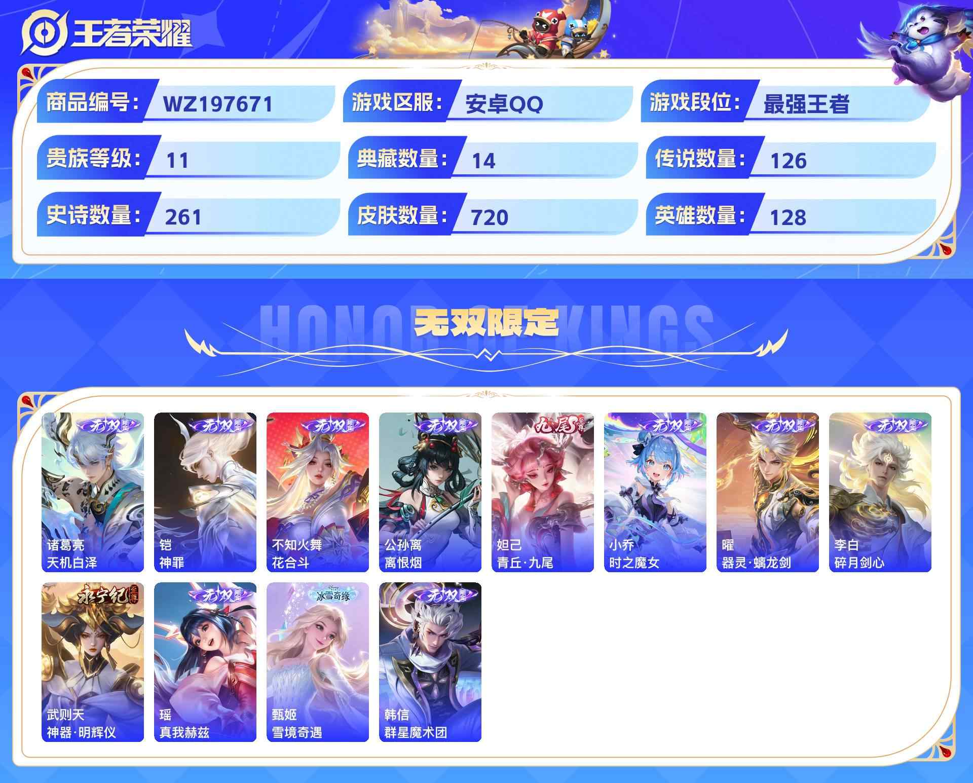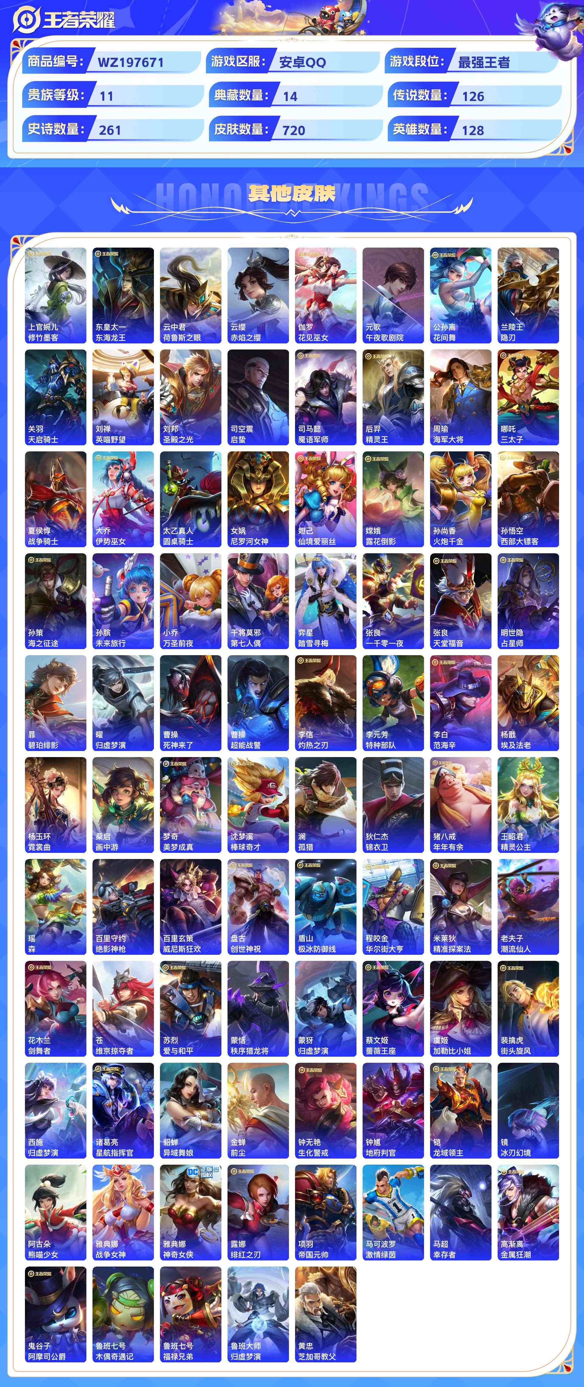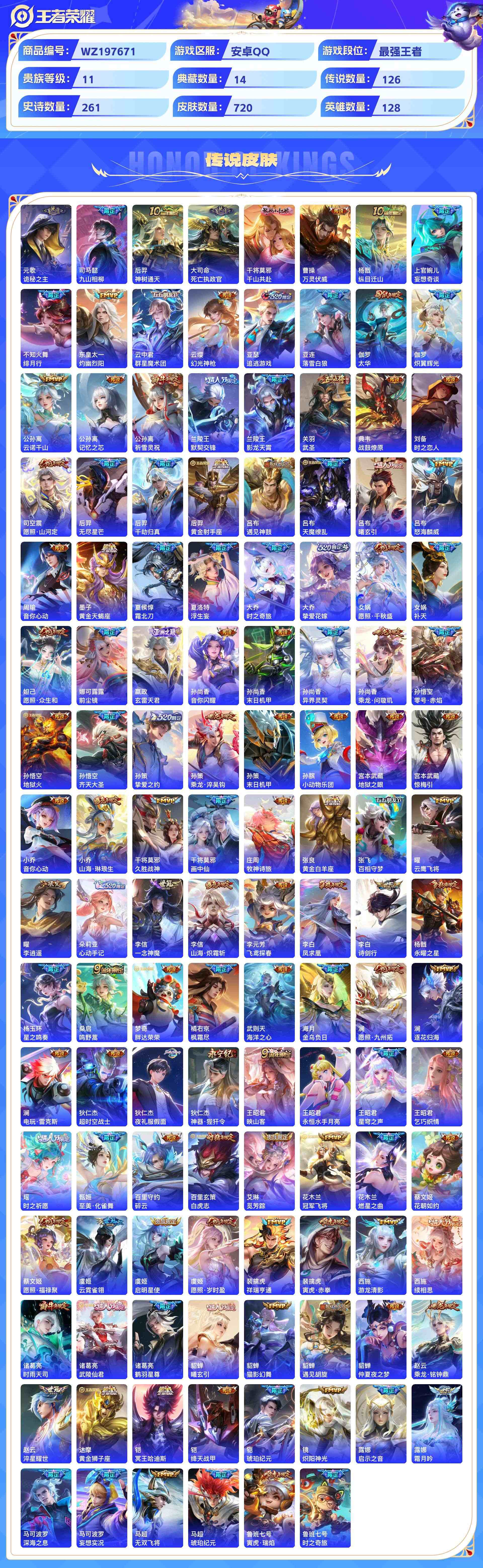 wz197671|极品无双贵族号安卓qq 贵族11级720皮 1珍品无双 (馥梦繁花)14典藏 (赤影疾锋无限飓风号杀手不太冷)9珍品传说 (满珍品传说)12无双 (满无双)126传说(诡秘之主九山相柳神树通天死亡执政官千山共赴) 261史诗7星传说58个性按键4天幕1小兵皮肤