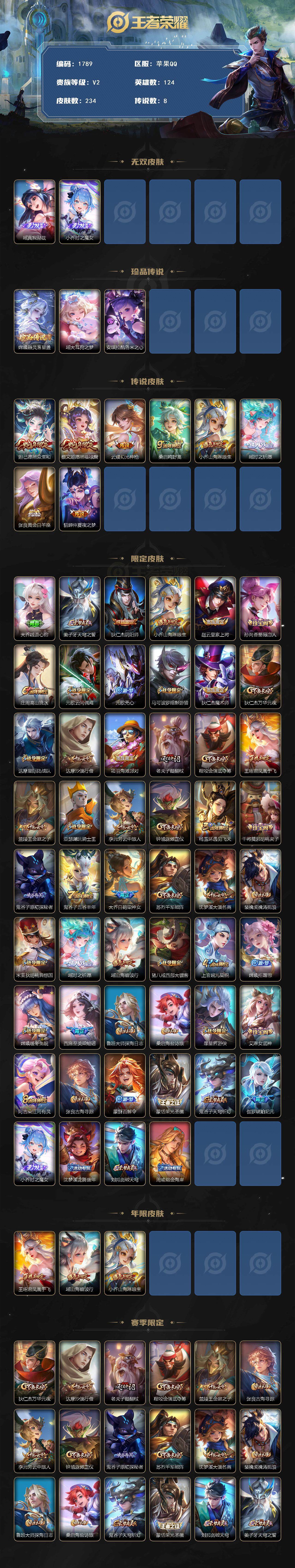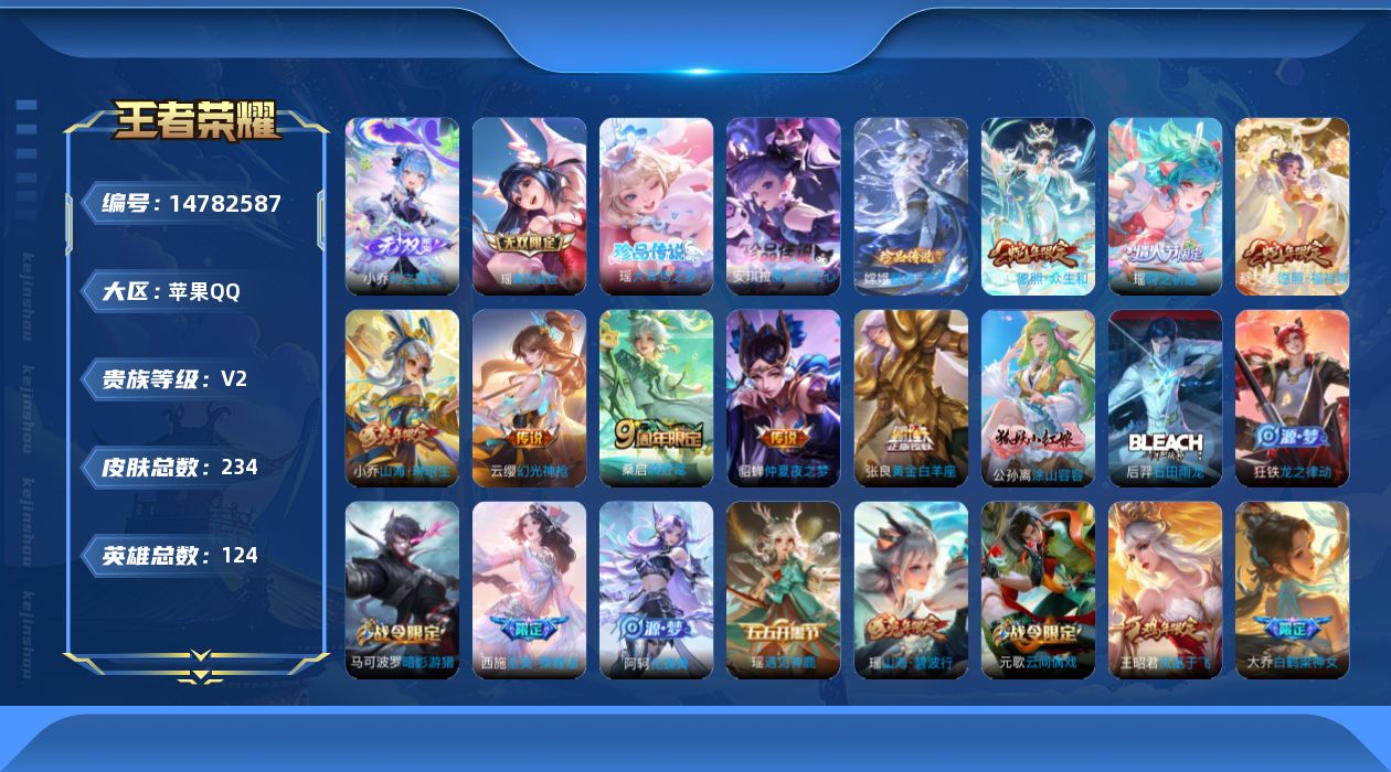 [14782587]可二次 女号 财神纳福天幕 贵族7-234皮0典藏8传说2无双3珍品传说 苹果手q117区234皮0典藏8传说2无双3珍品传说v2 营地id1851013921永恒钻石iii【珍品传说皮肤】:酷洛米之心大耳狗之梦器灵·落星盏【无双皮肤】:时之魔女瑶真我赫兹【优质限定皮肤】:山海·琳琅生瑶时之祈愿【传说皮肤】:黄金白羊座愿照·众生和幻光神呛愿照·福禄聚山海·琳琅