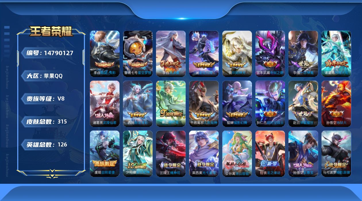 v8 2典藏 15传说 126英雄 315皮肤 可修改实名 【英雄全皮】:蒙恬全皮蚩奼全皮阿轲全皮影全皮 【稀有英雄】:大司命嬴政始皇帝韩信韩跳跳夏洛特夏师傅艾琳橘右京橘子娜可露露鸟人不知火舞赵云金蝉唐僧戈娅 【荣耀水晶】:鸣剑·曳影星空梦想太