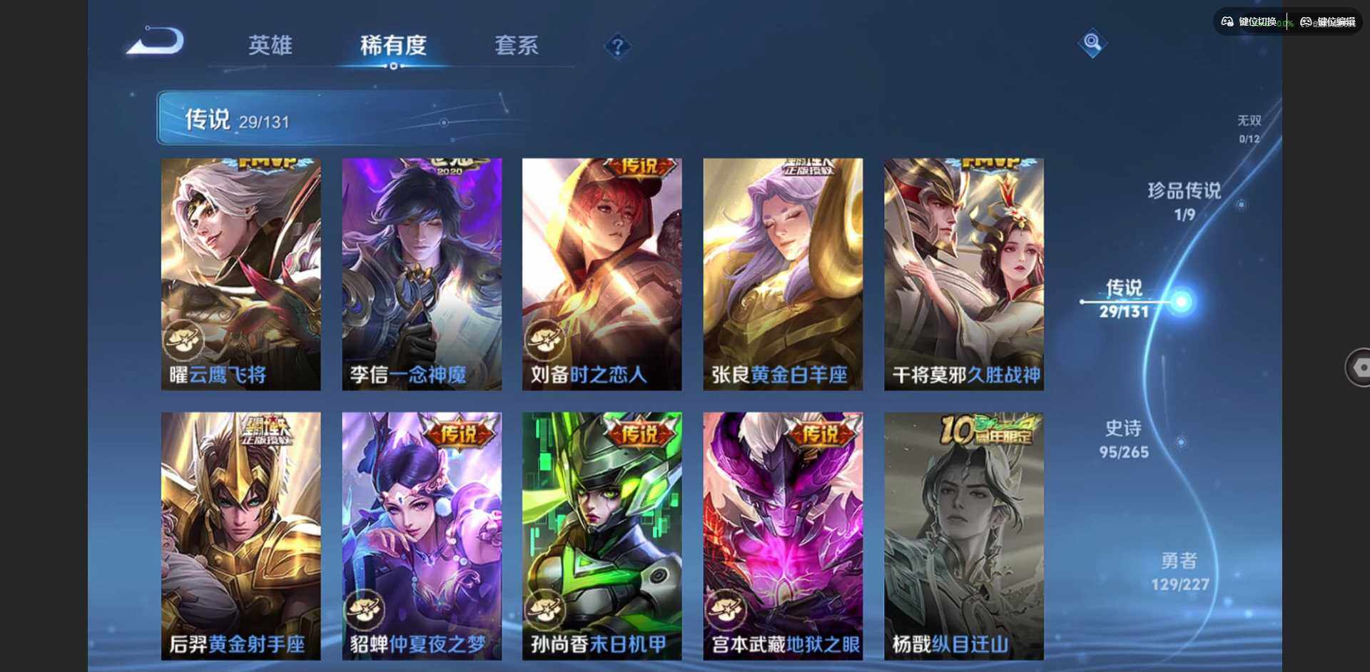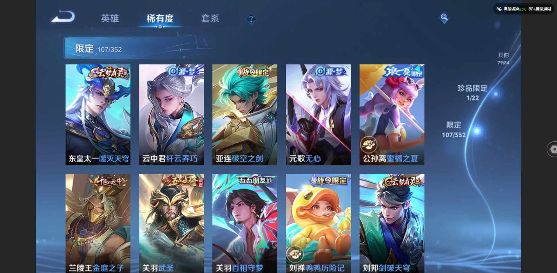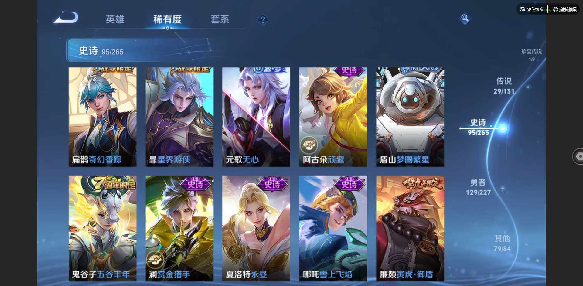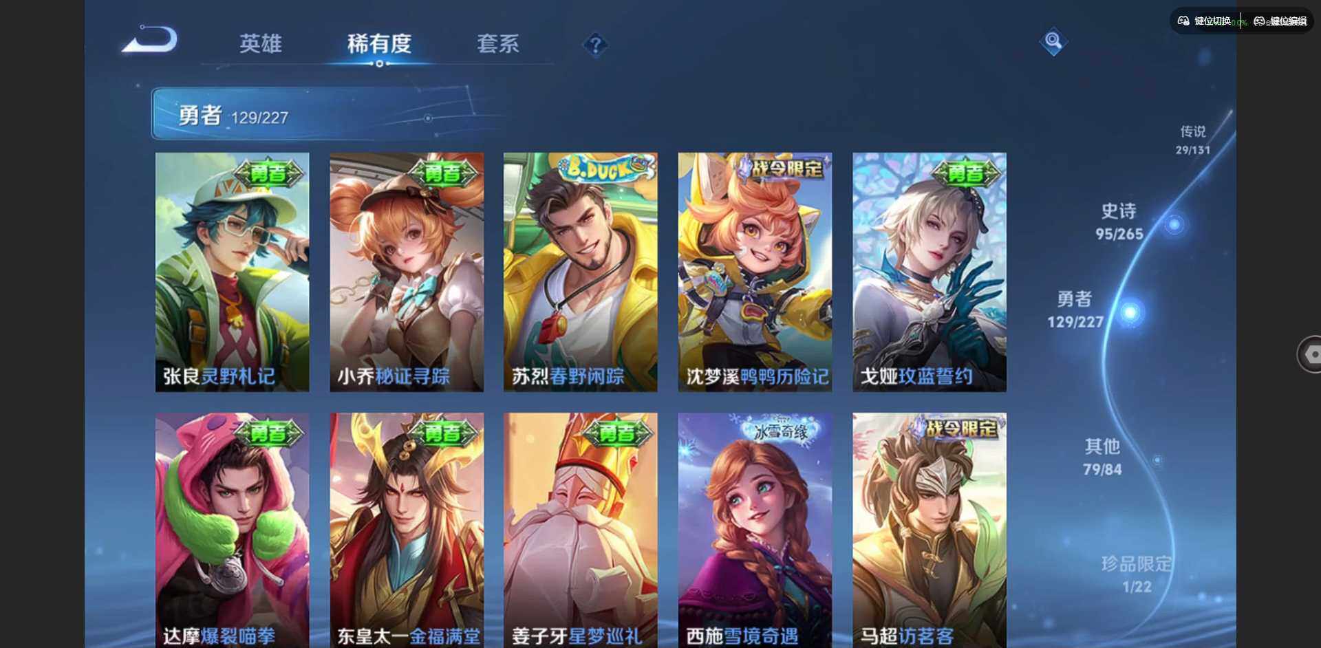2319787-贵族等级: v8 英雄数: 126 皮肤数: 334 荣耀水晶: 鸣剑·曳影 珍品传说: 兔狲·蓬尾 传说皮: 黄金射手座云鹰飞将黄金白羊座久胜战神炽阳神光一念神魔末日机甲-孙尚香仲夏夜之梦地狱之眼乞巧织情时之恋人-刘备游龙清影淬星耀世挚爱之约山海·琳琅生灼幽烈阳遇见神鼓牧神诗旅 限定皮: 遇见飞天李小龙游园惊梦御风骁将龙胆武圣蜜