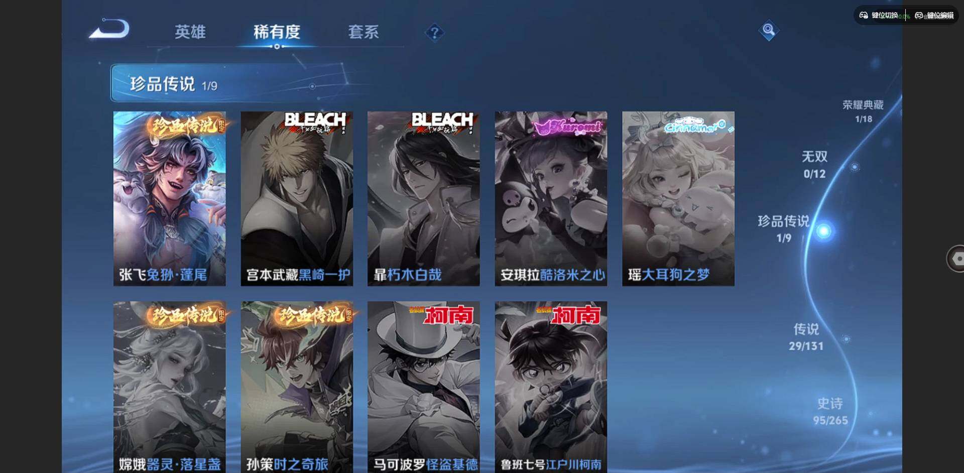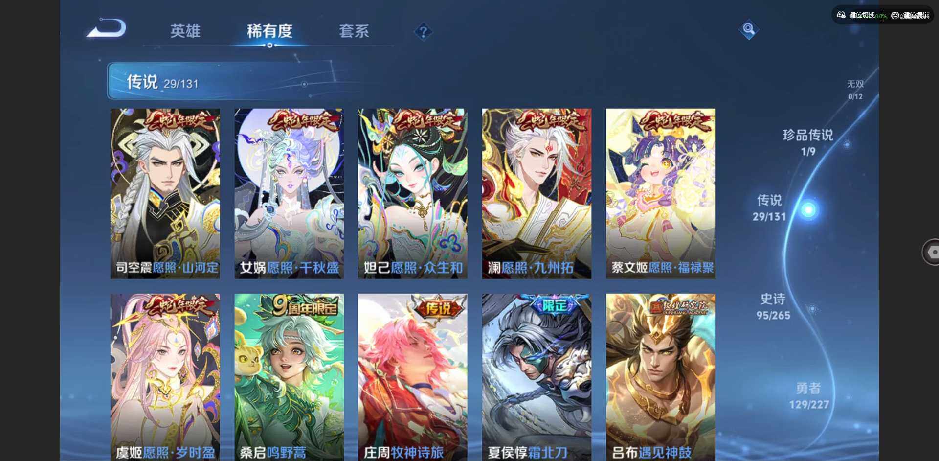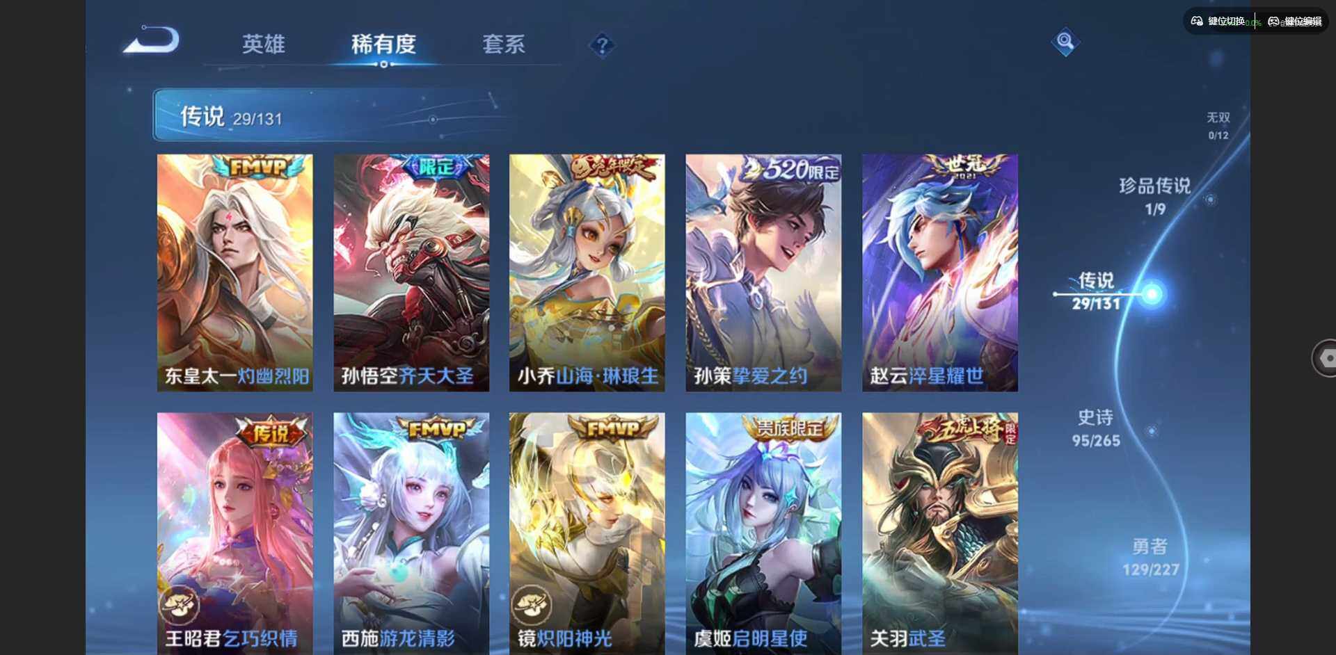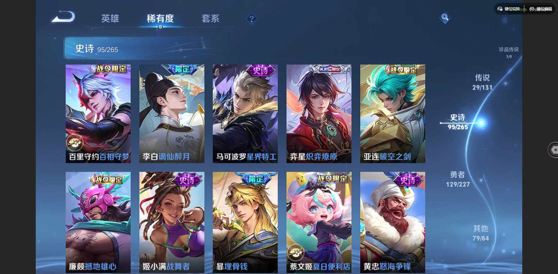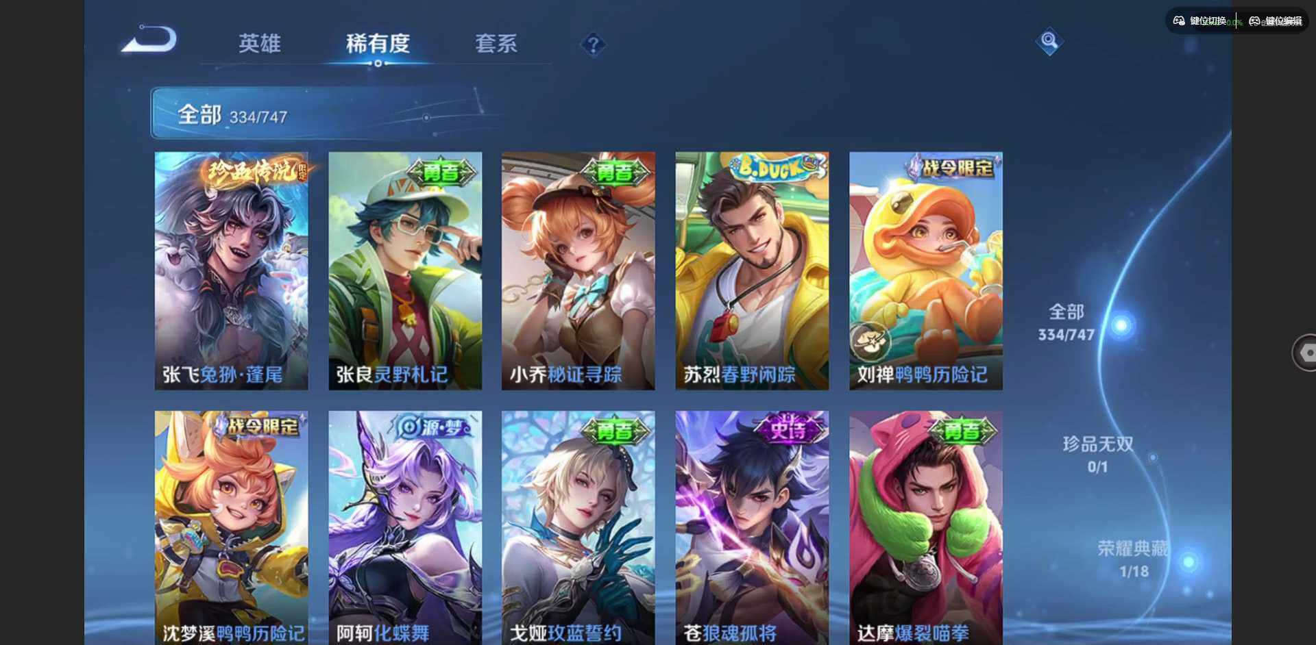2319787-贵族等级: v8 英雄数: 126 皮肤数: 334 荣耀水晶: 鸣剑·曳影 珍品传说: 兔狲·蓬尾 传说皮: 黄金射手座云鹰飞将黄金白羊座久胜战神炽阳神光一念神魔末日机甲-孙尚香仲夏夜之梦地狱之眼乞巧织情时之恋人-刘备游龙清影淬星耀世挚爱之约山海·琳琅生灼幽烈阳遇见神鼓牧神诗旅 限定皮: 遇见飞天李小龙游园惊梦御风骁将龙胆武圣蜜